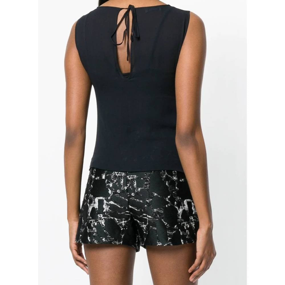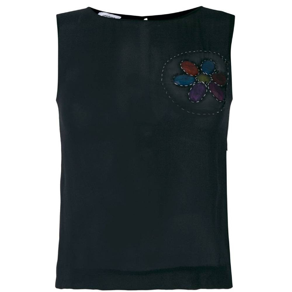 Moschino black silk tank top with embroidered and fringed decorative appliqué on the chest. Round neck, sleeveless, with strings fastening on the back.