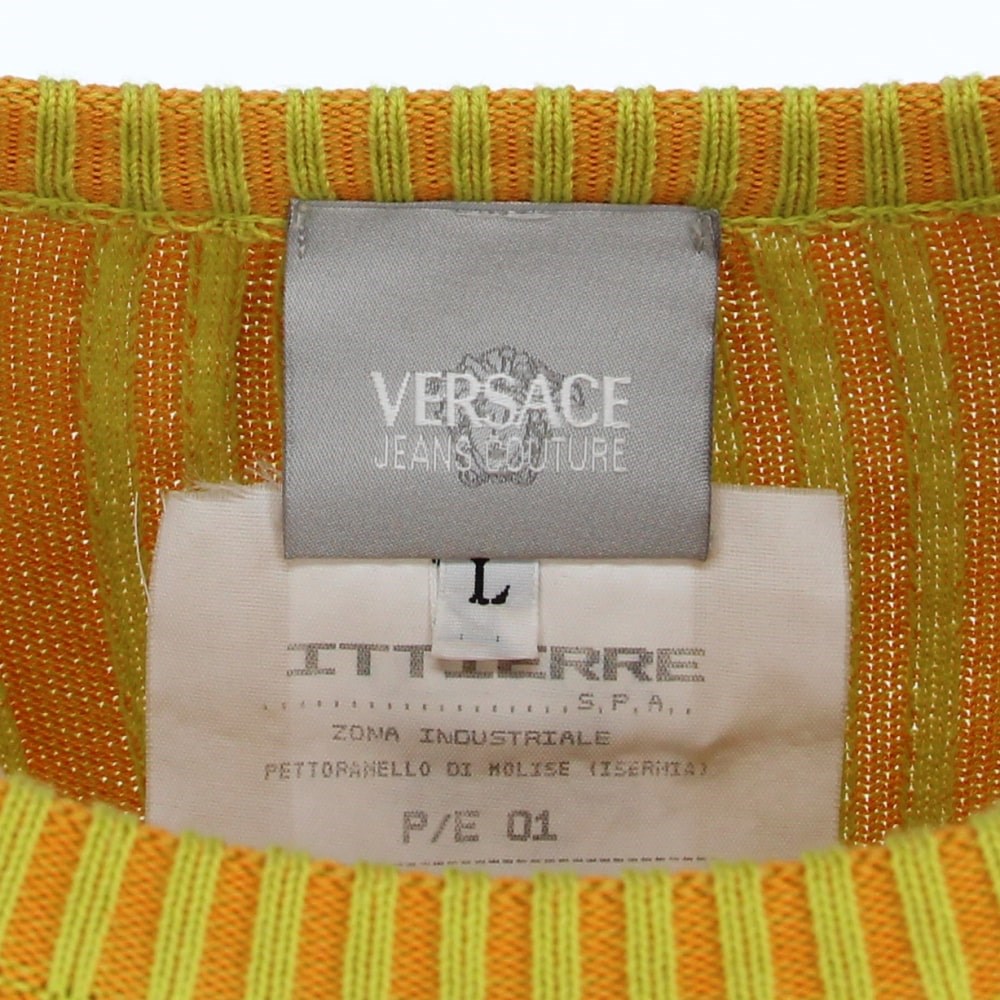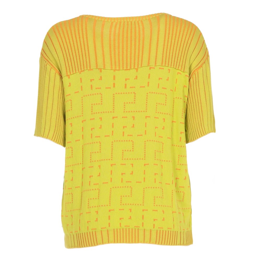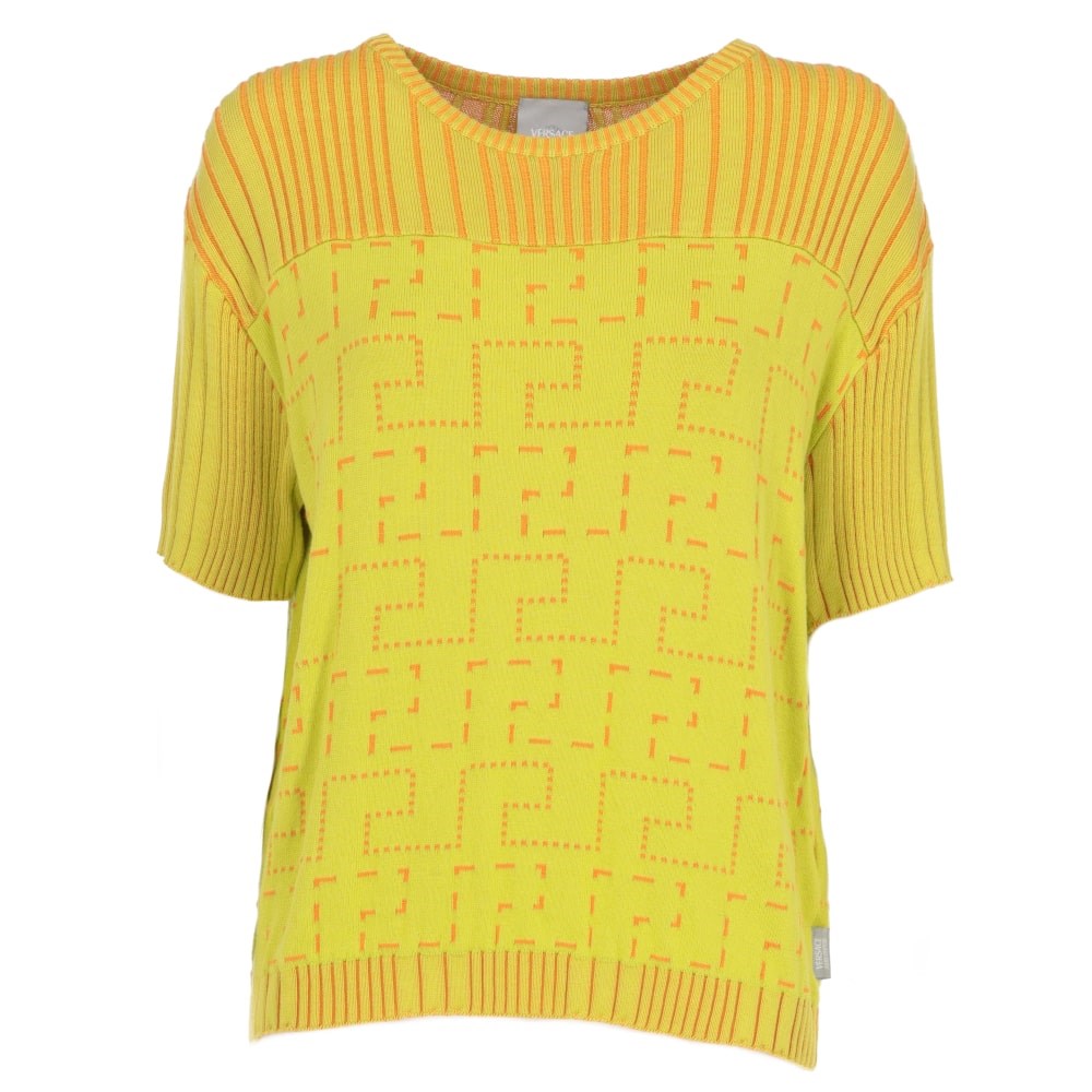 Versace Jeans Couture acid yellow knitted short-sleeved top with orange motif, year 2001. Ribbed crew neck, chest, sleeves and bottom.