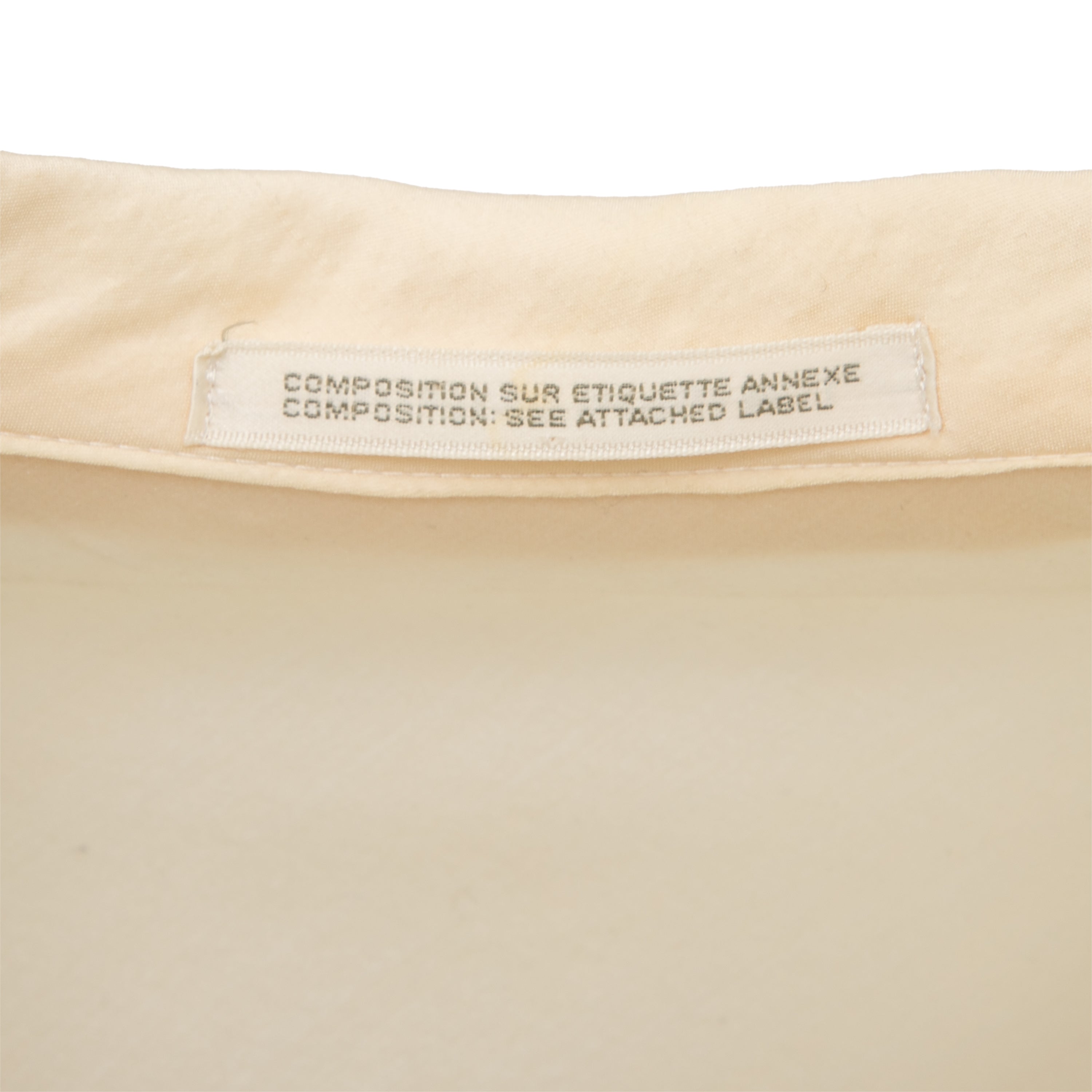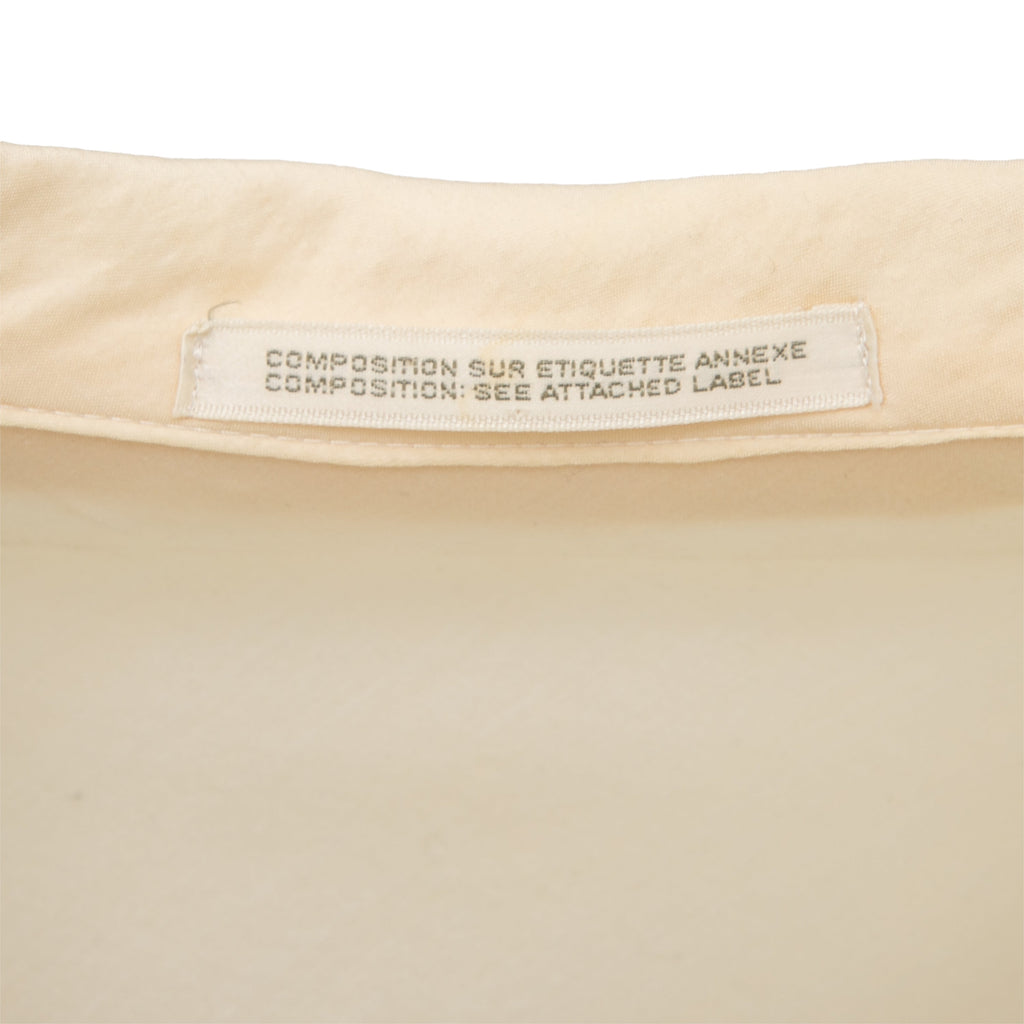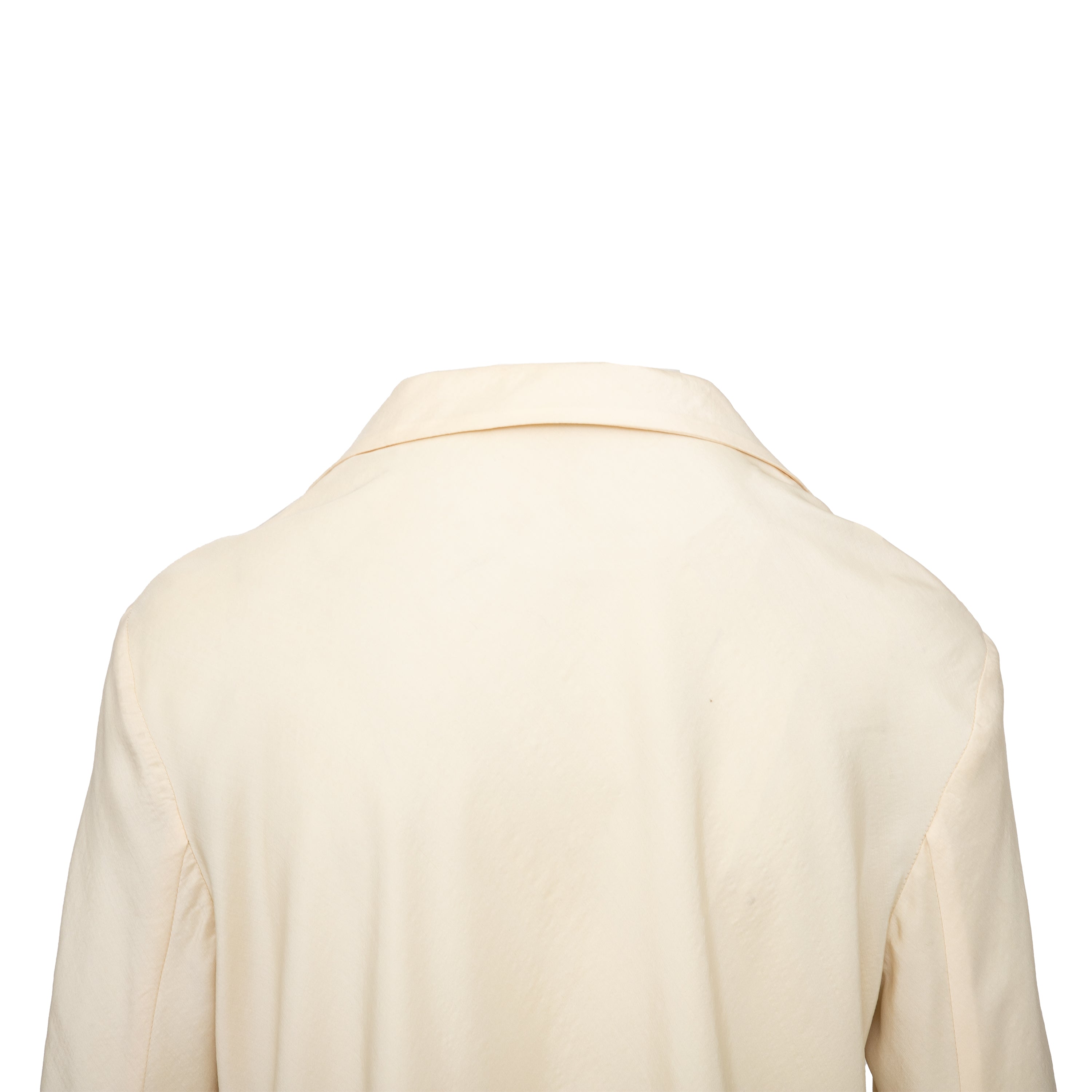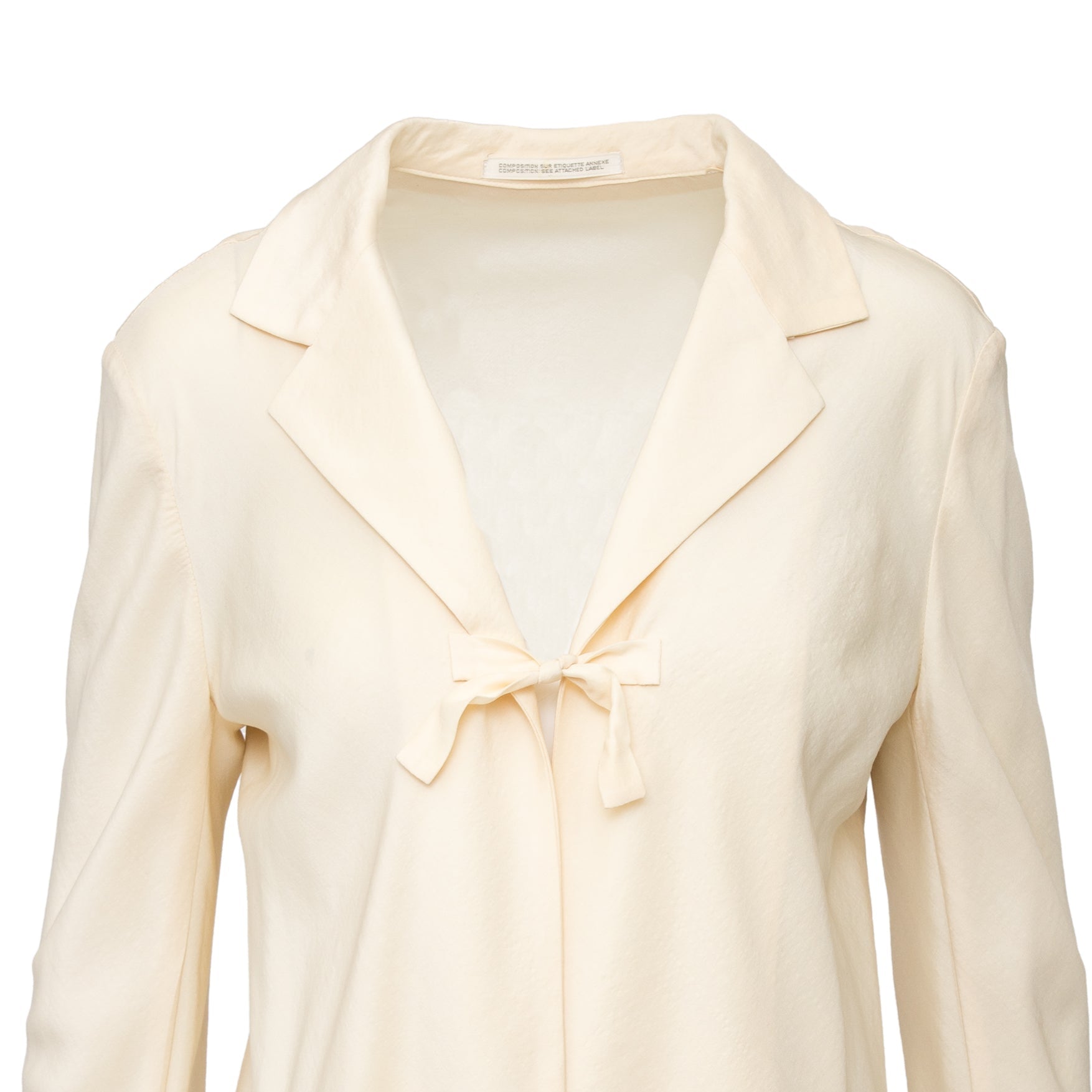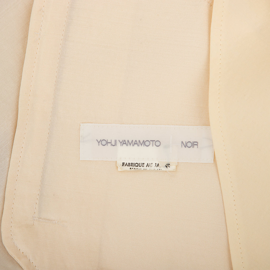 Classic and effortless, this off-white silk shirt from iconic designer Yohji Yamamoto features a loose fit and open front with a tie-knot. The lapel collar and folded cuffs provides a polished look, while the subtle graphic embroidery adds a touch of elegance.