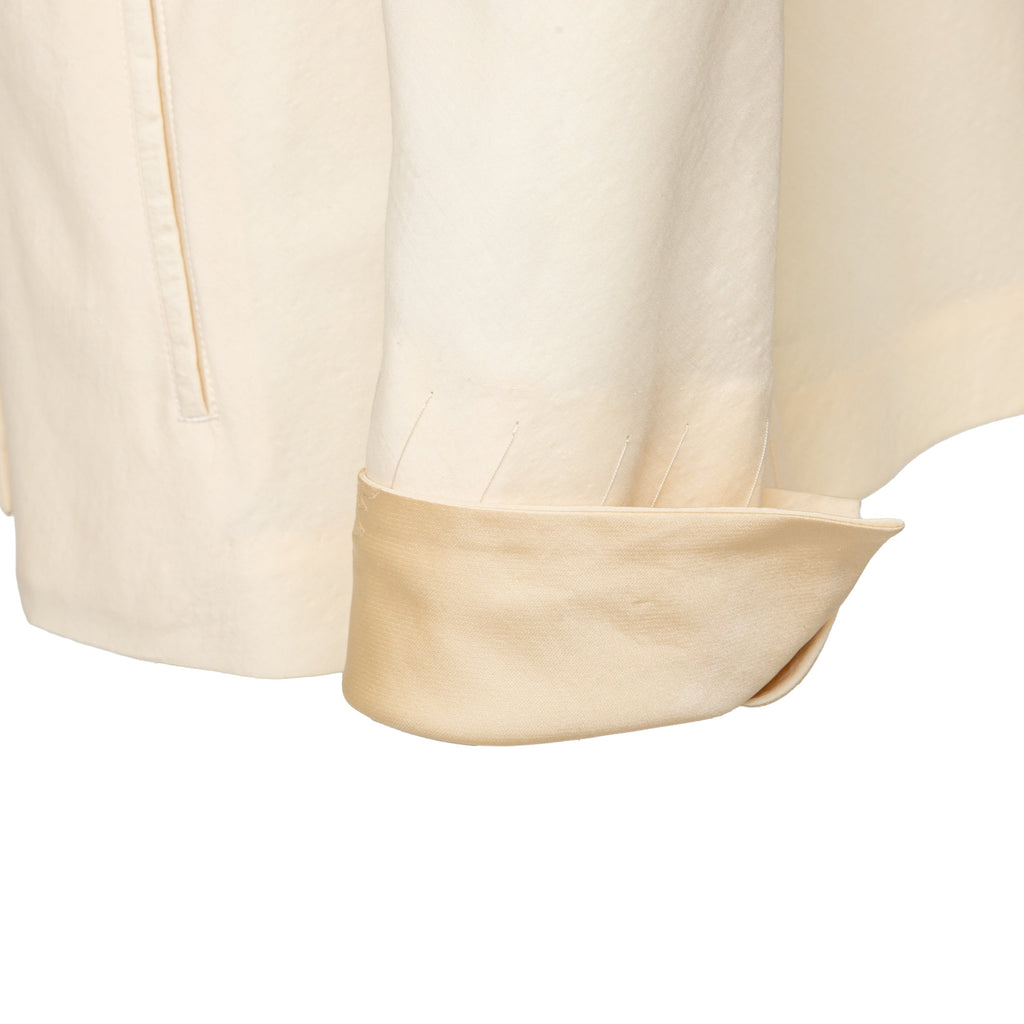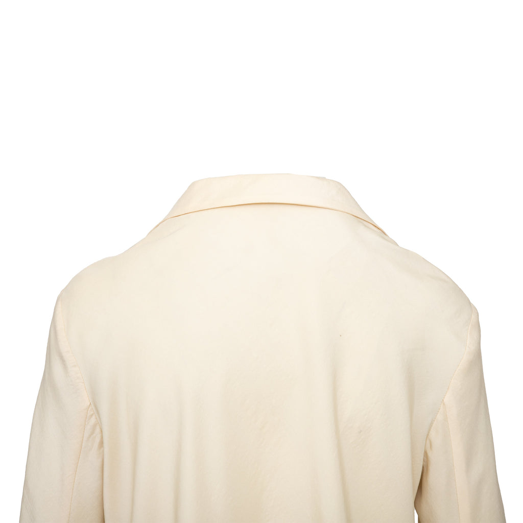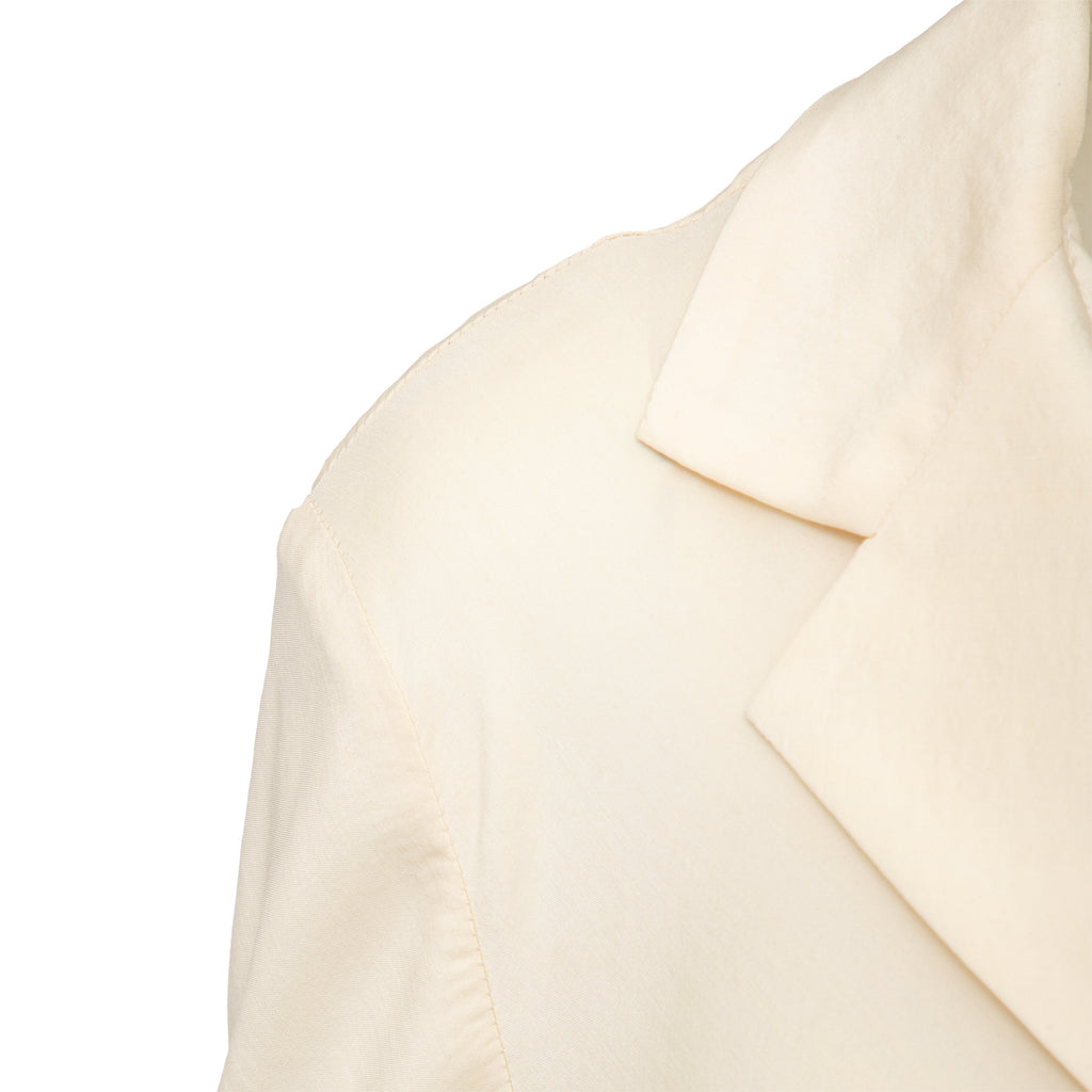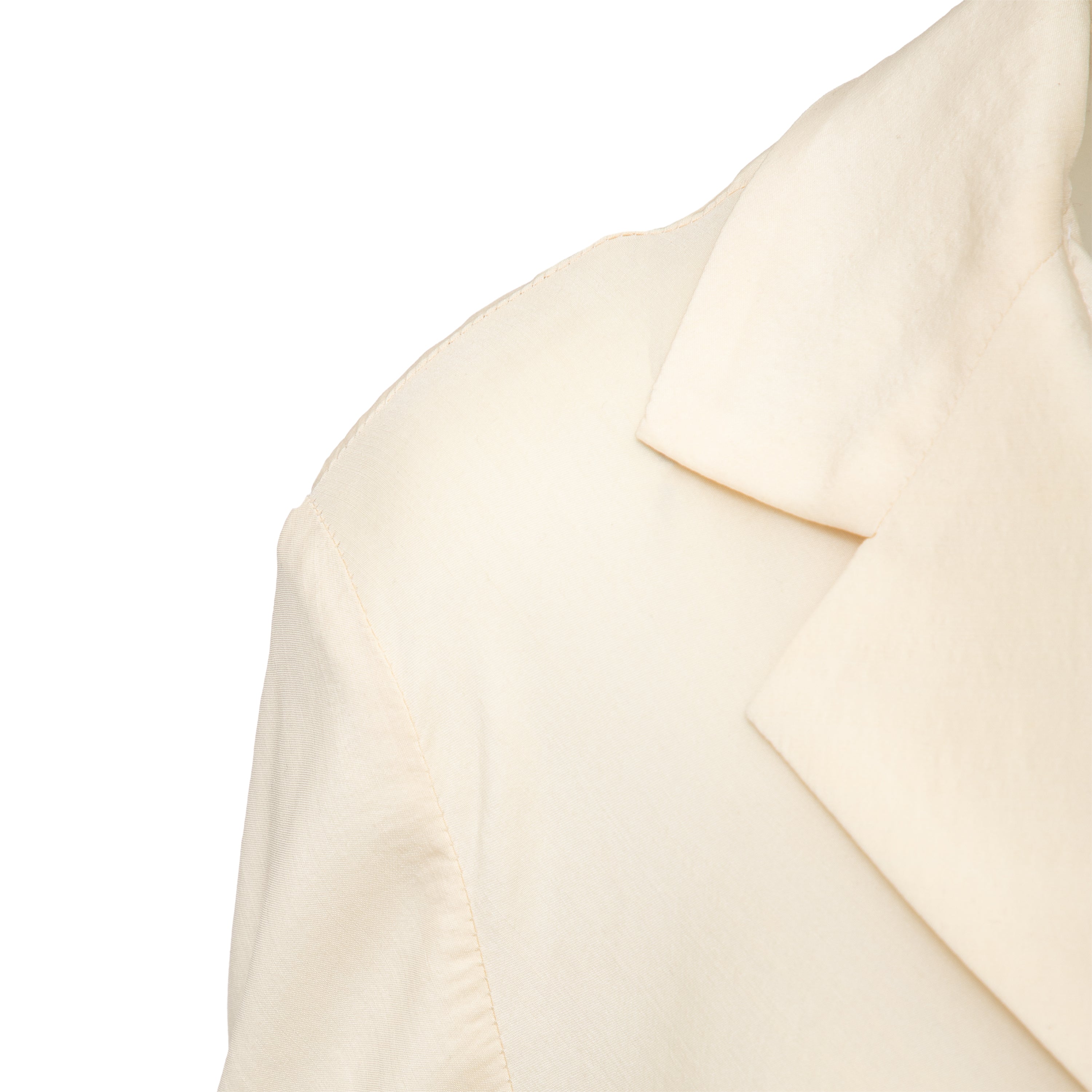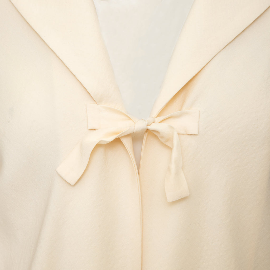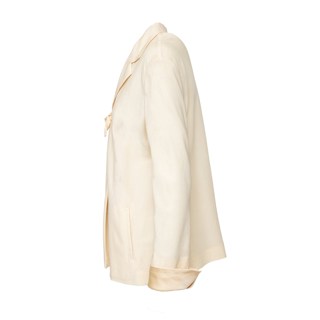 Classic and effortless, this off-white silk shirt from iconic designer Yohji Yamamoto features a loose fit and open front with a tie-knot. The lapel collar and folded cuffs provides a polished look, while the subtle graphic embroidery adds a touch of elegance.