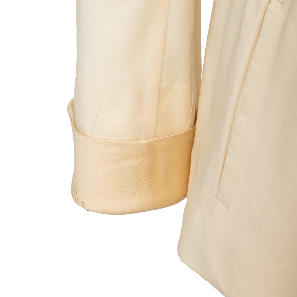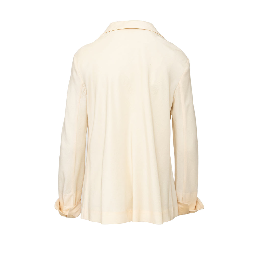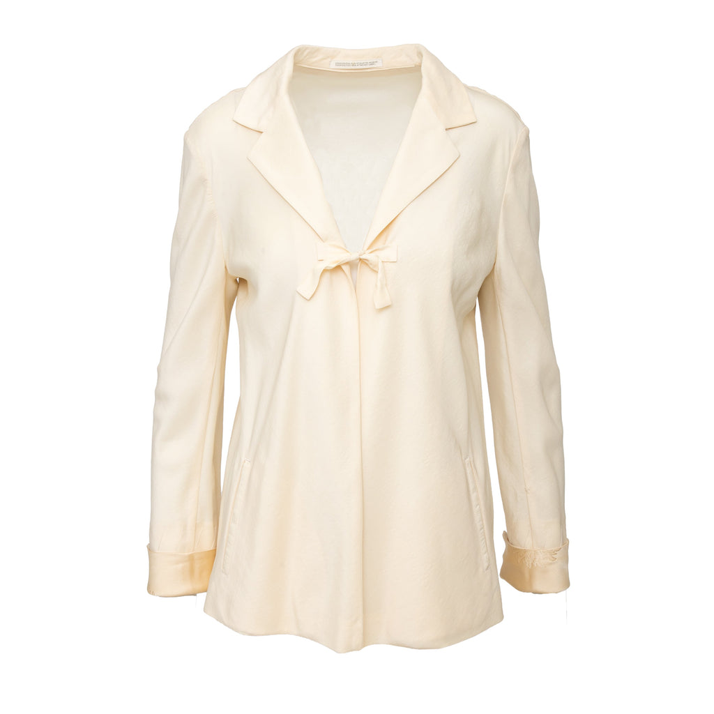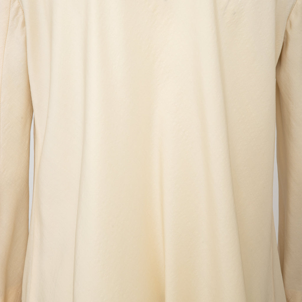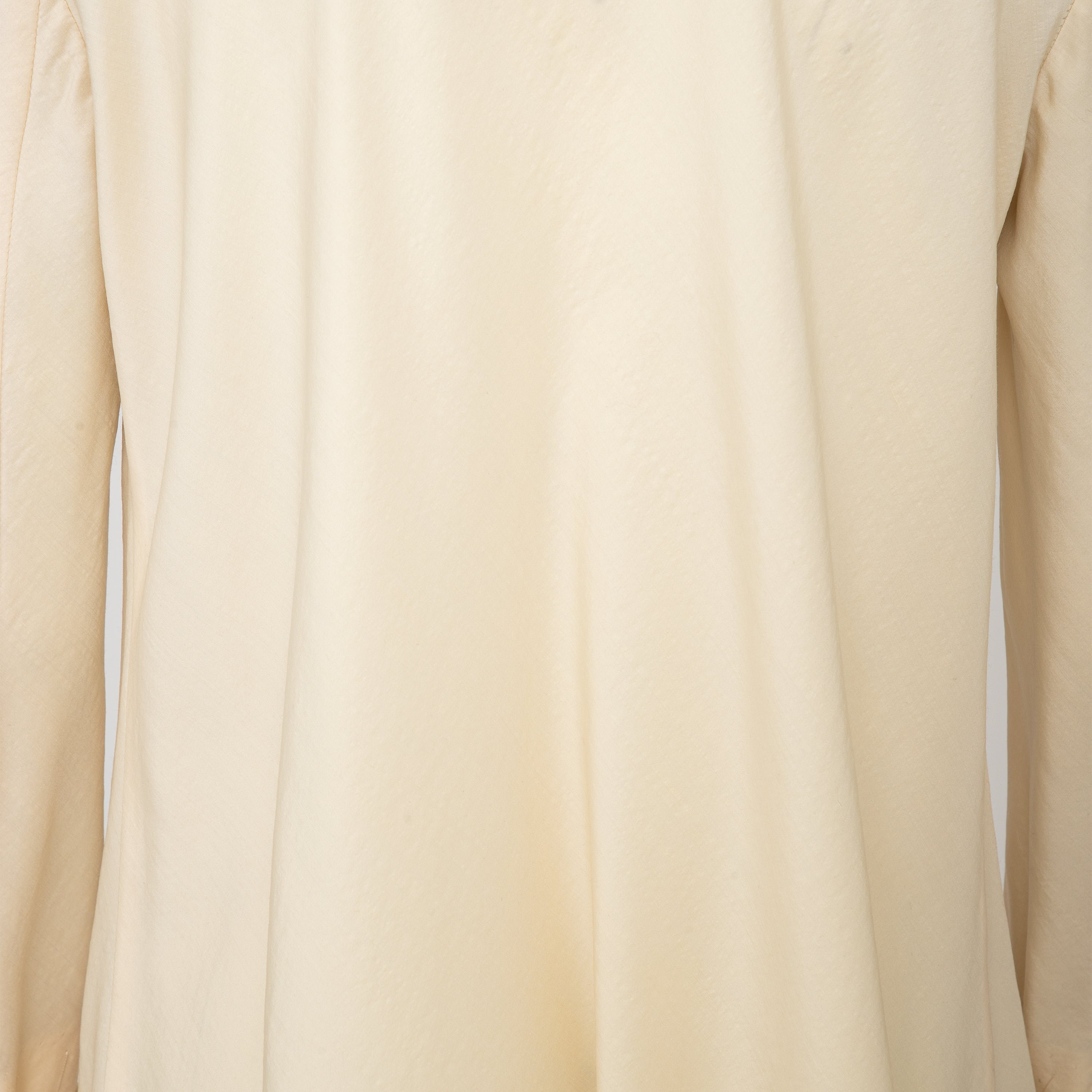 Classic and effortless, this off-white silk shirt from iconic designer Yohji Yamamoto features a loose fit and open front with a tie-knot. The lapel collar and folded cuffs provides a polished look, while the subtle graphic embroidery adds a touch of elegance.