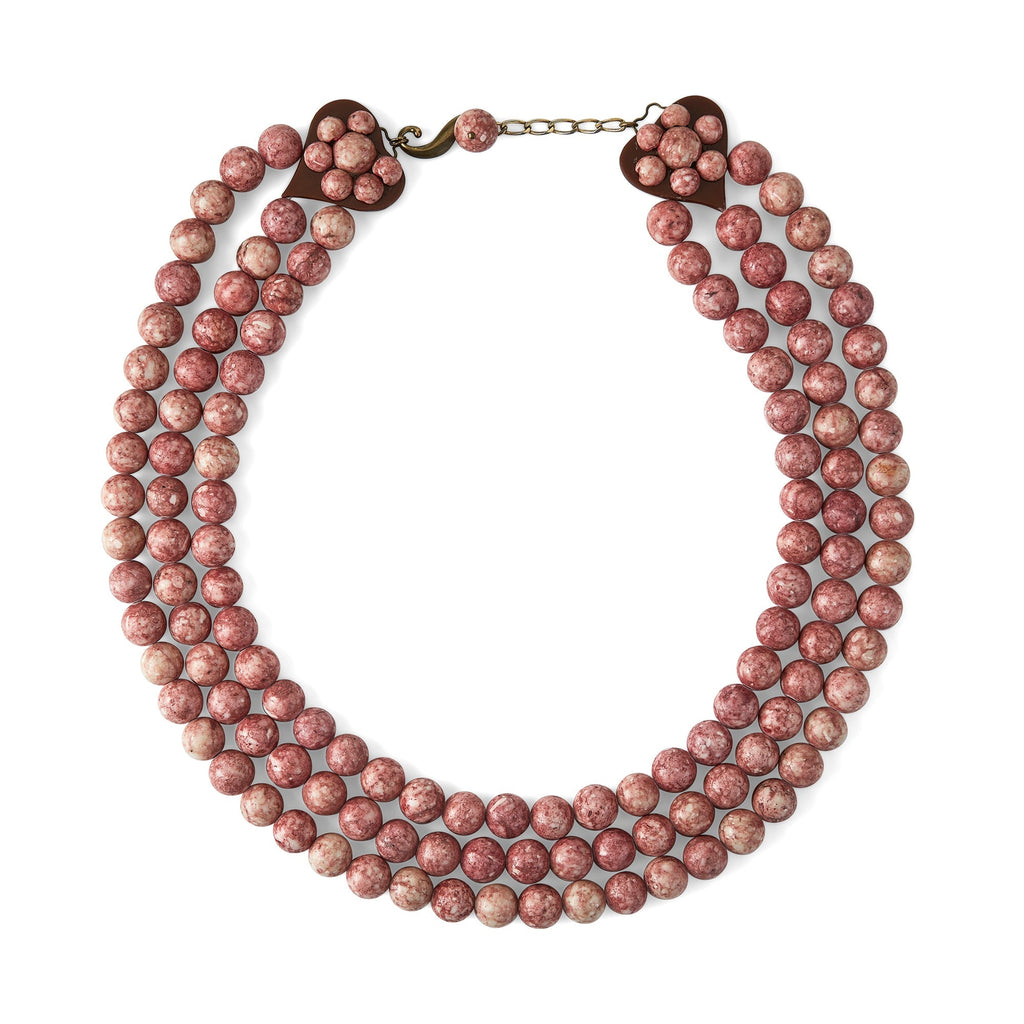 This rare 1980s Yves Saint Laurent triple strand necklace was made for a haute couture collection by Maison Martine Boutron. Of pink marbled stone beads, the stand-out detailing of this necklace are the two perspex hearts in chocolate brown. These sit next to the clasp and are adorned with clusters of the pink marbled beads. The fastening is an elaborate take on an S-clasp; rendered in brass which attaches to a twist chain which ends in a single pink bead. In excellent vintage condition with no flaws. Unlabelled as almost all the Maison's designs for the house were.