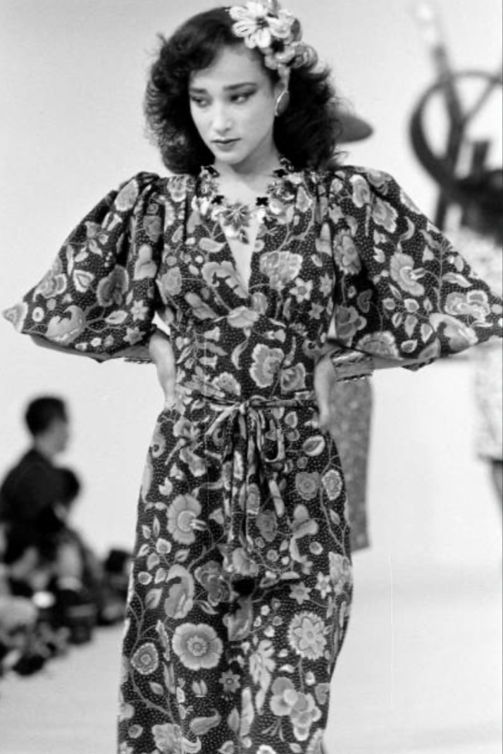 1983 Runway Saint Laurent Floral and Polka-Dot Bell-Sleeve Silk Dress