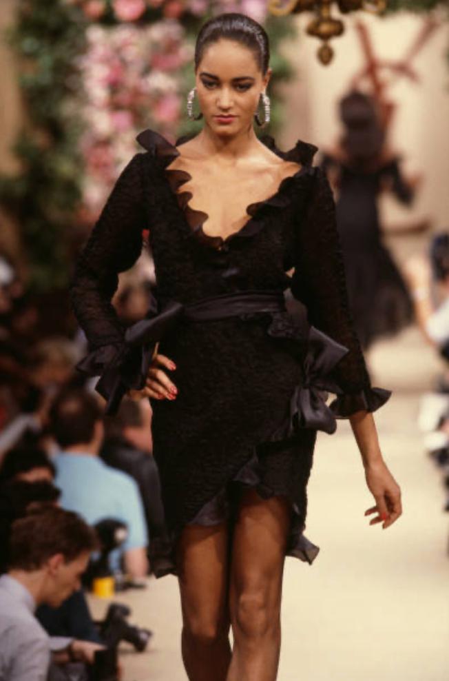 This well documented dress was part of Yves Saint Laurent’s much sought after Spring 1987 collection, when Yves himself was still at the helm of his eponymous fashion house. The fabric is stunning with its innovative, crinkled texture that is oh-so-’80s. The body has a relaxed fit, falling straight in a column style to the bottom hem. The hem, cuffs and wide-neckline are trimmed with wide ruffles. Made of black taffeta, they hold their shape and add drama to the silhouette. The sleeves are cut to a three-quarter length, perfect for showing-off the wrists or stacked bracelets. The wide neckline adds sensuous detail, as does the thigh-high slit in the skirt, christened at the top with a large taffeta bow. This flamboyant dress is unlined. It fastens with a hidden tonal zip under the left arm. A great choice for an elegant evening event and can be well accessorised - the runway showed this belted.