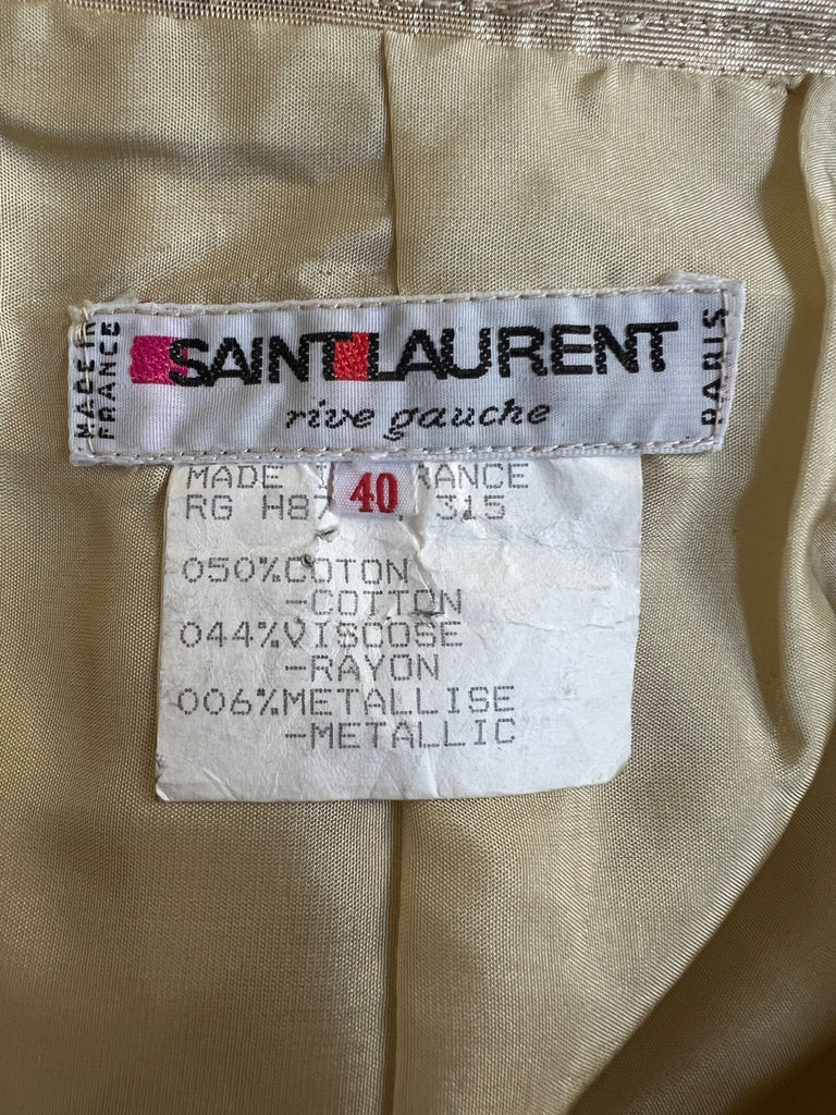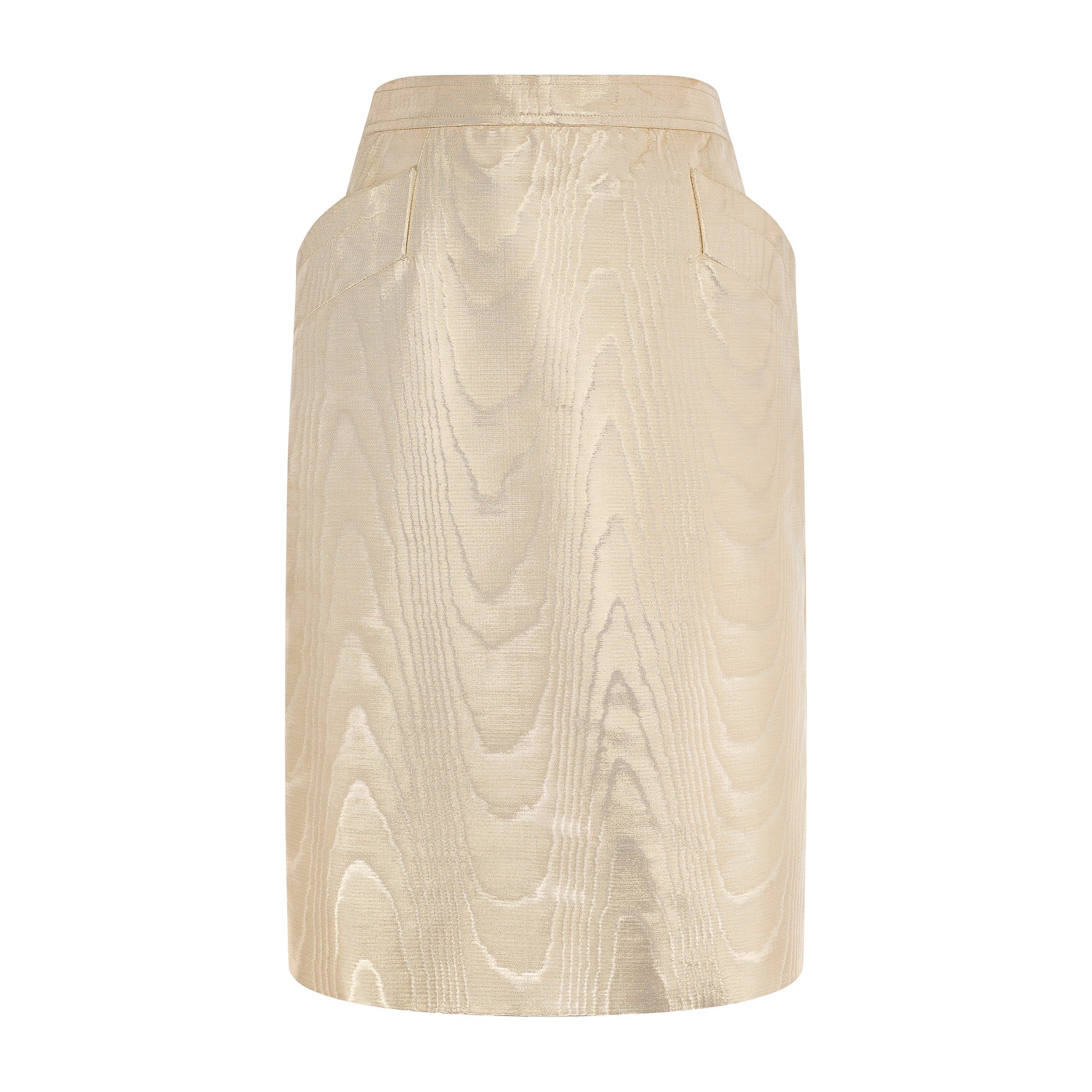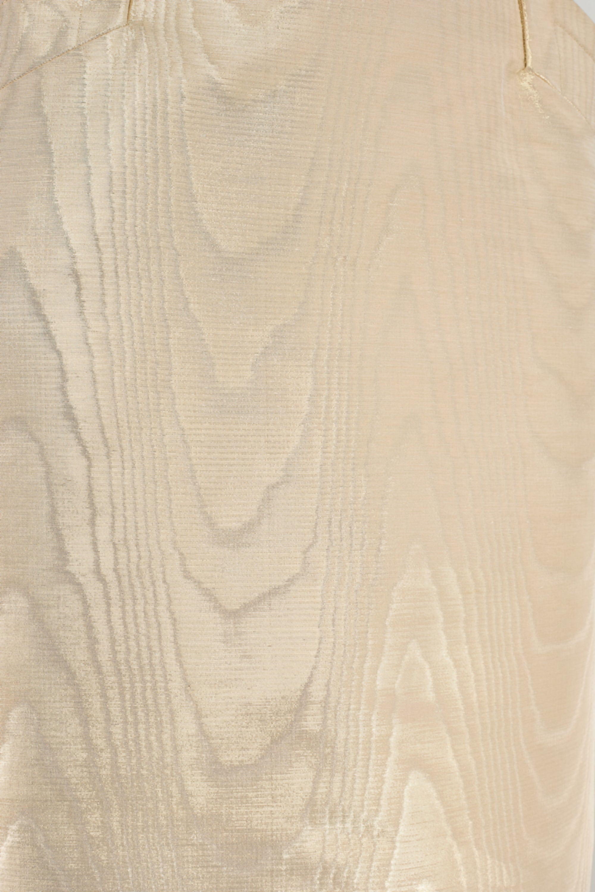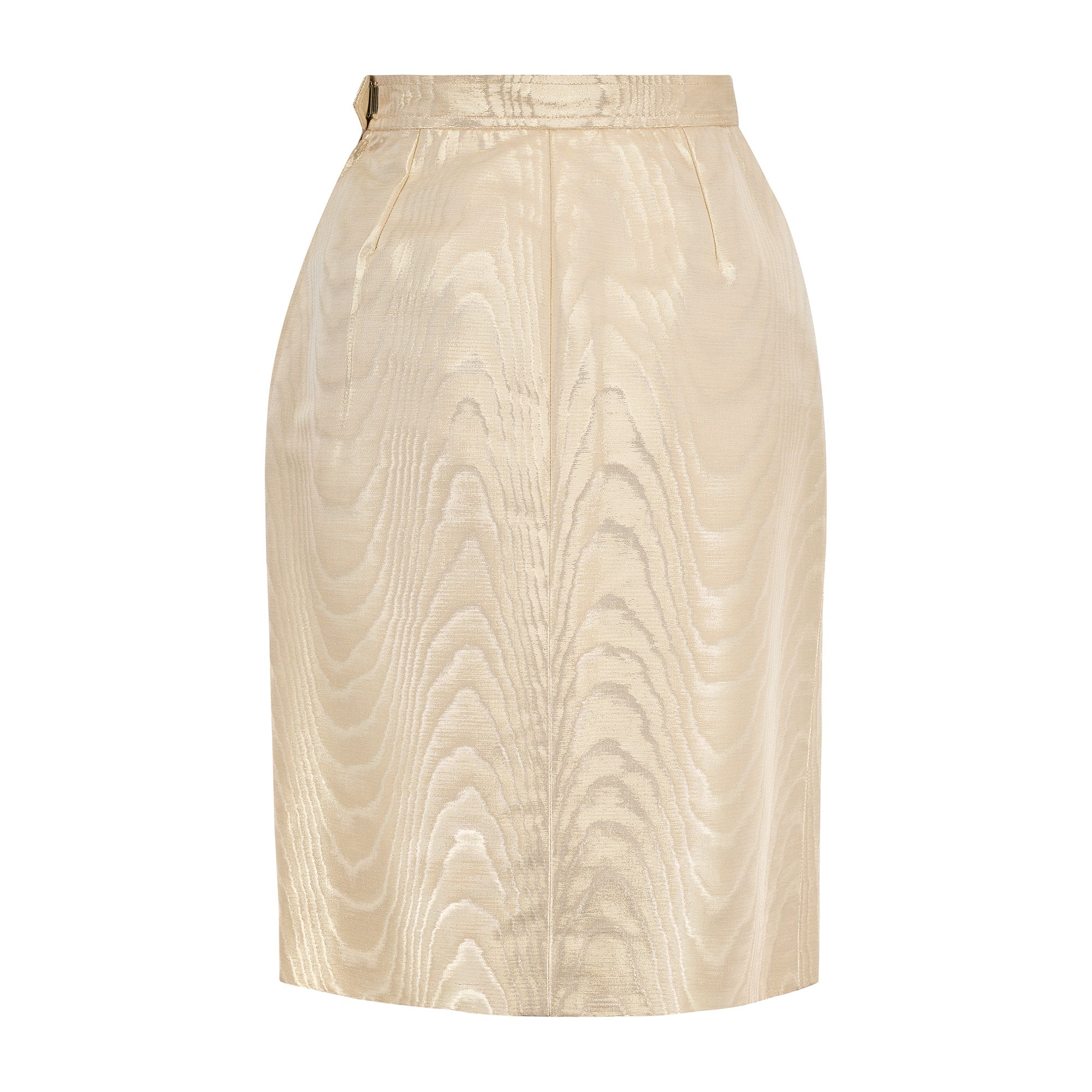 This opulent gold pencil skirt walked the runway as part of Saint Laurent’s Fall 1987 collection. Crafted from a mesmerising thick metallic cotton-mix moiré, it epitomises the decadence of the era of excess. Tailored to a pencil skirt style, it has a high-waist, hip-hugging fit and falls to above the knee. The front is detailed with two slanted welt pockets which emphasise the hips. The skirt is fully lined with a rich cream–gold satin. It fastens at the left side of the waist with a hidden tonal zip. An angular tab in the waistband conceals a hook-and-bar closure.