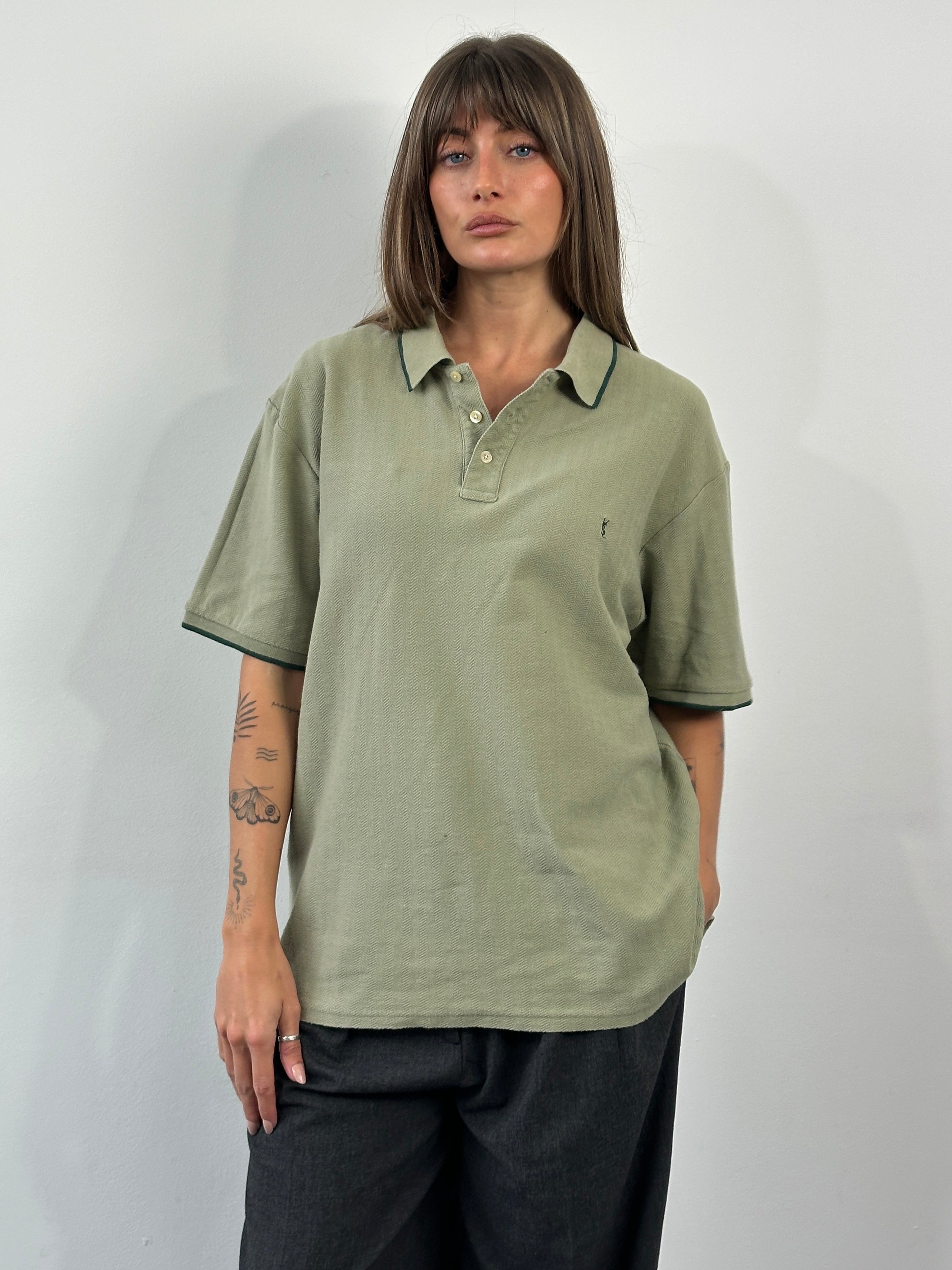 Yves Saint Laurent Pour Homme 1990s green cotton polo in a soft sage tone with dark green contrast trim at the collar. Crafted in textured woven cotton with embroidered chest logo and branded buttons, cut in a relaxed straight silhouette.