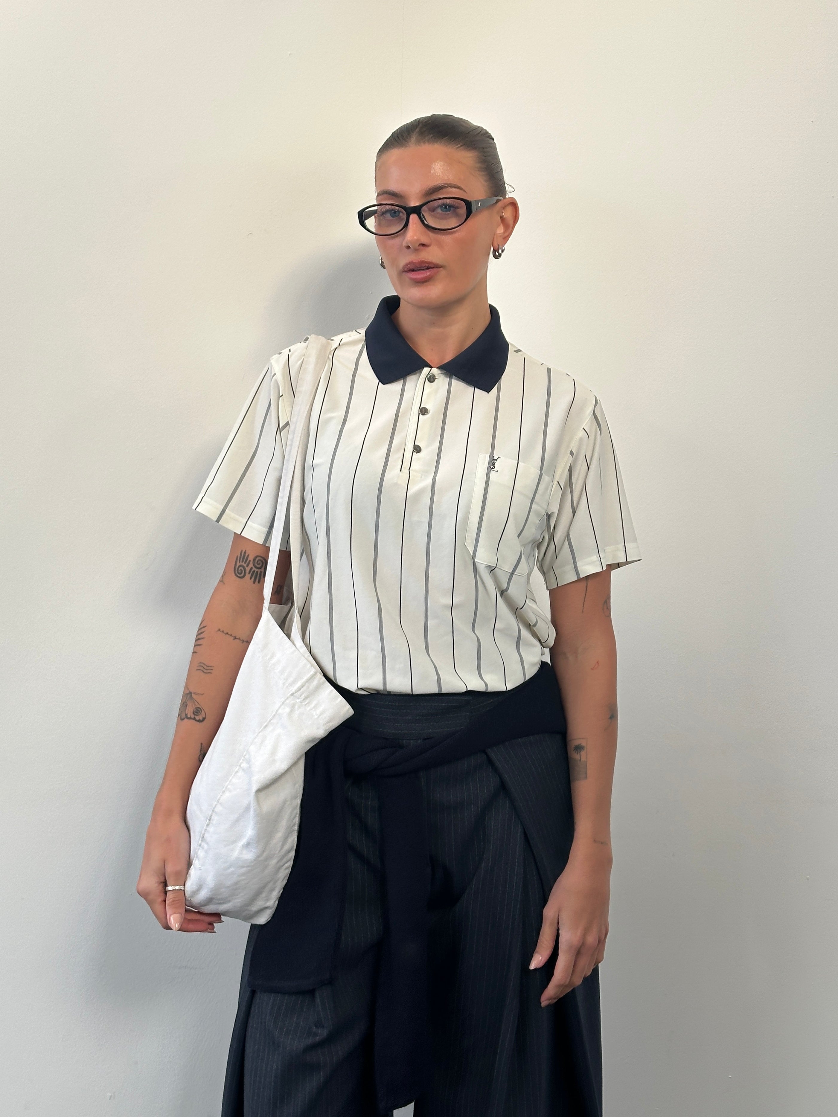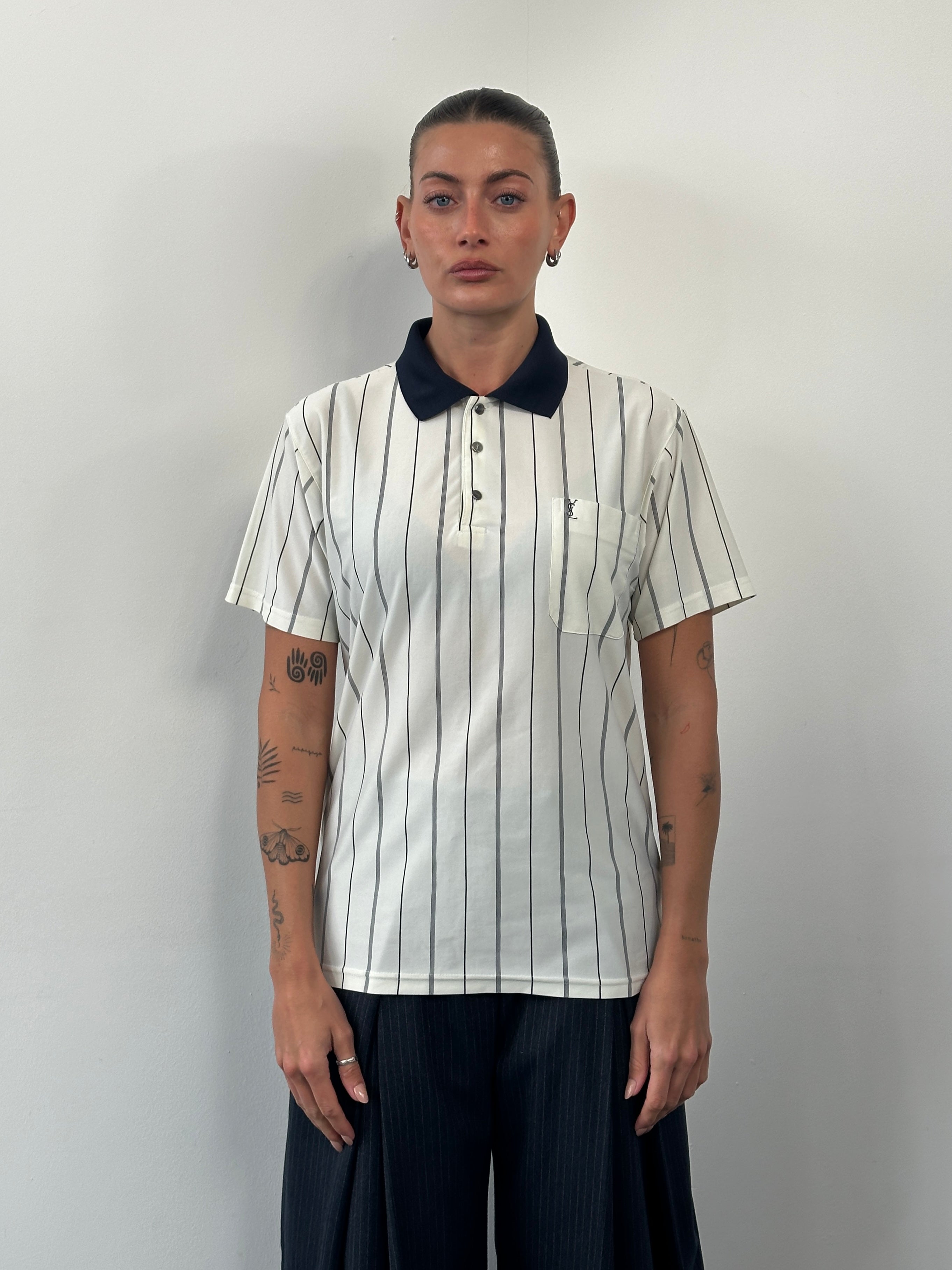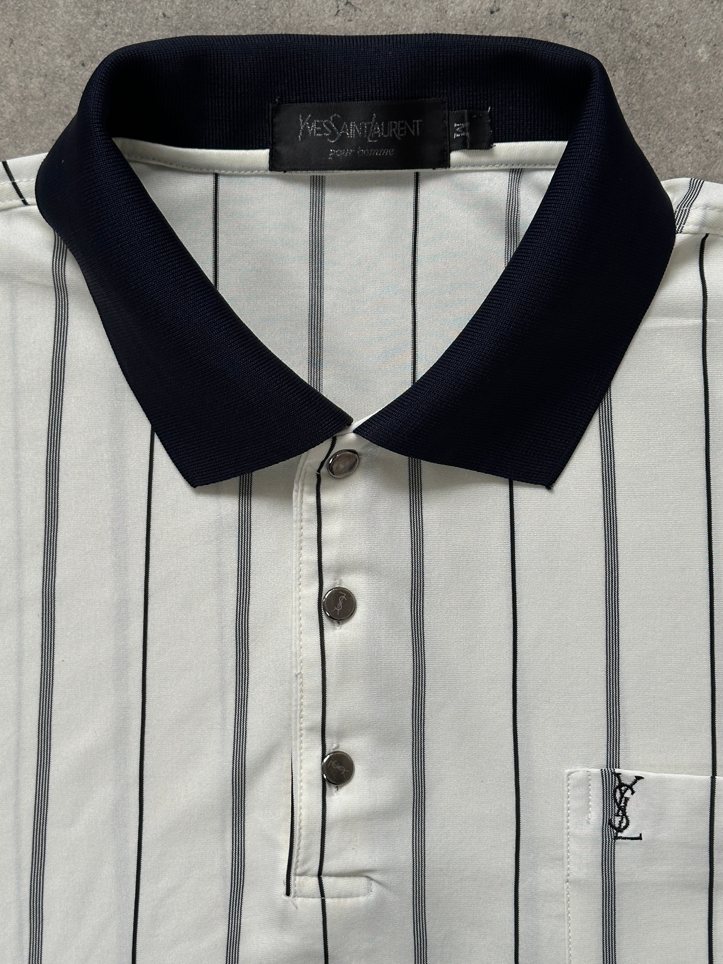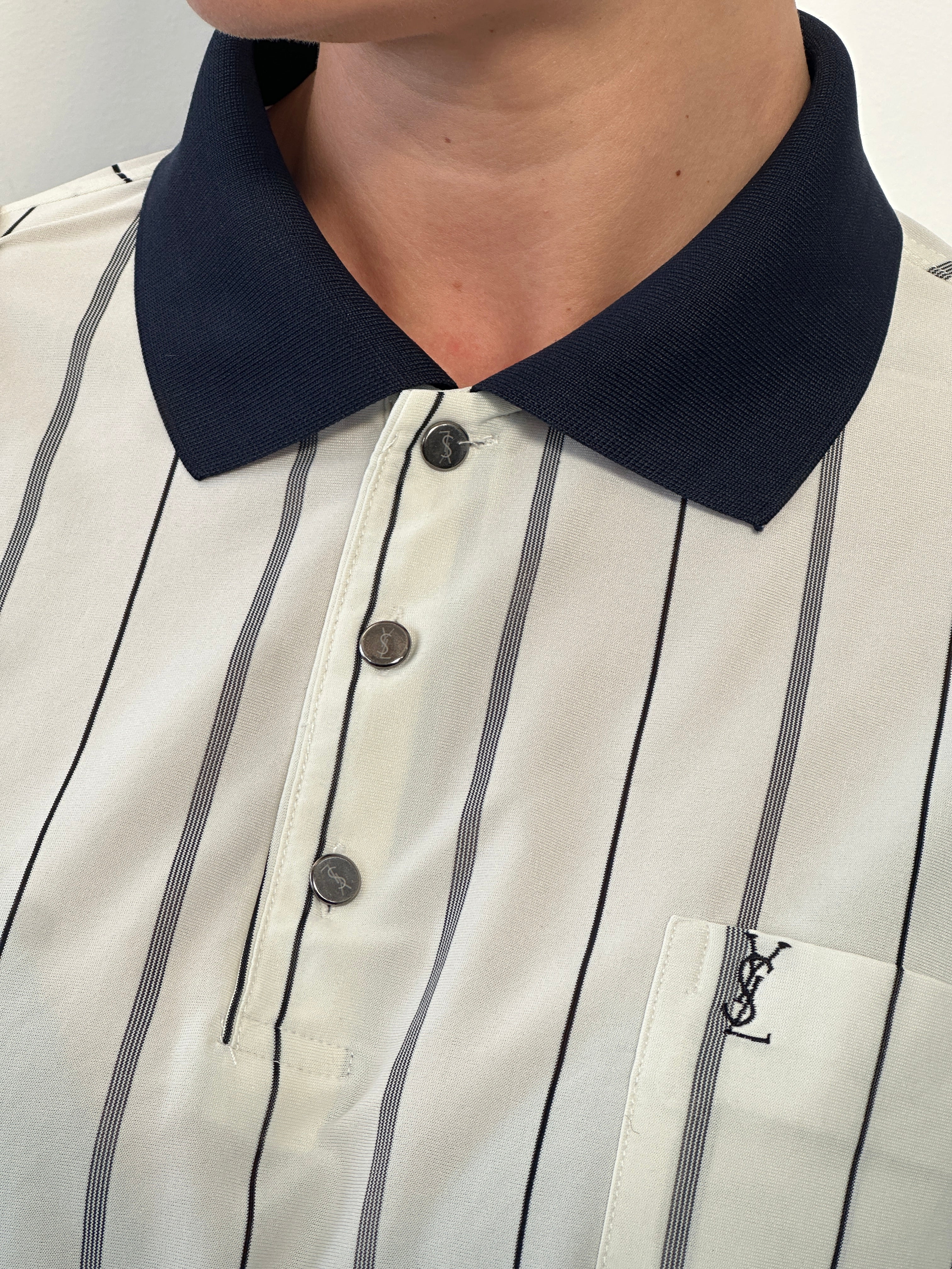 Vintage 1990s Yves Saint Laurent polo shirt in a cream pure silk with navy vertical stripe detailing. Designed with a contrasting navy collar, bespoke silver-tone YSL engraved buttons, and a subtle embroidered YSL chest logo. A refined short-sleeve silhouette combining sportswear influence with elevated fabrication.