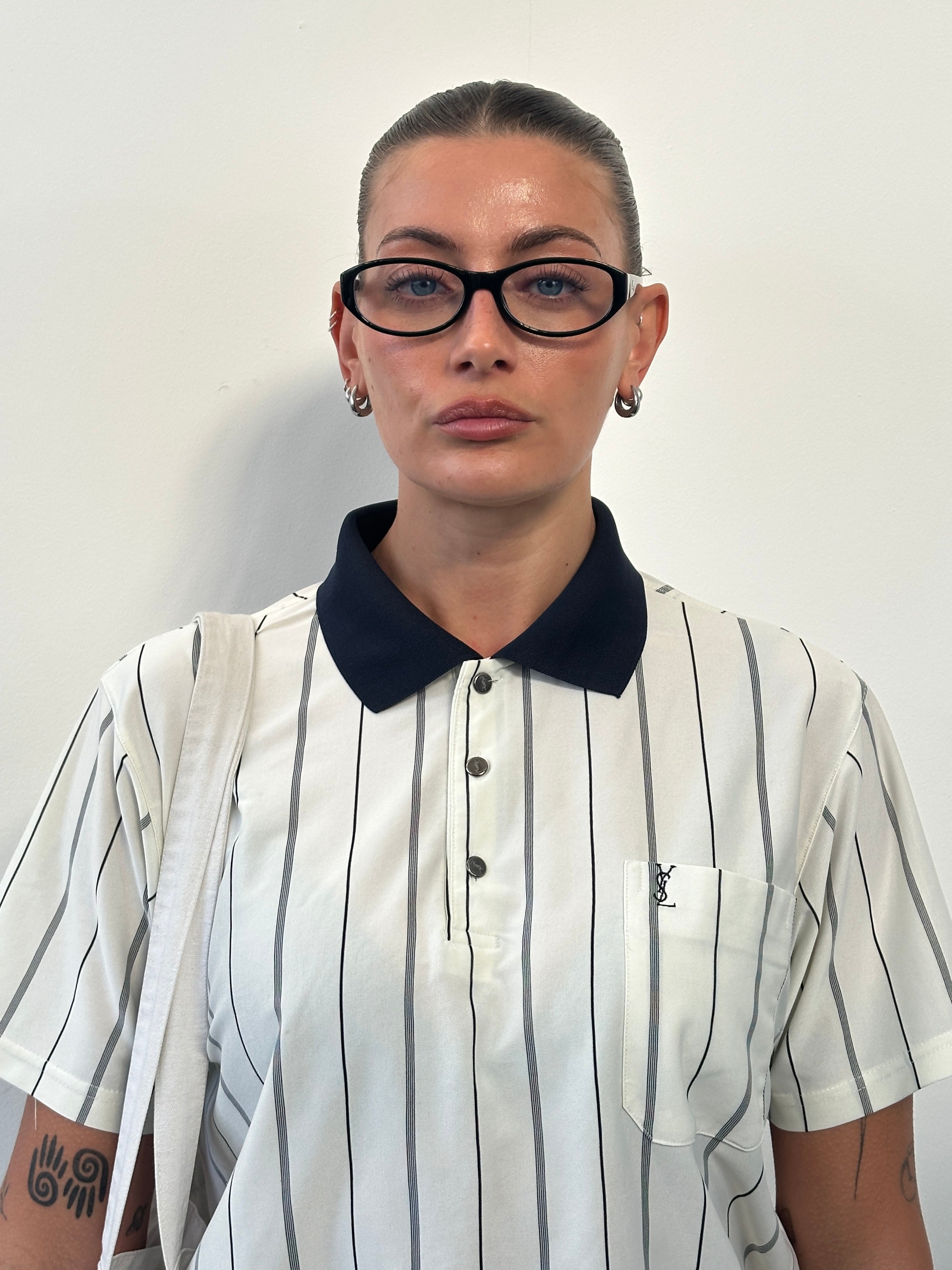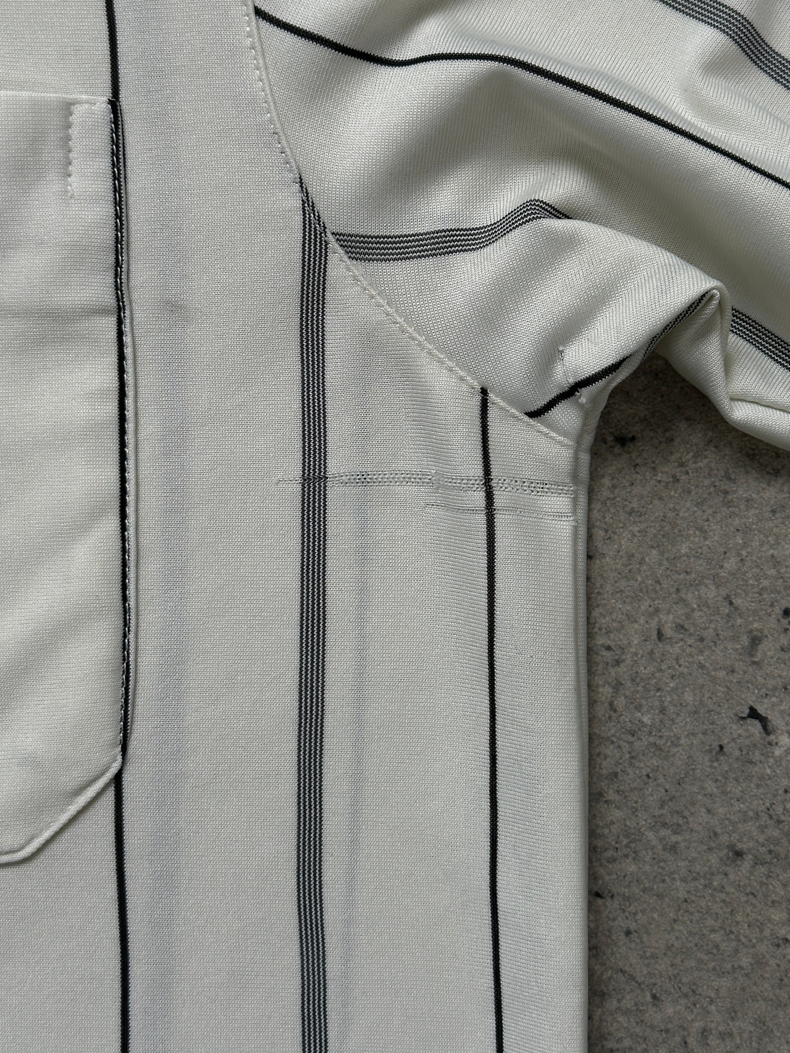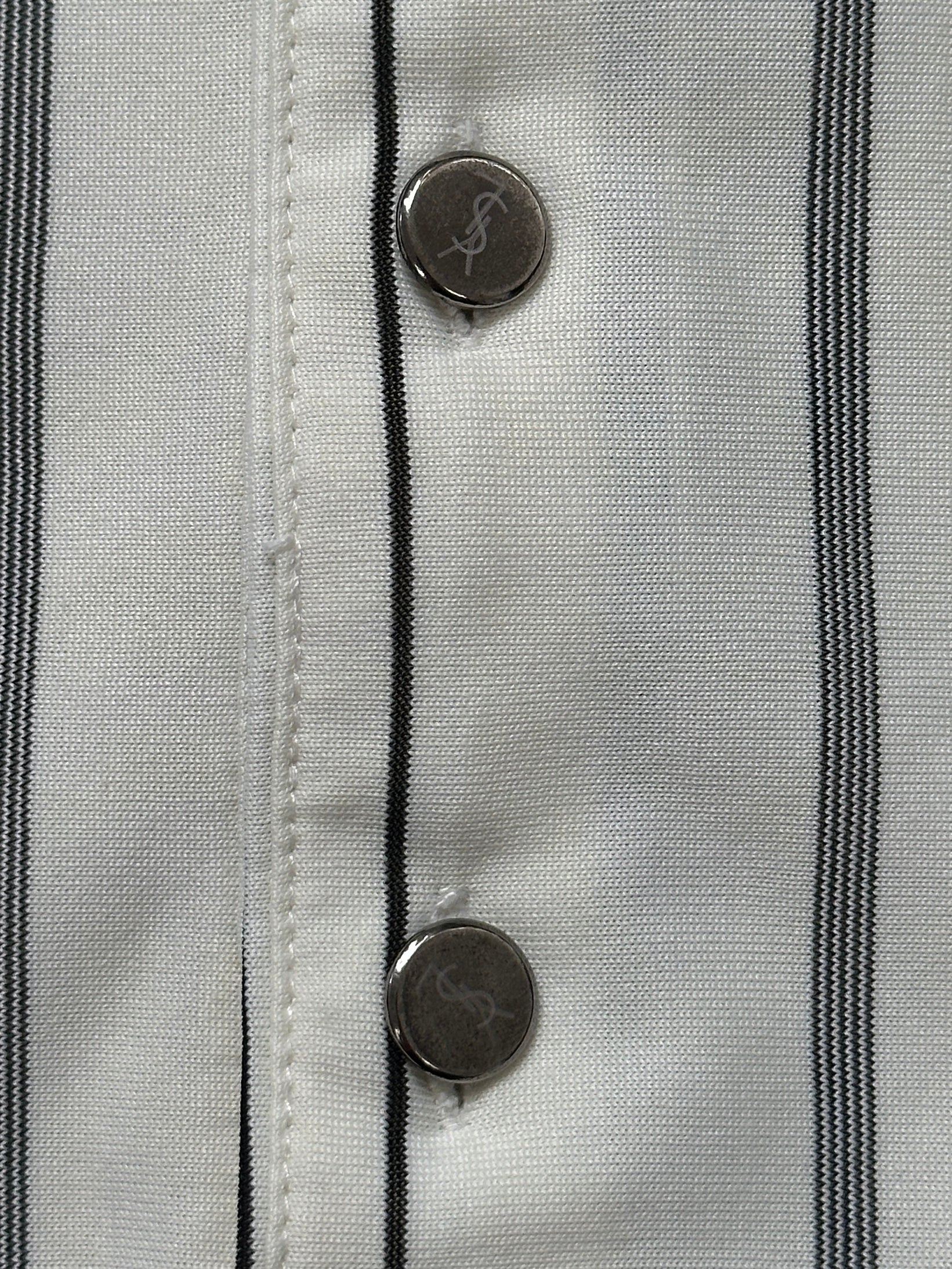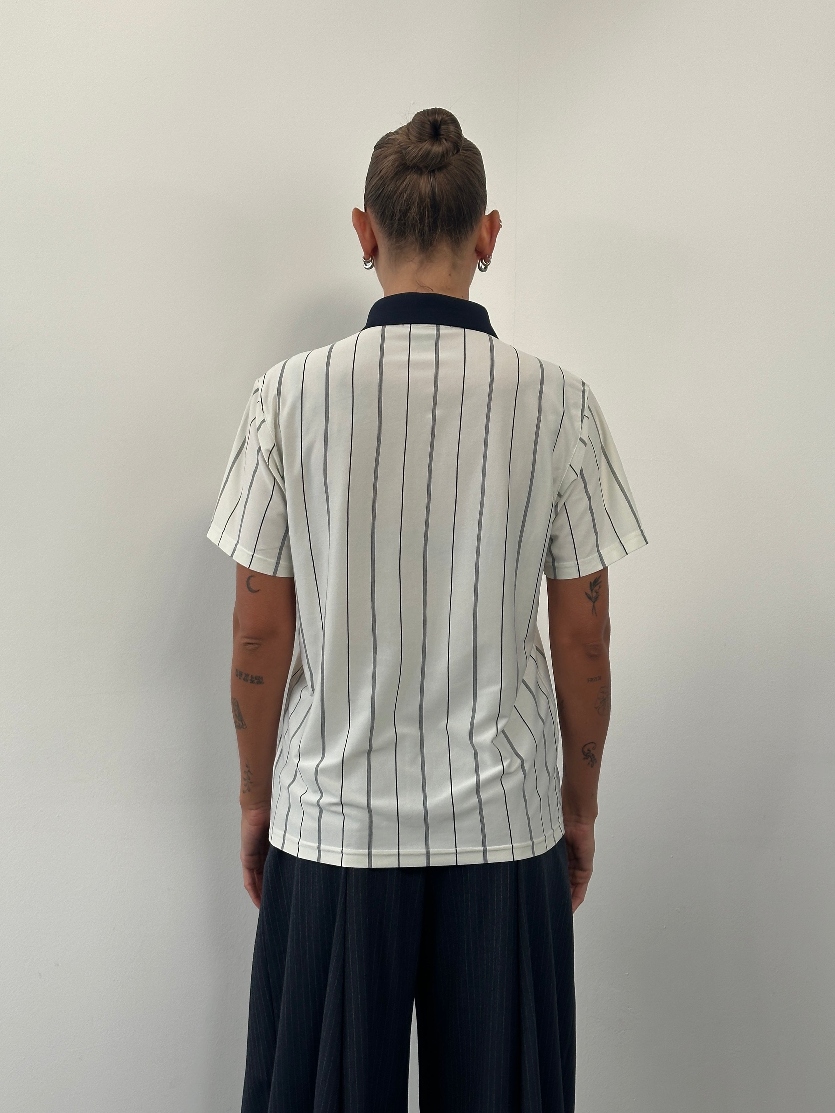 Vintage 1990s Yves Saint Laurent polo shirt in a cream pure silk with navy vertical stripe detailing. Designed with a contrasting navy collar, bespoke silver-tone YSL engraved buttons, and a subtle embroidered YSL chest logo. A refined short-sleeve silhouette combining sportswear influence with elevated fabrication.