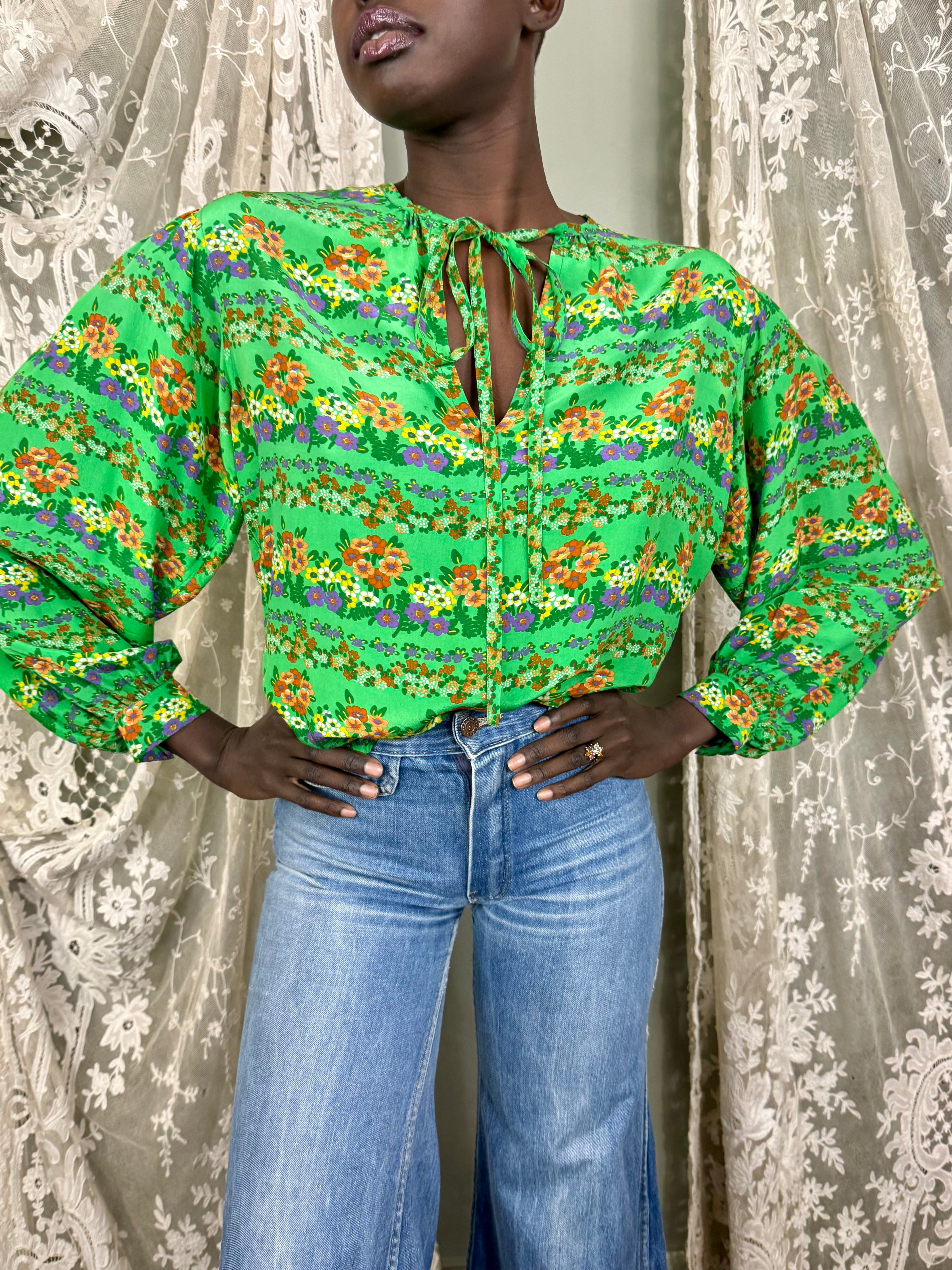 This collectible Yves Saint Laurent blouse from the 80s features a beautifully crafted silk peasant design with balloon sleeves and a front V neckline with a tie. The elegant and straight fit offers a timeless and sophisticated look.