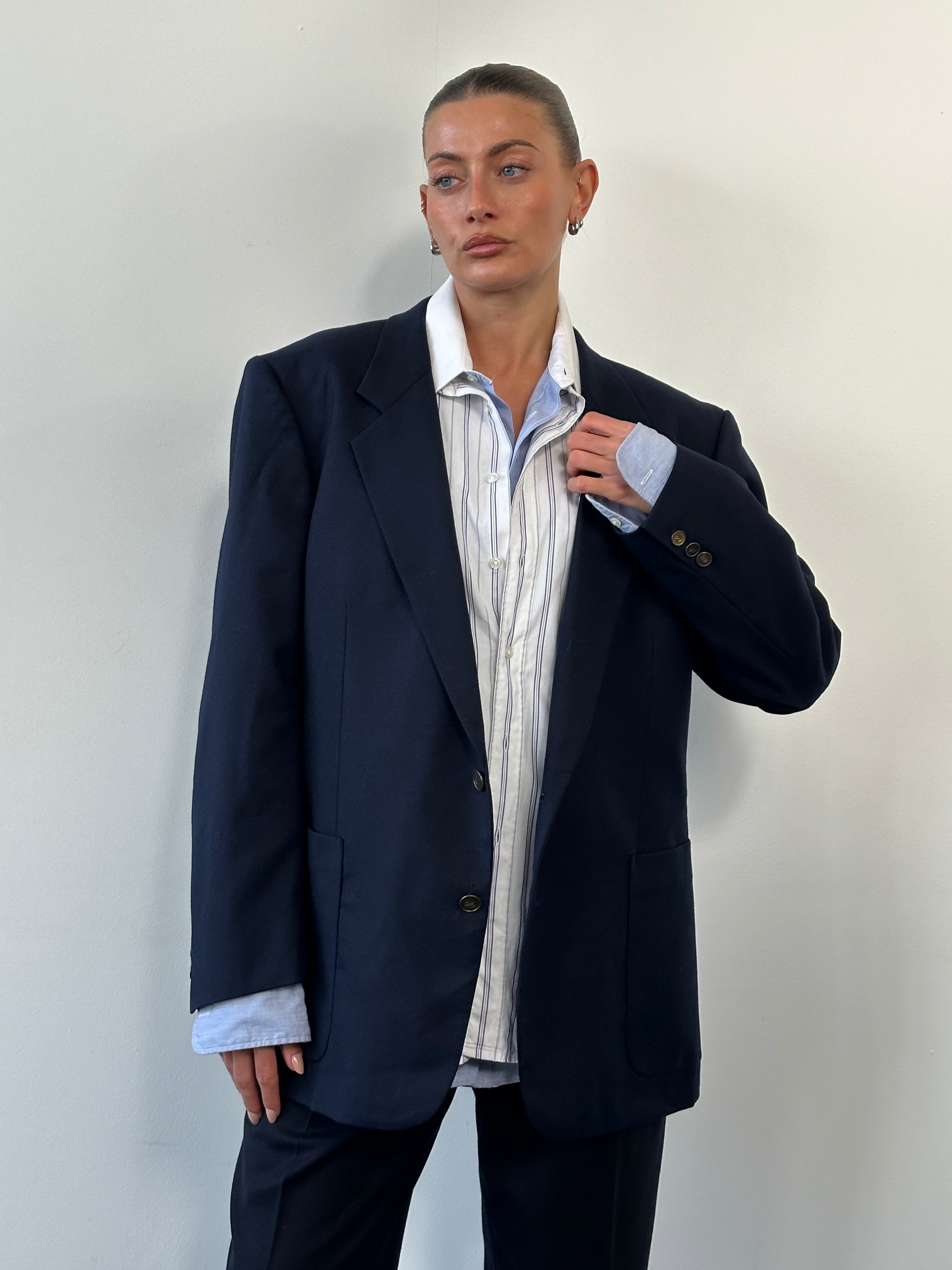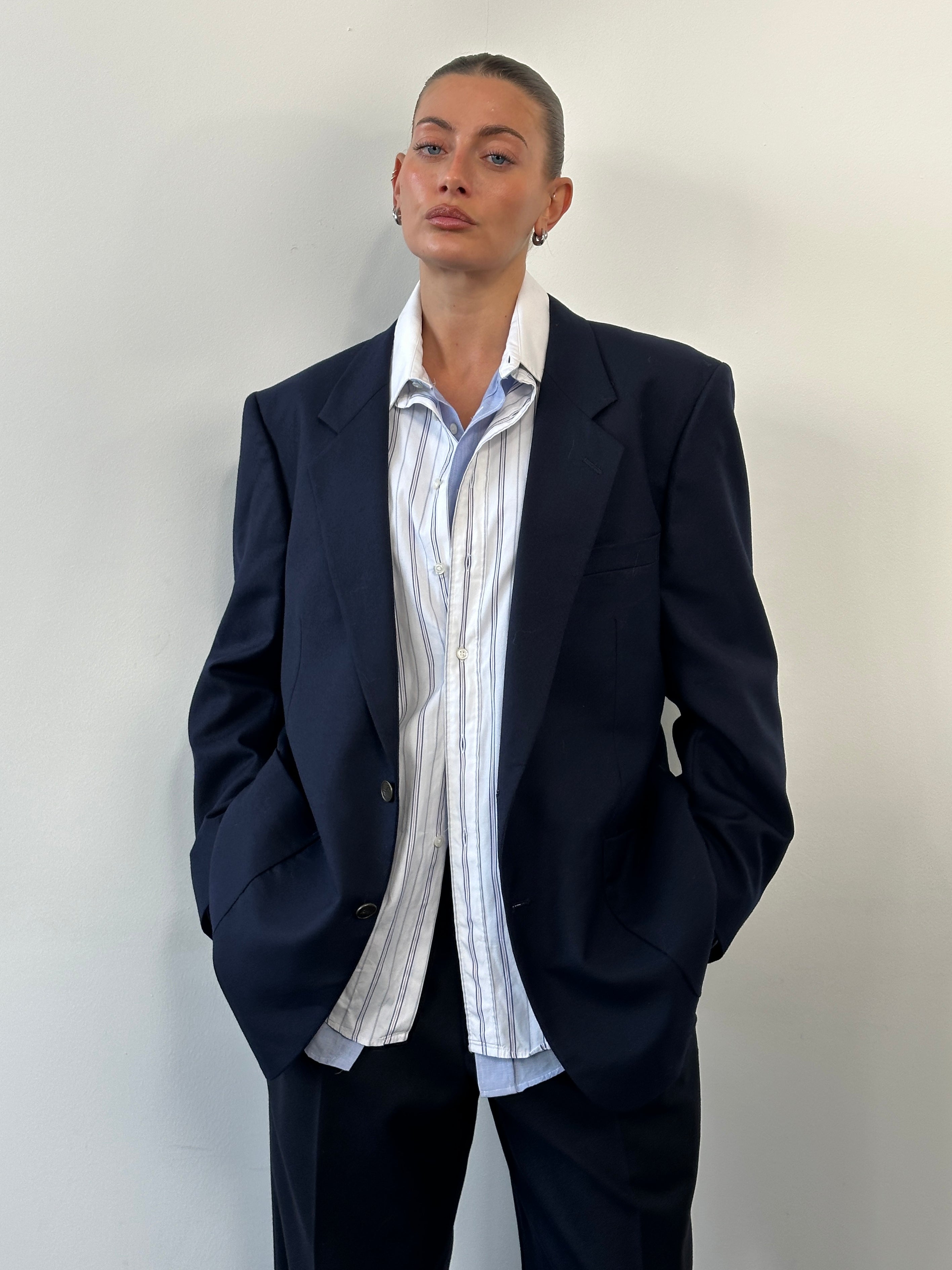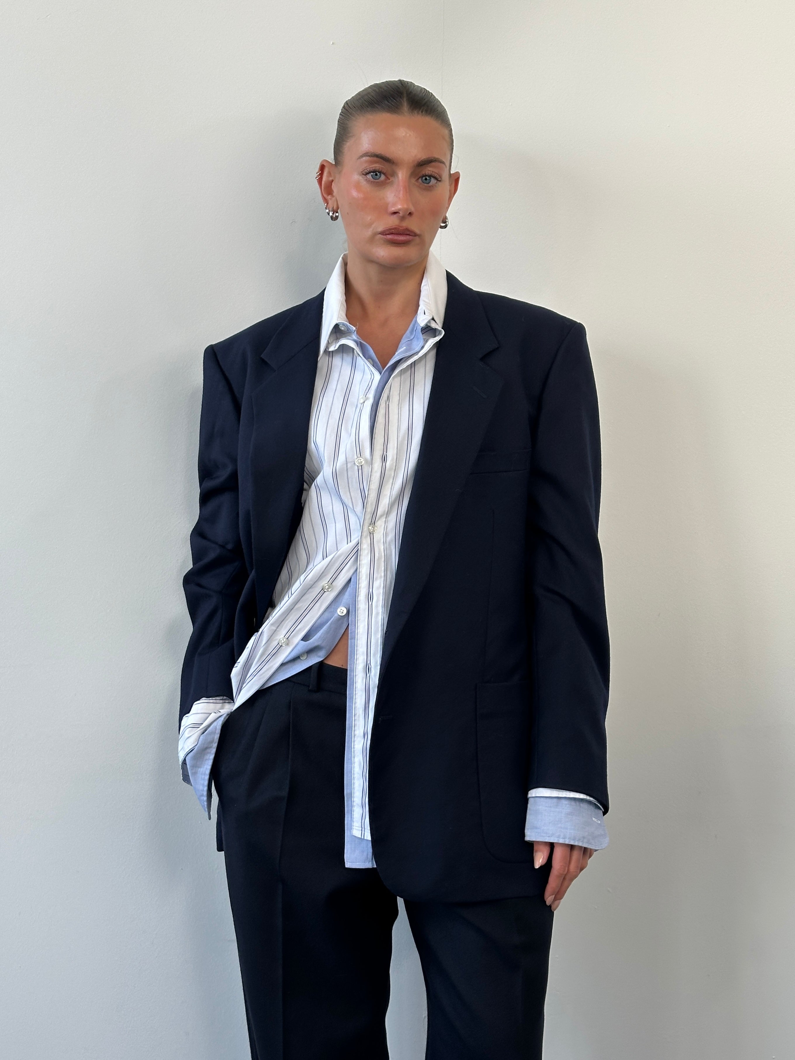 A refined vintage 1990s Yves Saint Laurent menswear blazer in deep navy, tailored in a clean single breasted cut with bespoke YSL engraved buttons made exclusively for Eaton. Crafted from pure virgin wool with a smooth rayon lining.