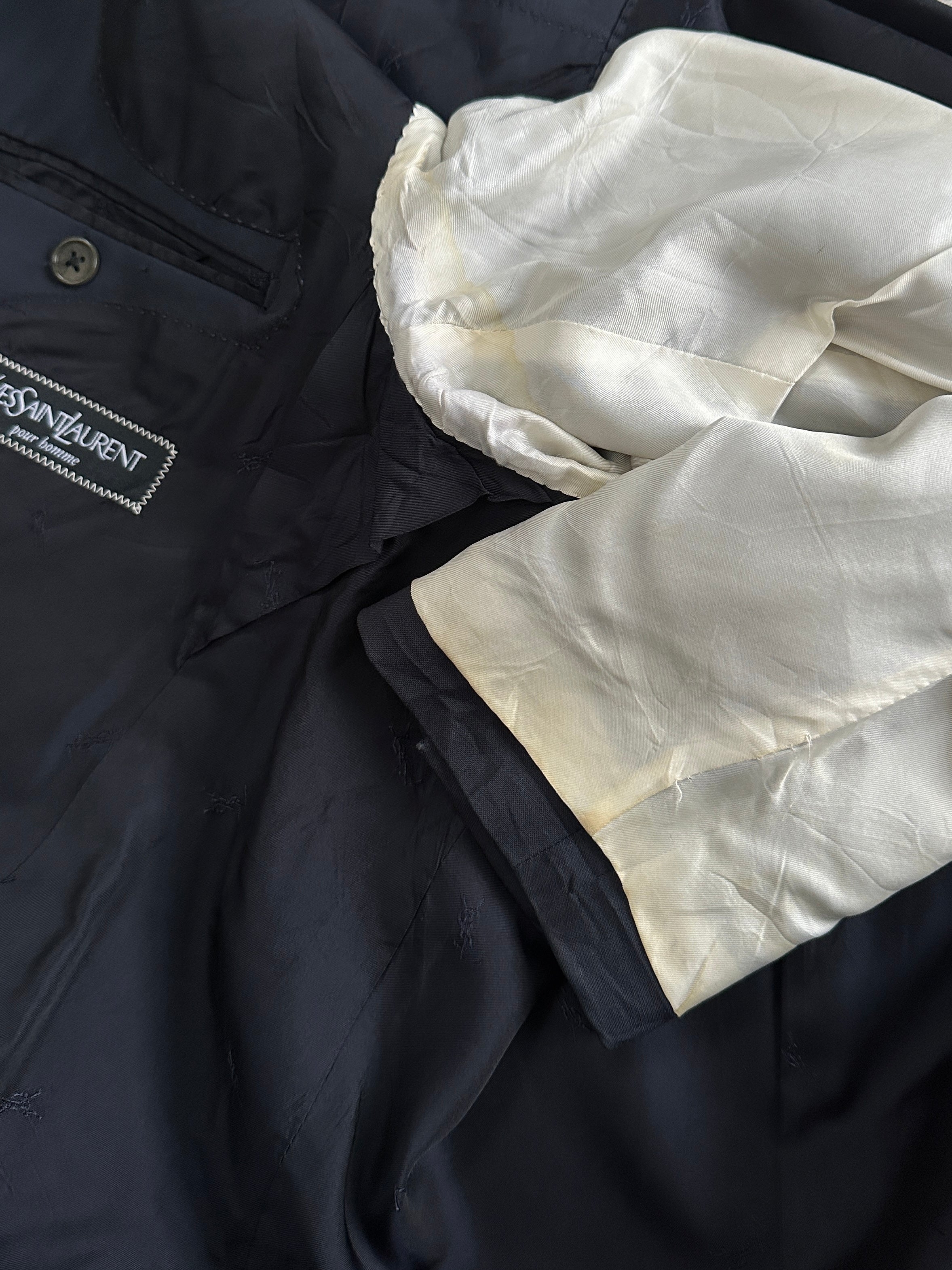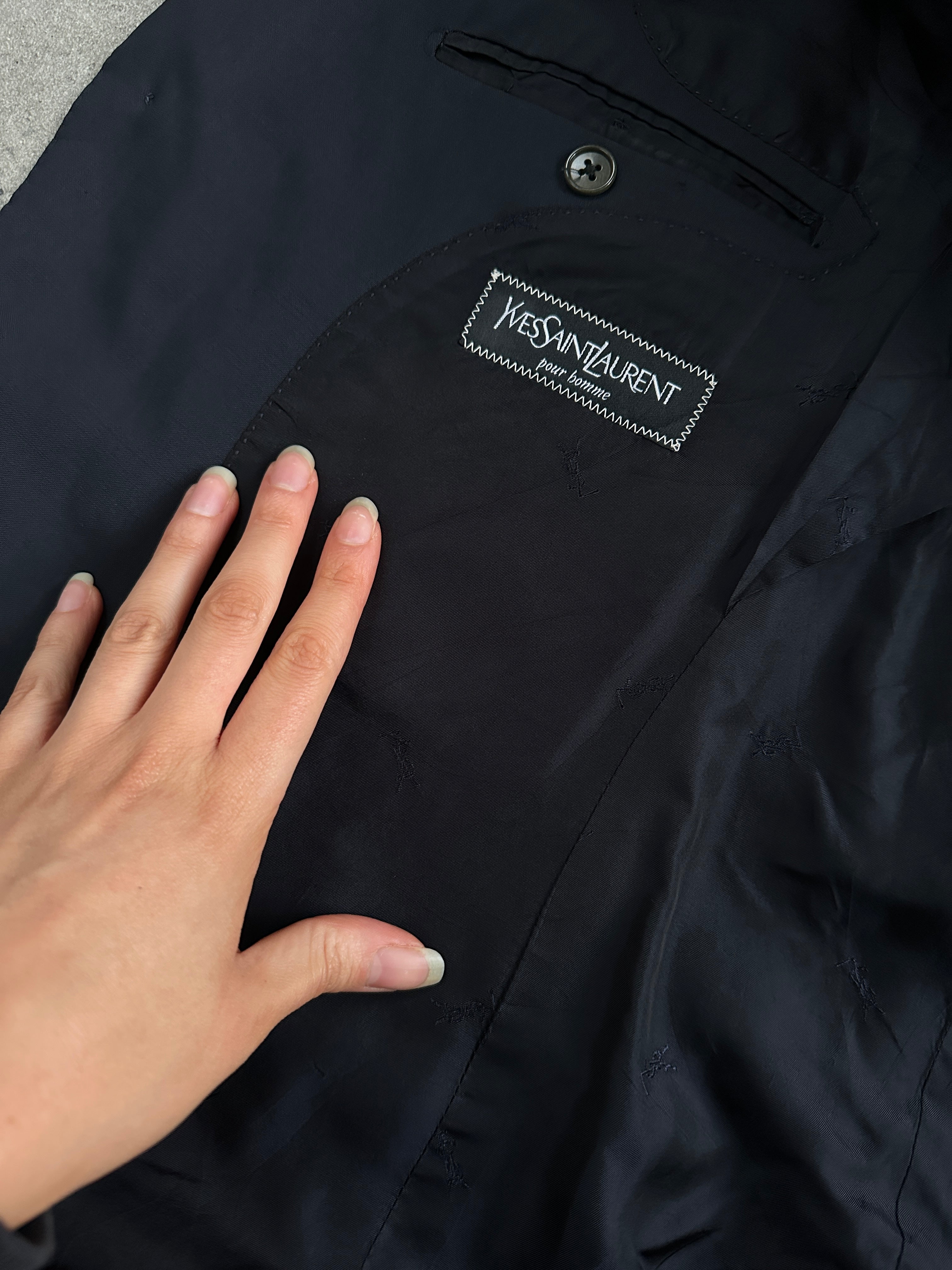 Vintage refined navy wool blazer by Yves Saint Laurent, featuring a distinctive high-neck button fastening and clean tailored lines. The structured silhouette and Italian construction make this a timeless piece that works styled oversized or worn more traditionally.