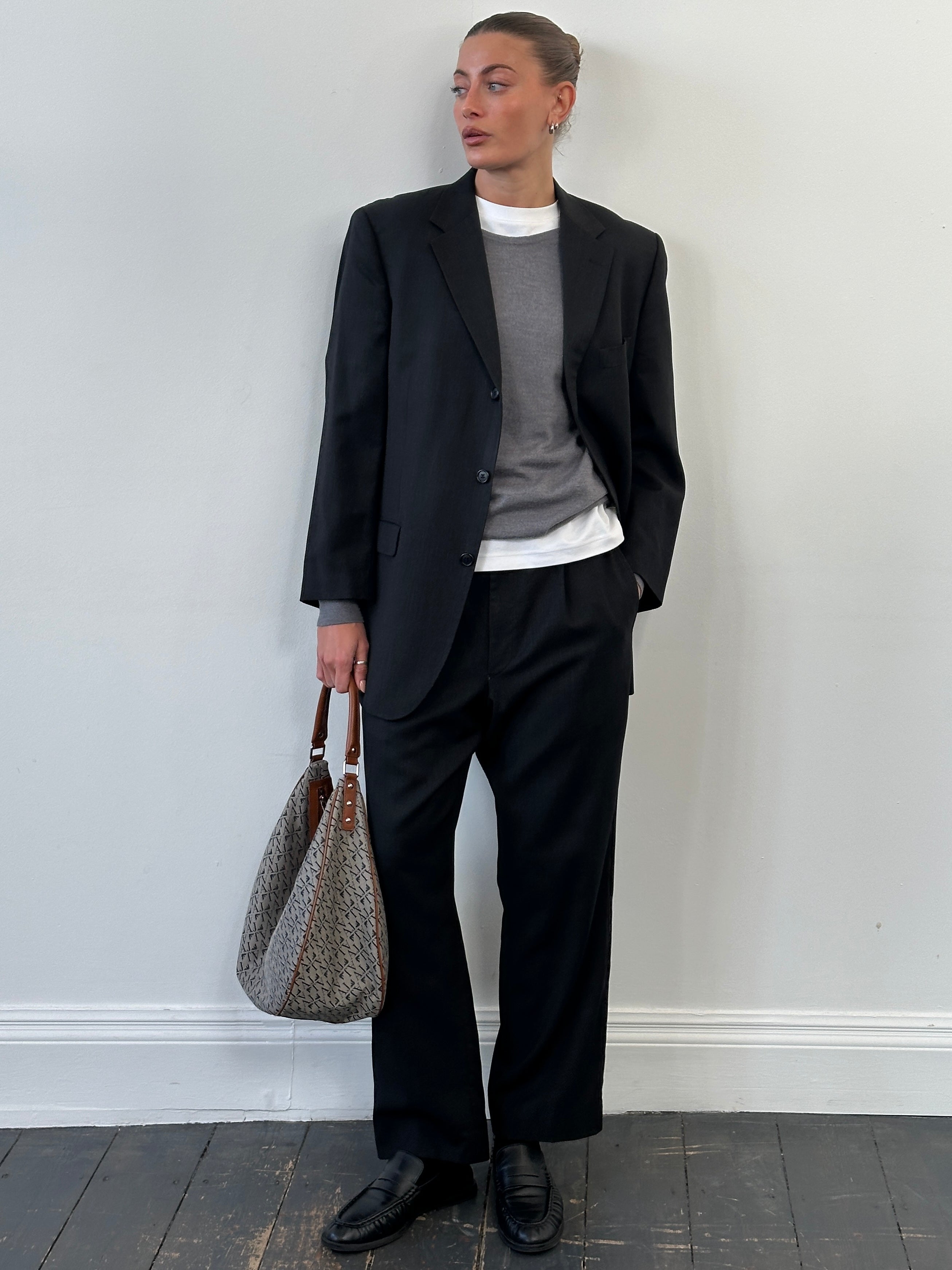 A grey single breasted Yves Saint Laurent pour homme suit with clean structured tailoring and subtle minimal detailing. Finished with signature YSL monogram lining, the set reflects classic 1990s tailoring with a slightly shorter trouser length and refined silhouette.
