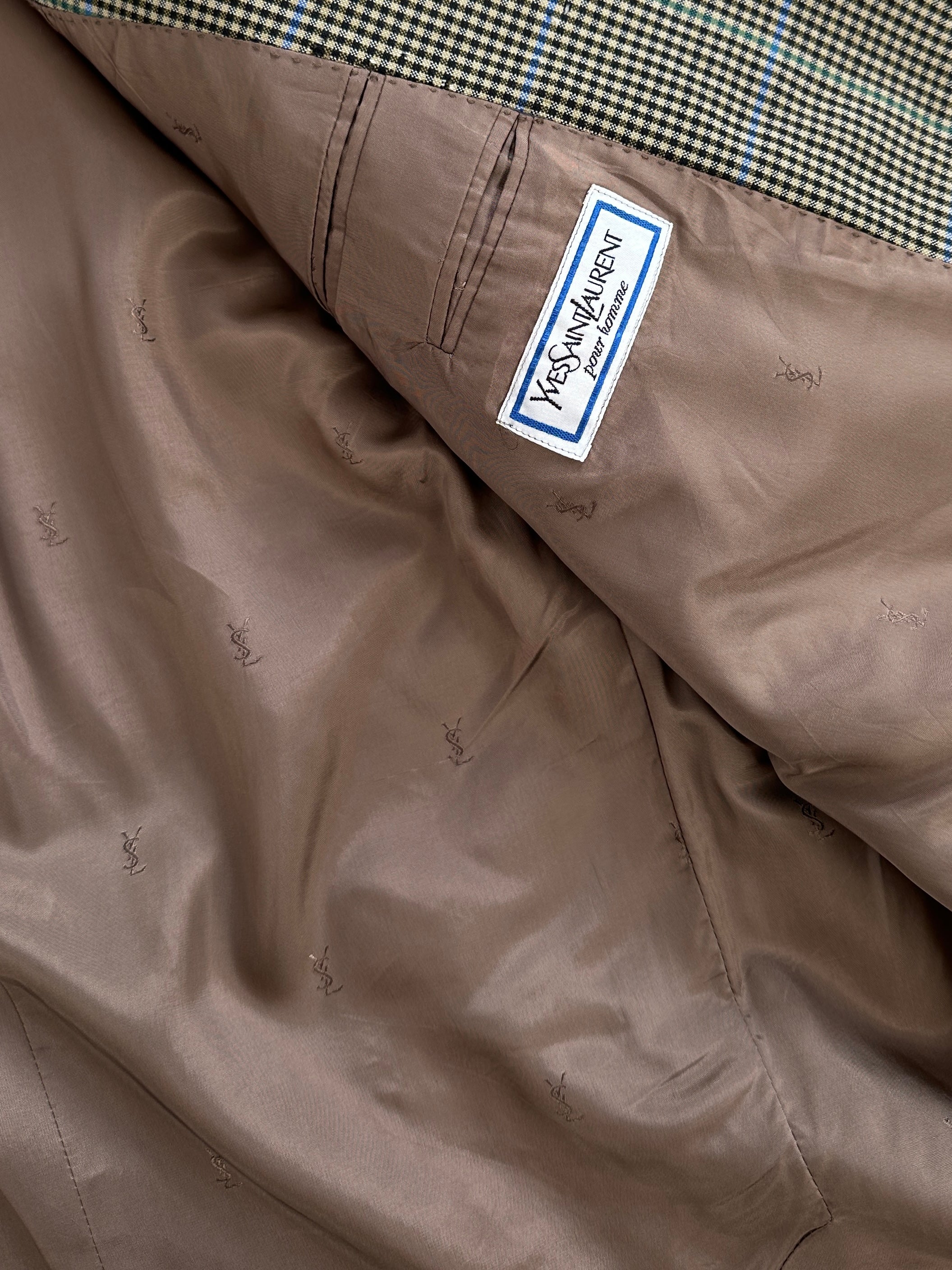 Vintage Yves Saint Laurent Pour Homme blazer in an overall green tone with a multicolour check pattern featuring green, yellow, white, black and subtle blue accents. A classic tailored silhouette from the 1990s, made in France with clean lines and a softly padded shoulder.