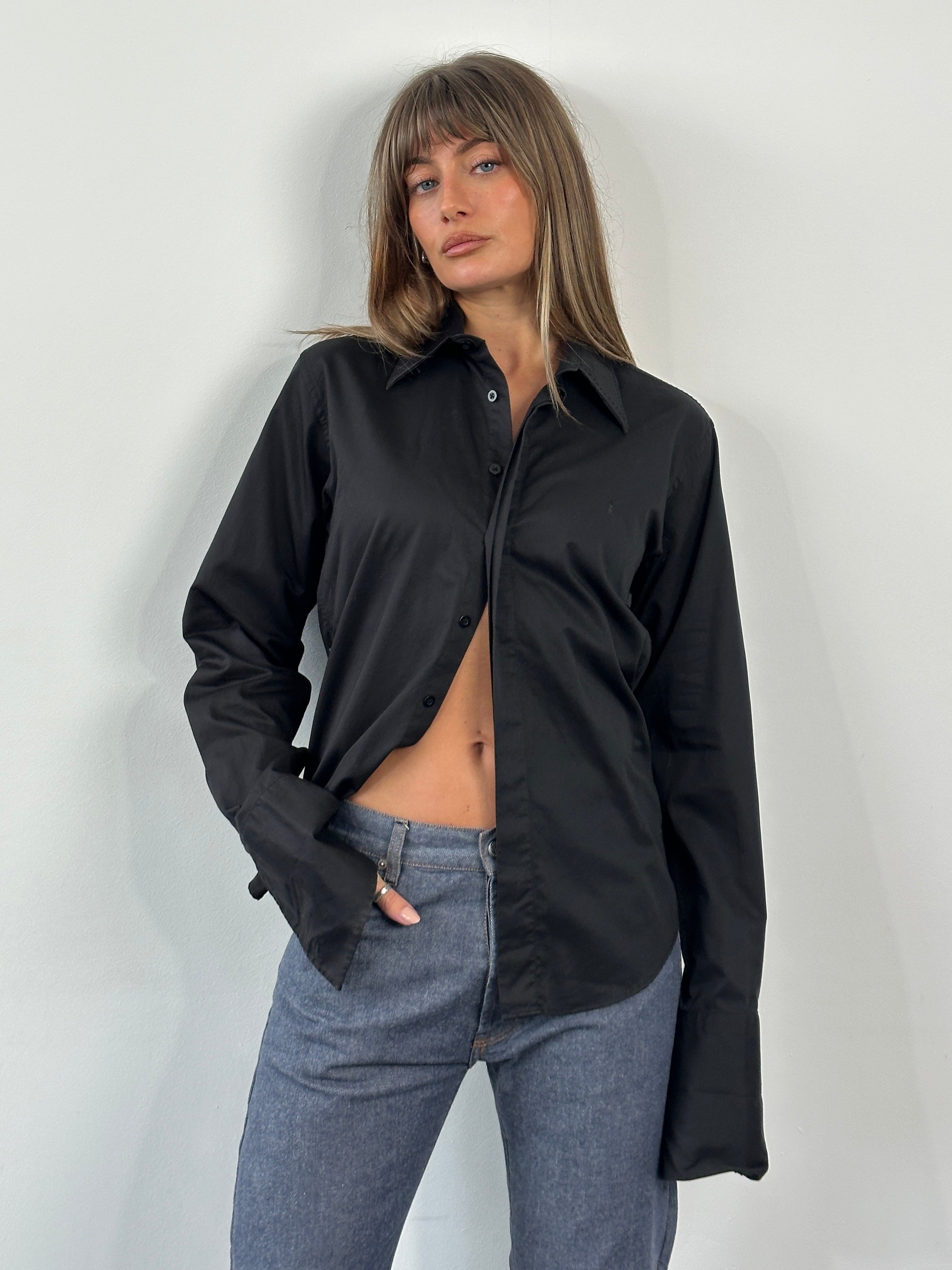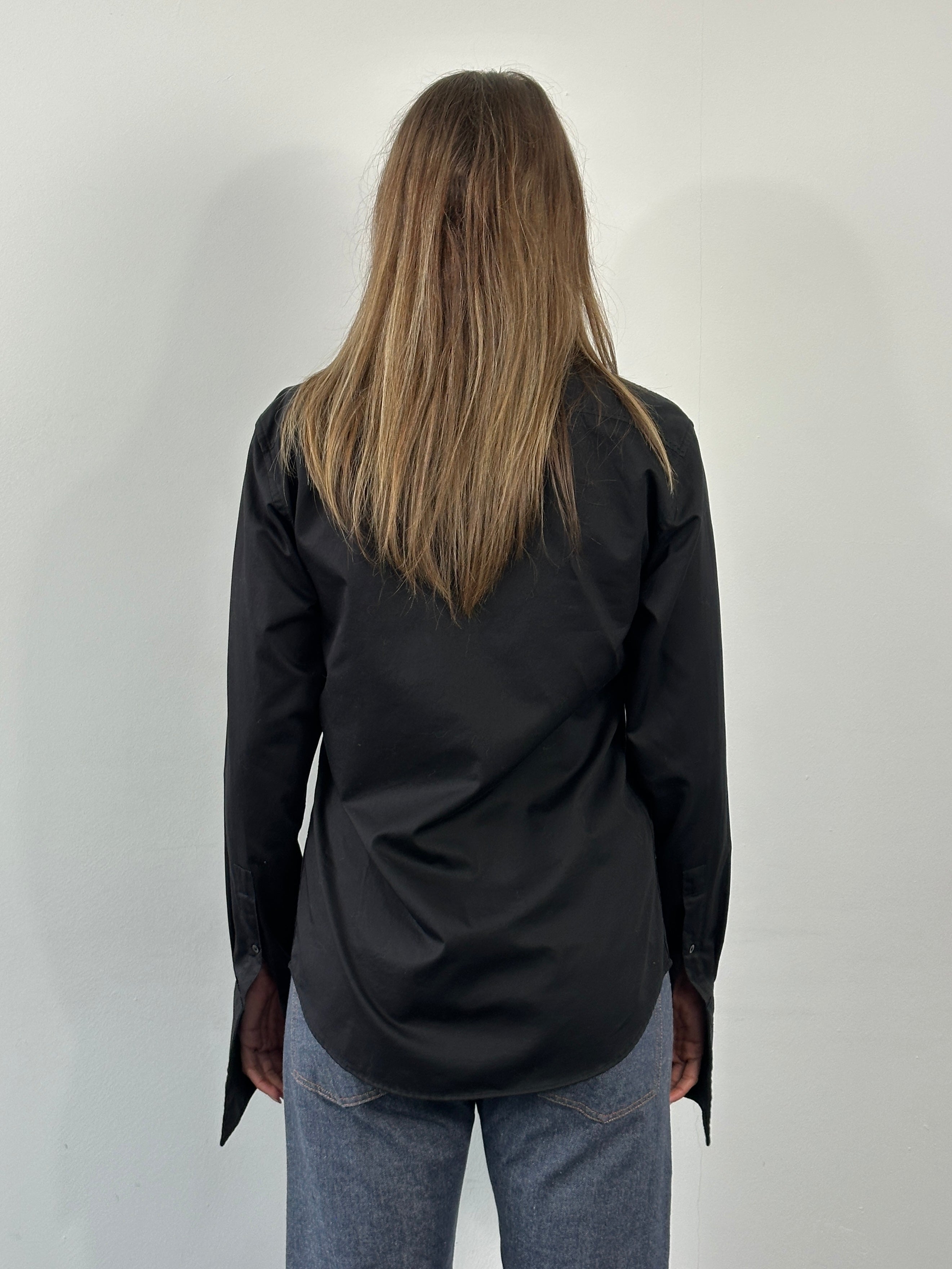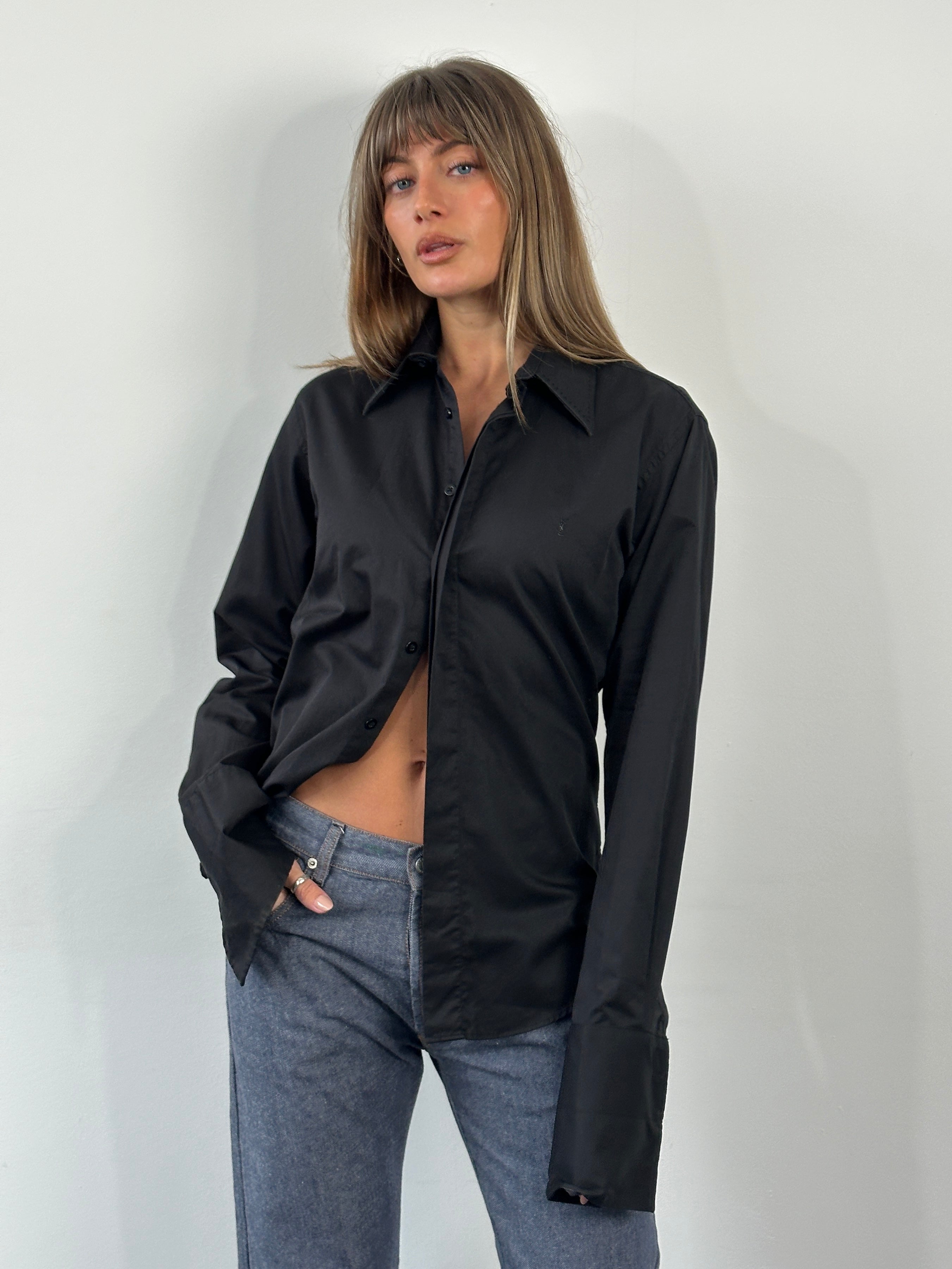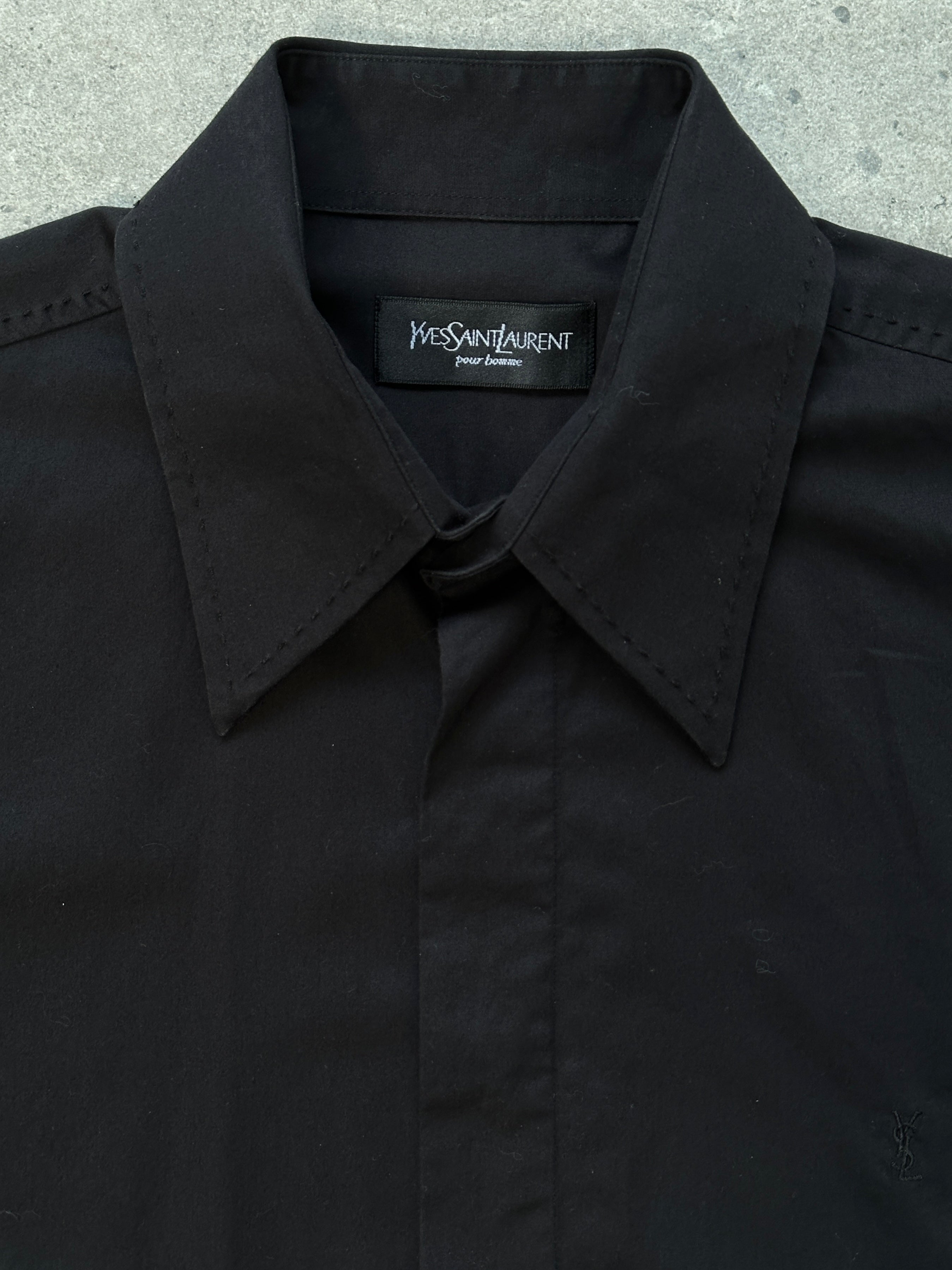 Vintage 2000s Yves Saint Laurent pour homme shirt in black pure cotton, finished with a concealed placket for a clean minimal front and point collar. Features a refined dress silhouette with structured cuffs and subtle YSL chest embroidery.