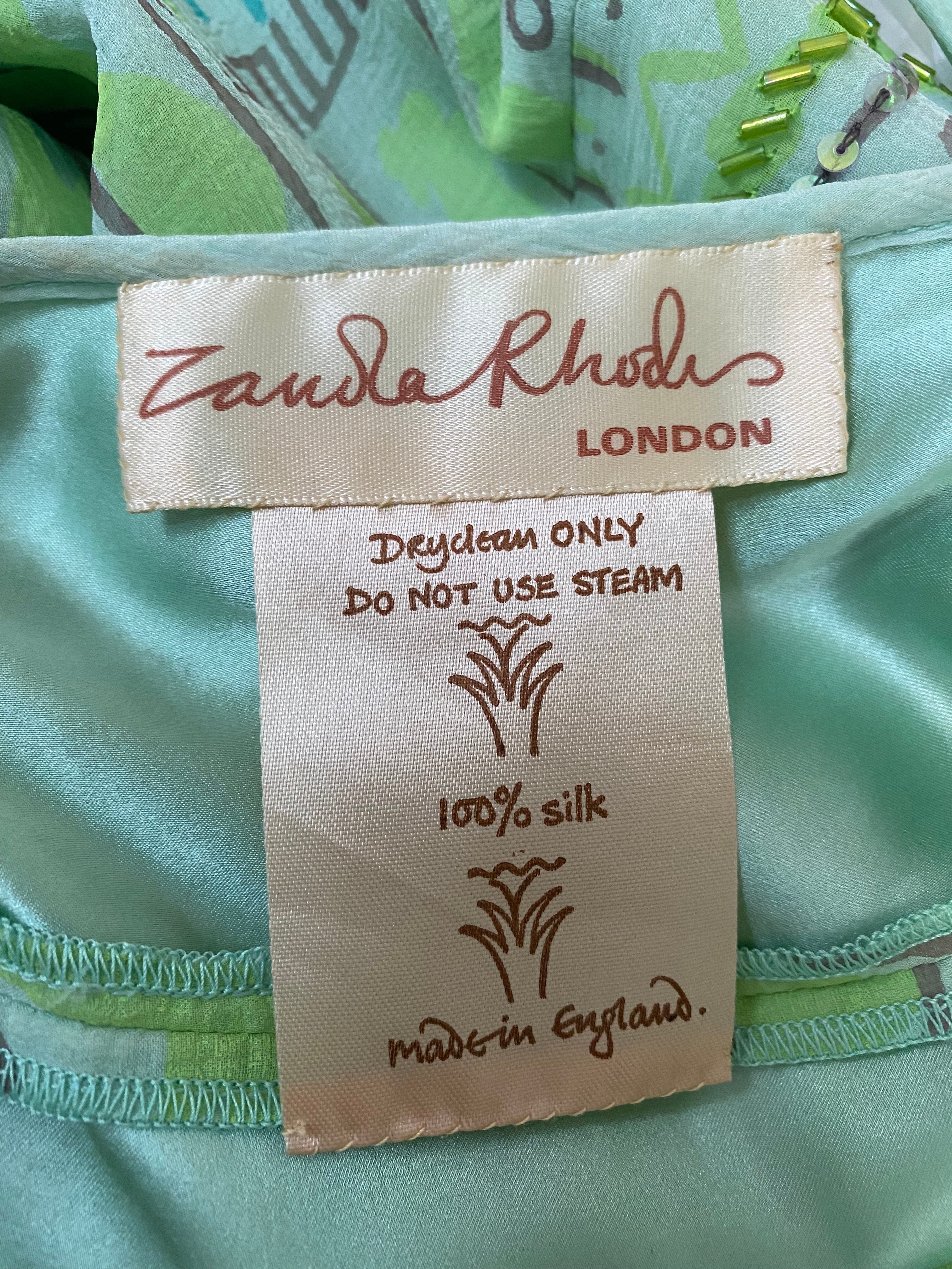 This beautiful Zandra Rhodes couture dress and scarf ensemble is cut in really gorgeous shades of green silk chiffon. Her abstract, signature screen-printed fabric is worked by hand in a lime, apple green, white and silvery brown colourway, with delicate threads of sequins and bugle beads running through it. The dress is fitted through to the hip and flares out with overlaid elongated panels, similar to a car wash style which separate when you walk, creating a bohemian and flowing look. It is lined with a pale mint silk that is cut with a similar wide fringe detail and which feels cool and comfortable for the wearer. The style reminds us of the early flapper dresses of the late 1910s and 1920s when women were released from constraining undergarments and fashions moved to a less constructed look. The very long and extravagant scarf is nearly twice the length and one and a half times the width of the dress and can be styled as a shawl, neck scarf or worn separately.