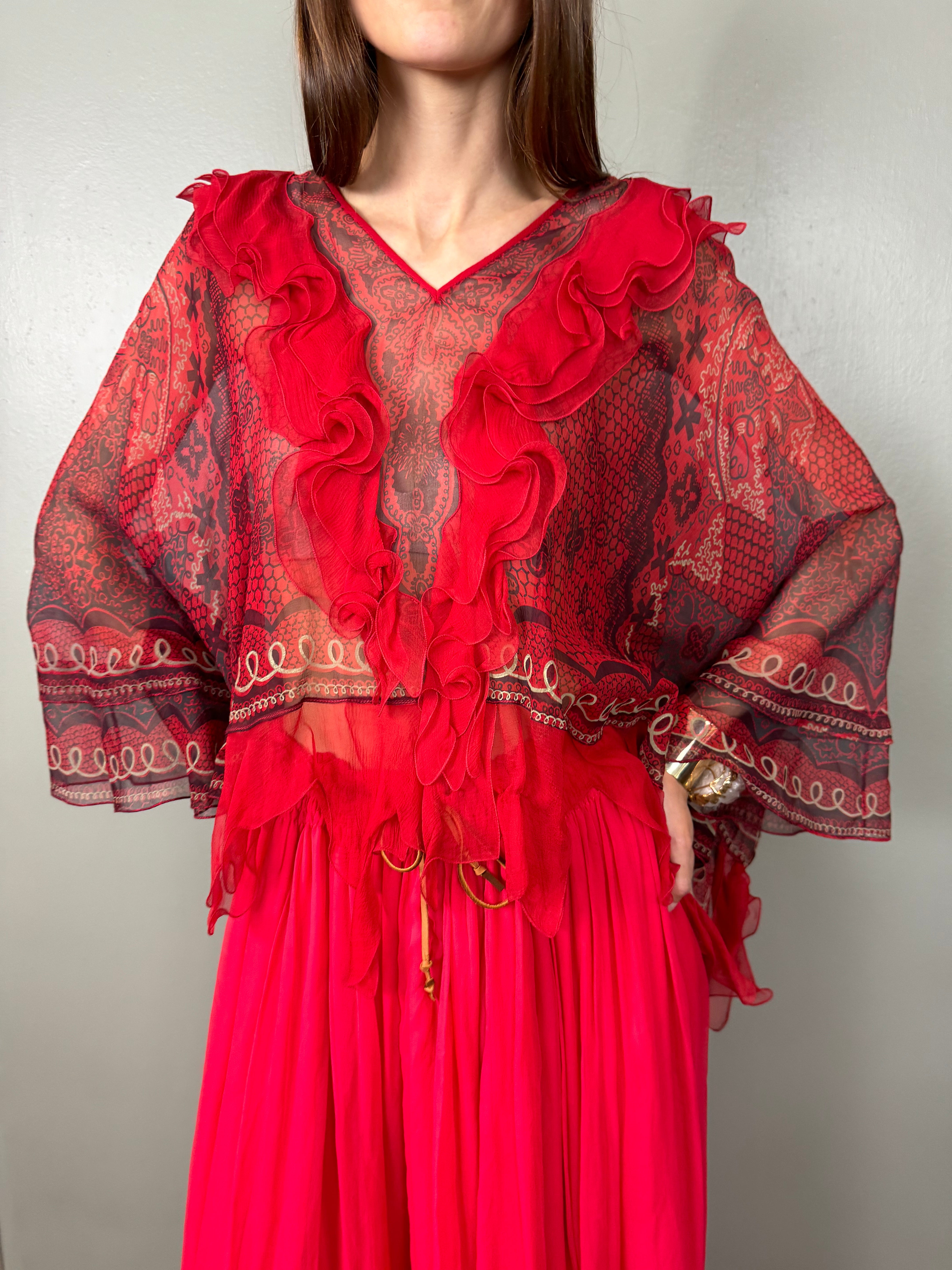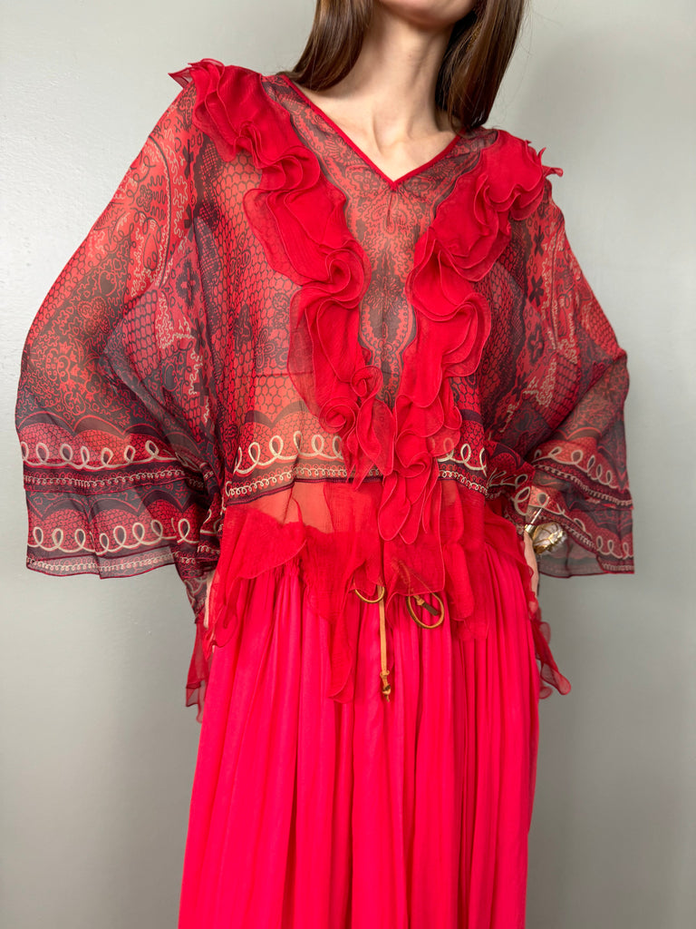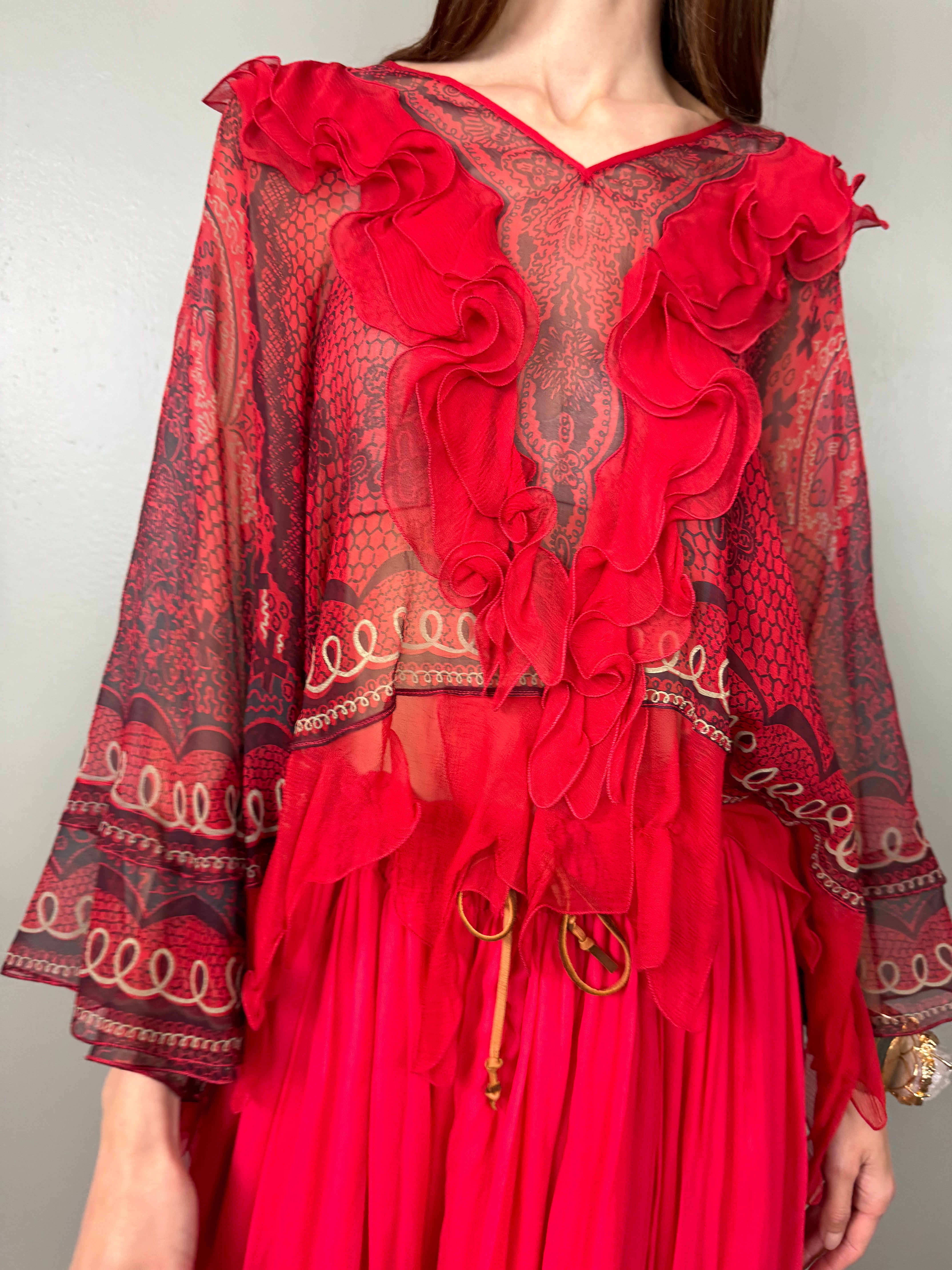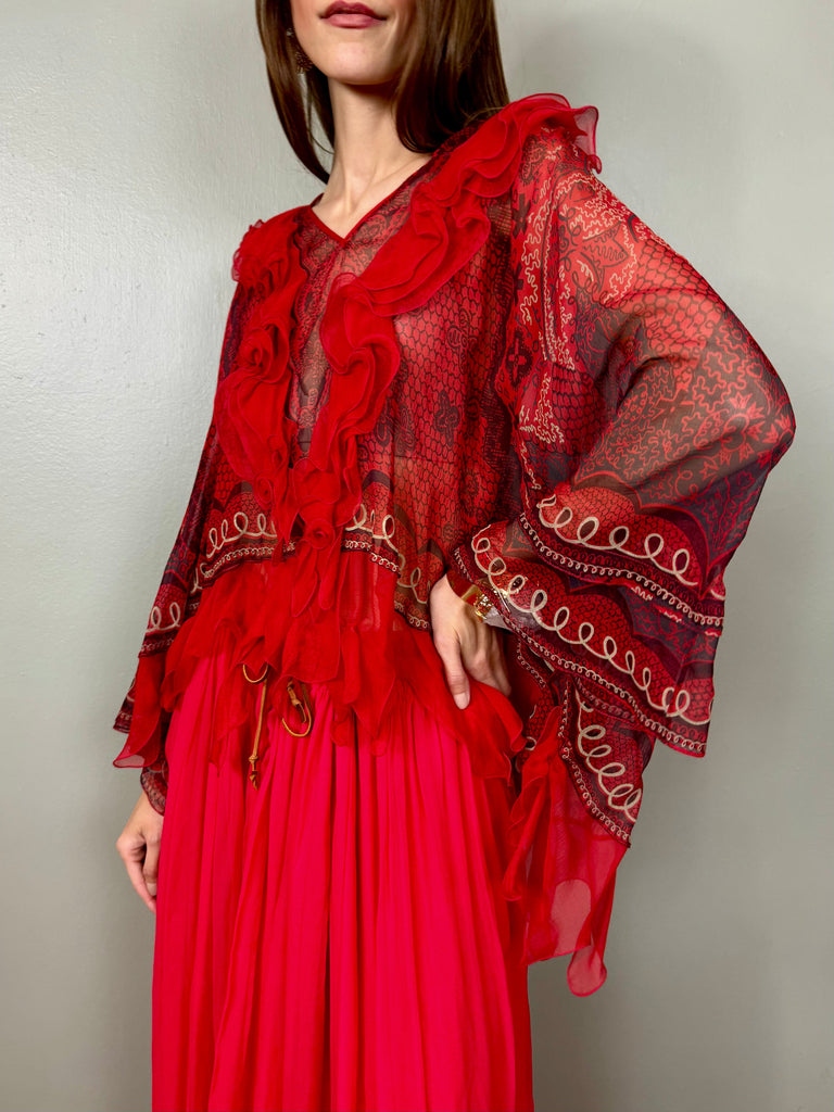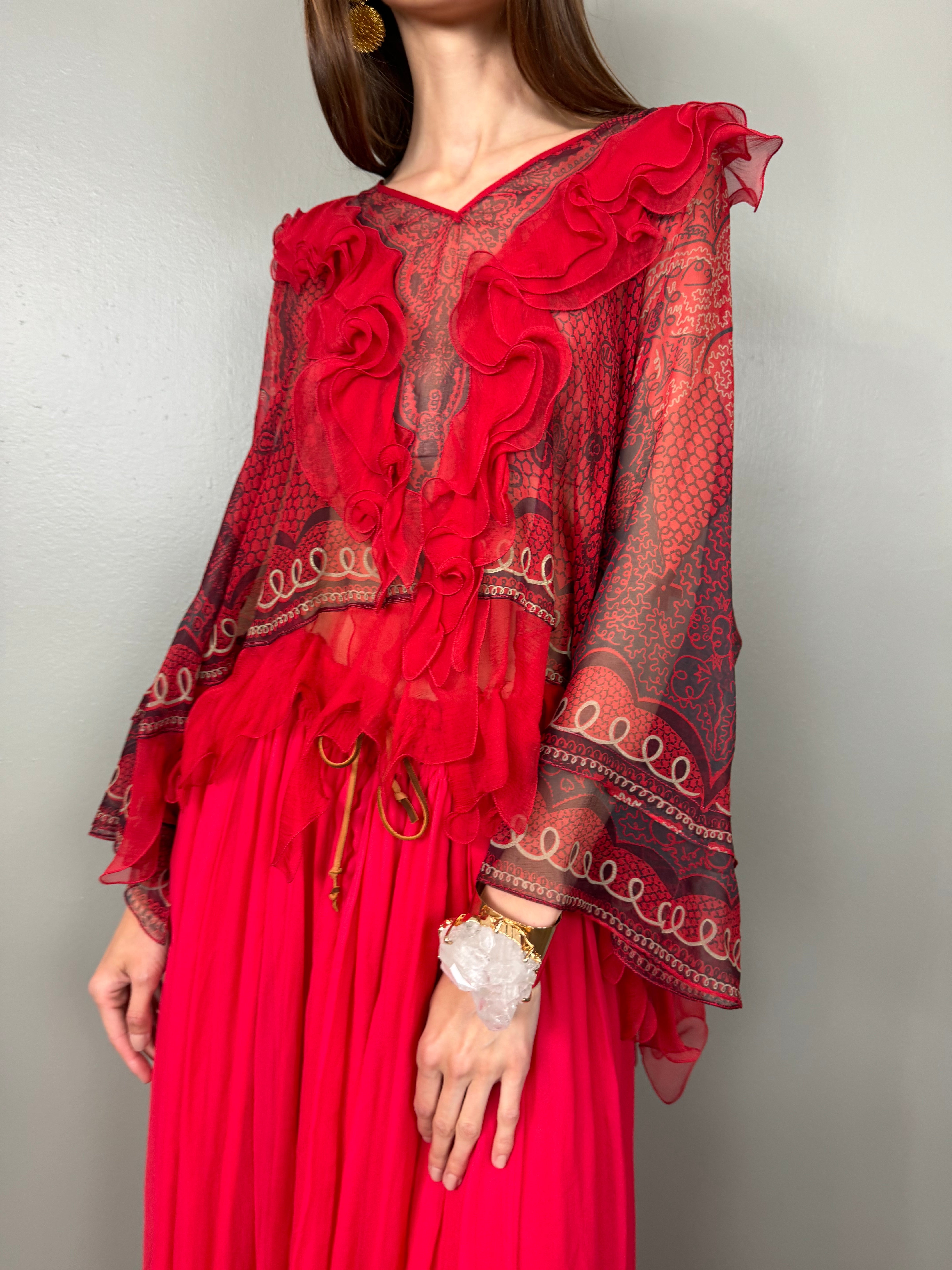 Experience timeless elegance with the Zandra Rhodes 70s chiffon print top. This iconic designer piece features a stunning red print, floaty long sleeves, and a unique V neckline with shoulder frill design. Elevate your style and make a statement with this one-of-a-kind top. Has a missing label but is identified by the iconic print.