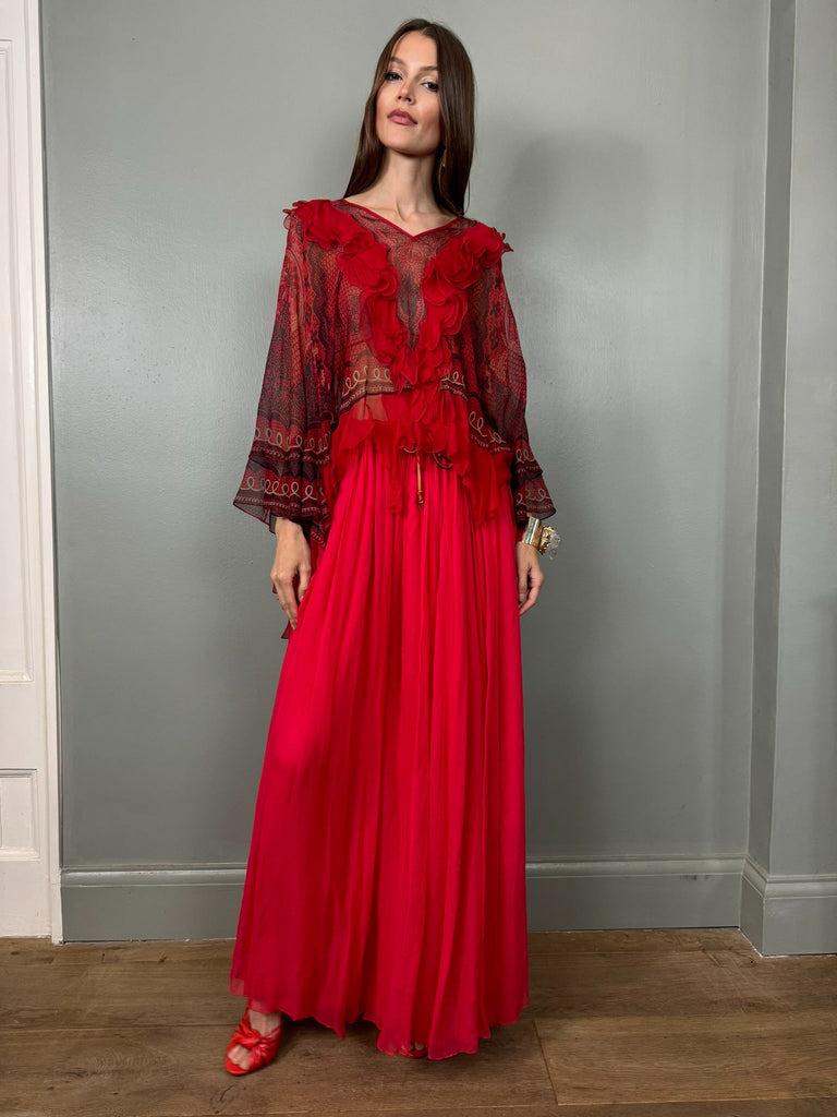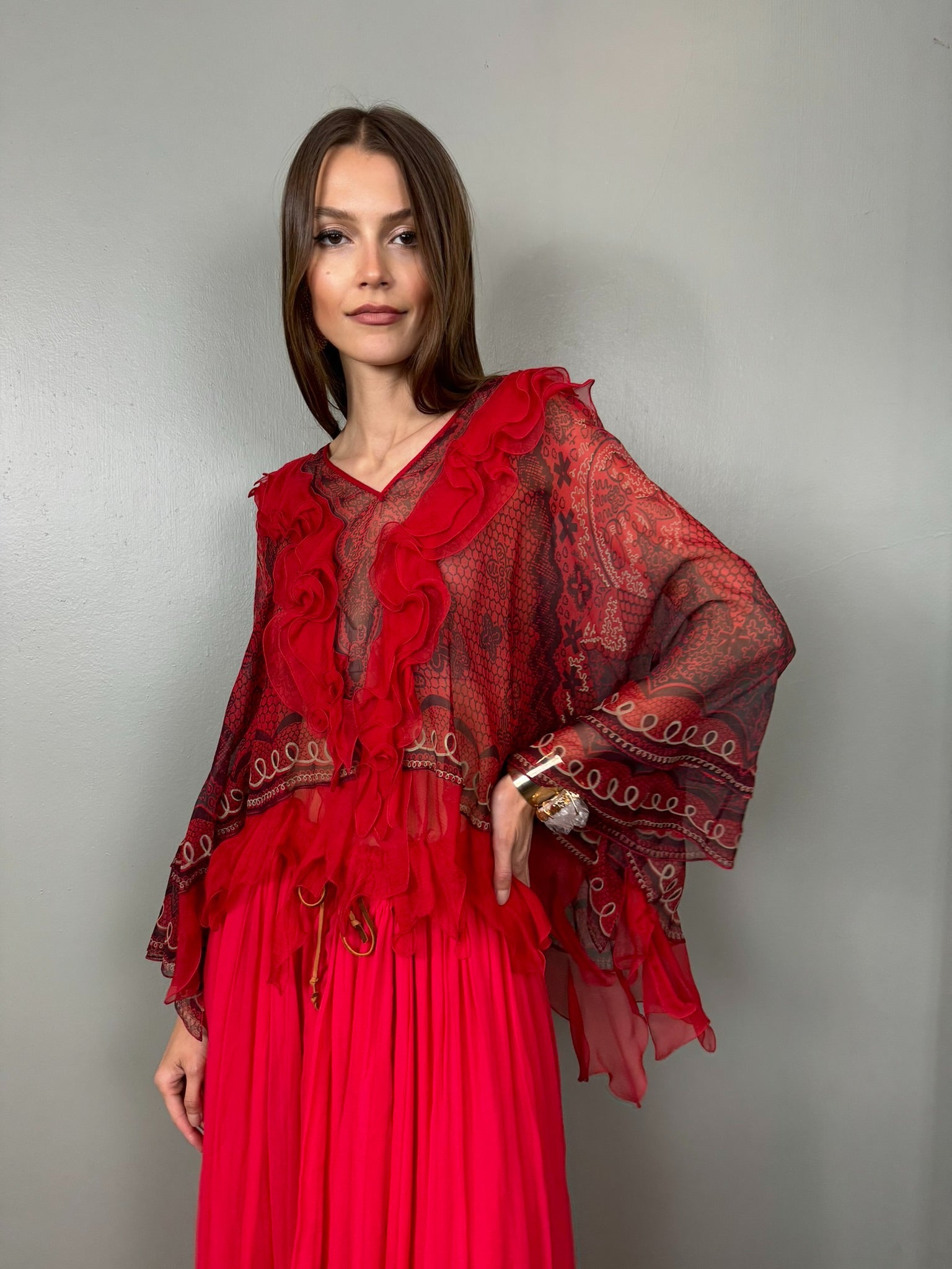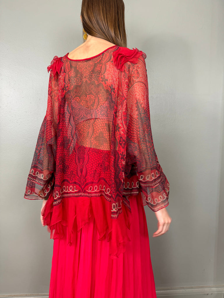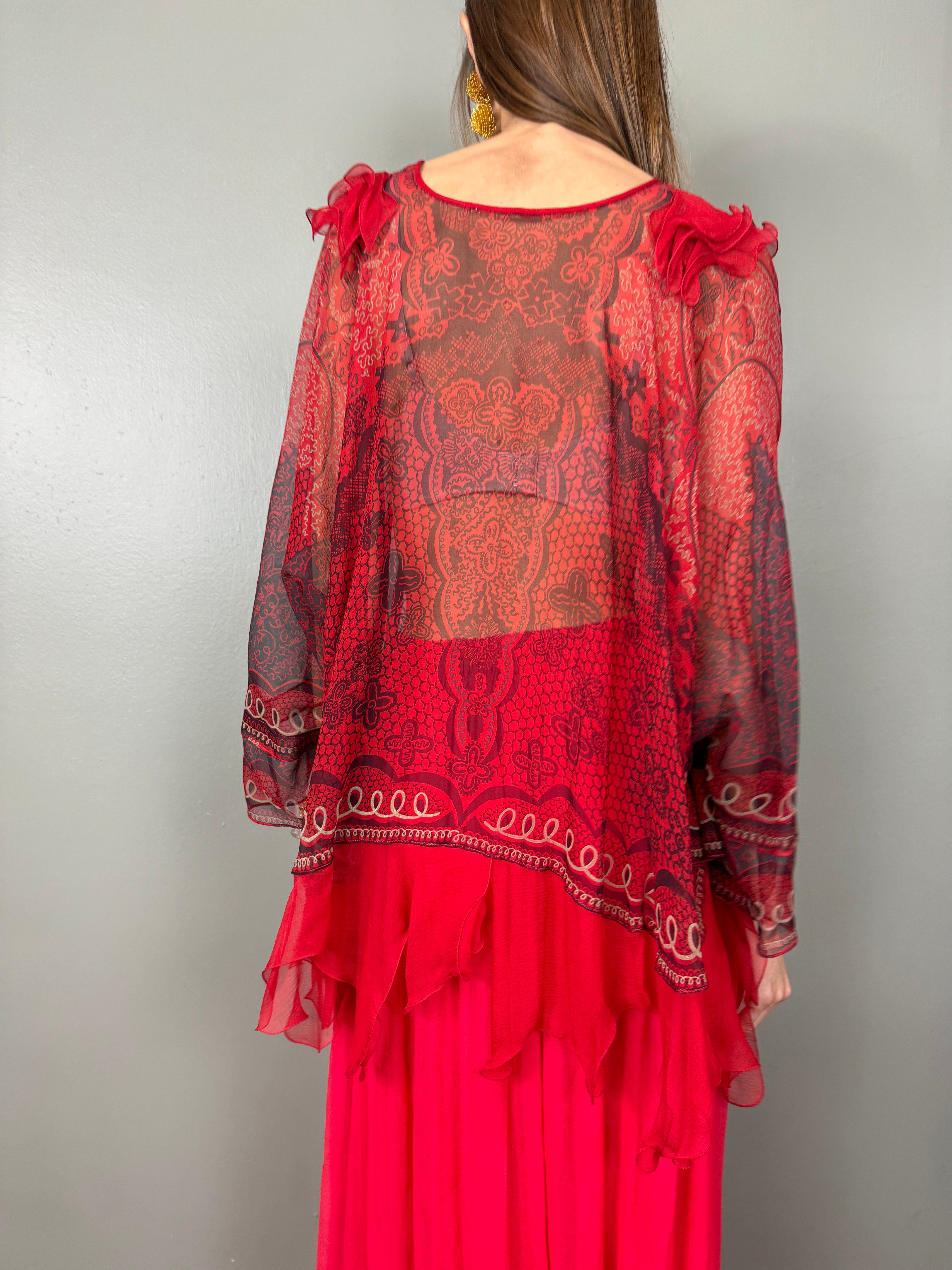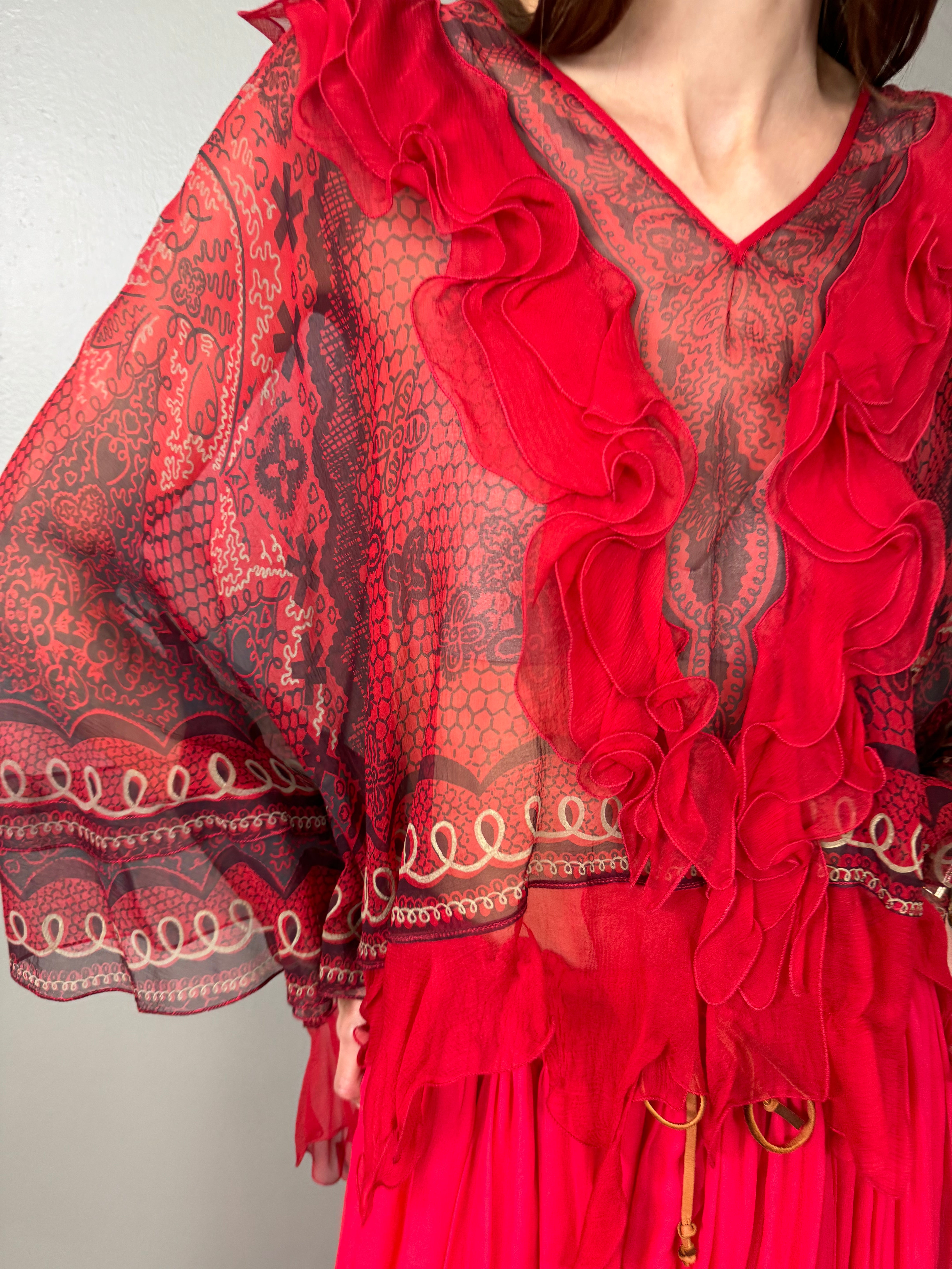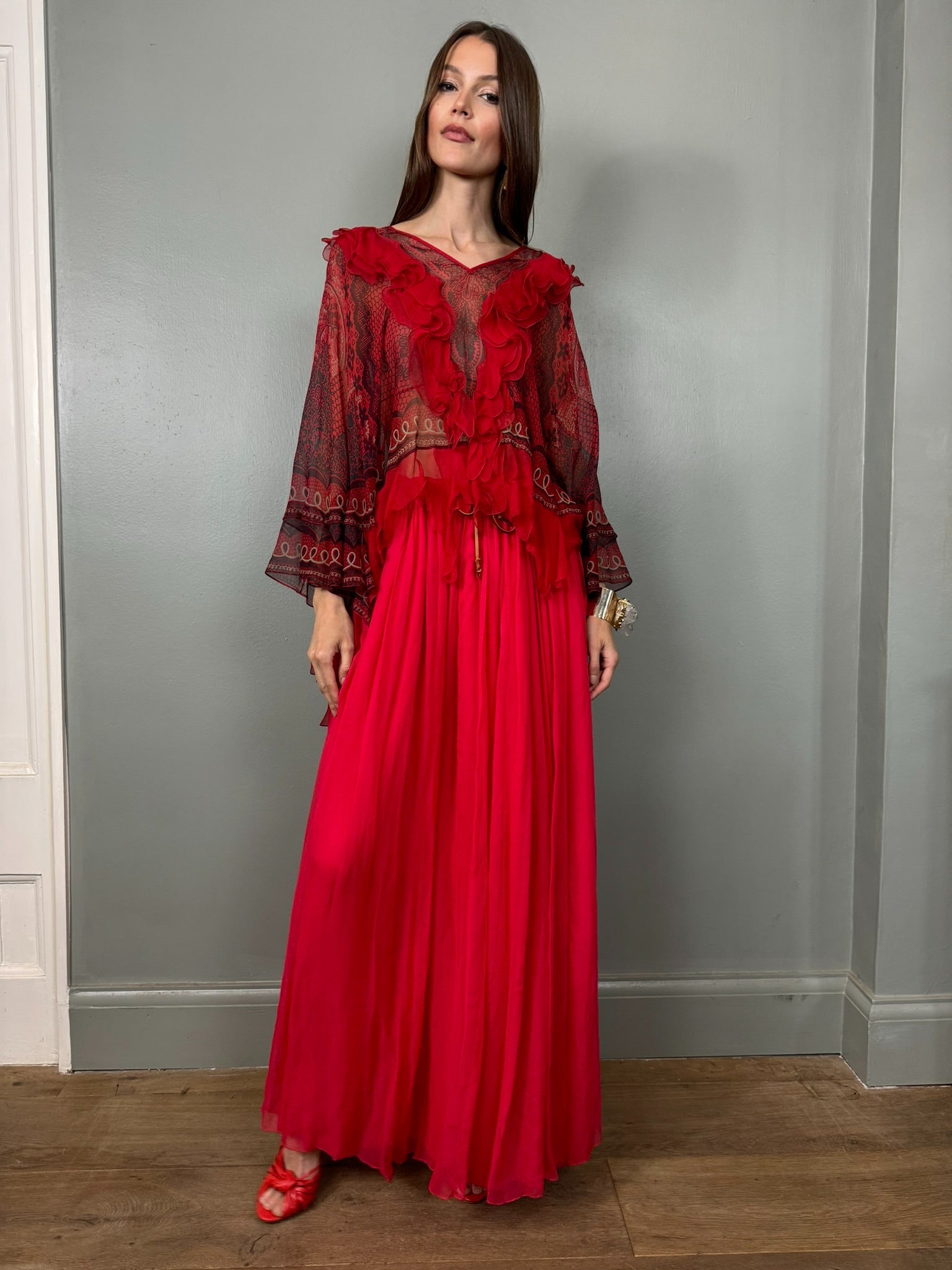 Experience timeless elegance with the Zandra Rhodes 70s chiffon print top. This iconic designer piece features a stunning red print, floaty long sleeves, and a unique V neckline with shoulder frill design. Elevate your style and make a statement with this one-of-a-kind top. Has a missing label but is identified by the iconic print.