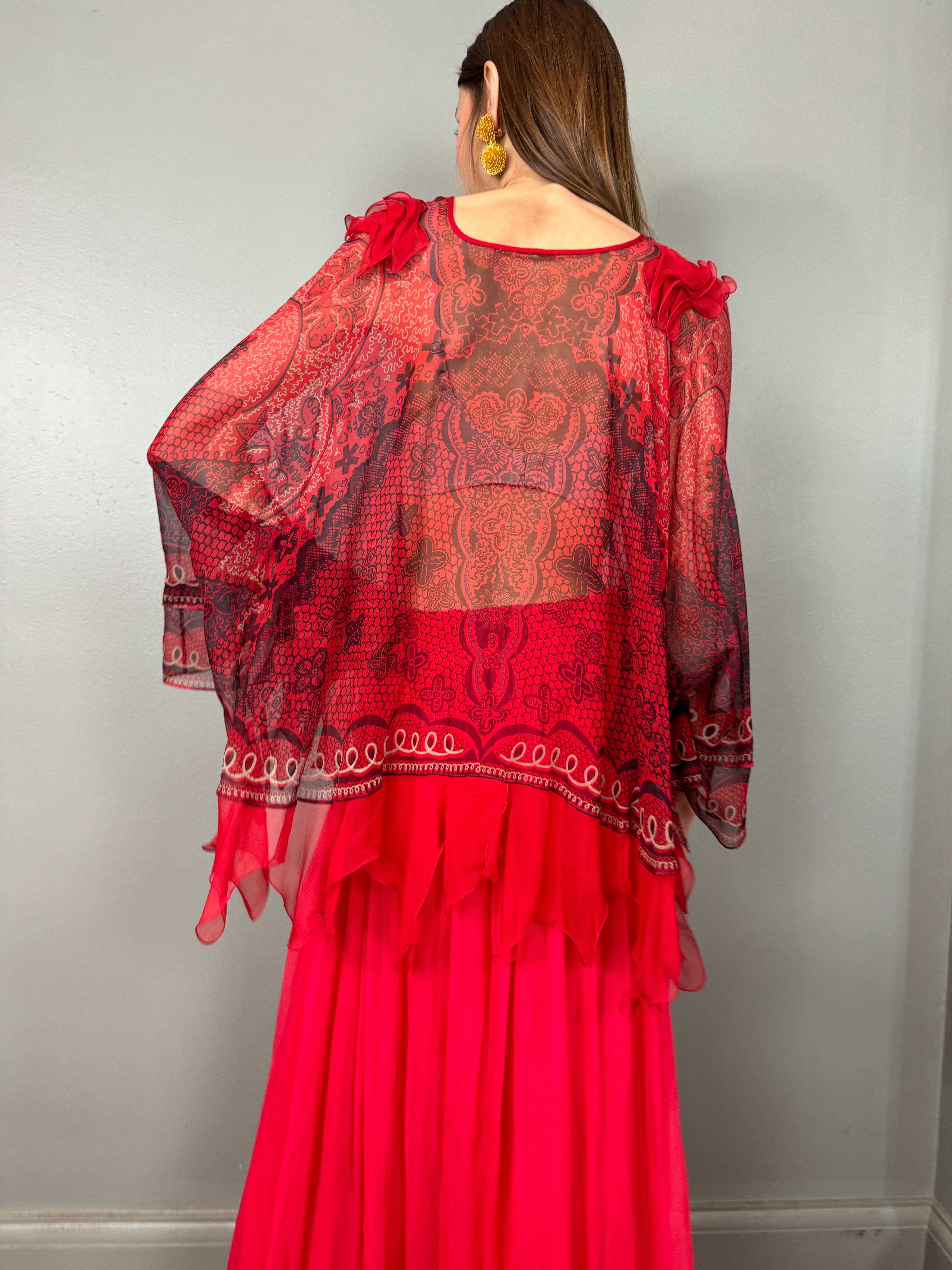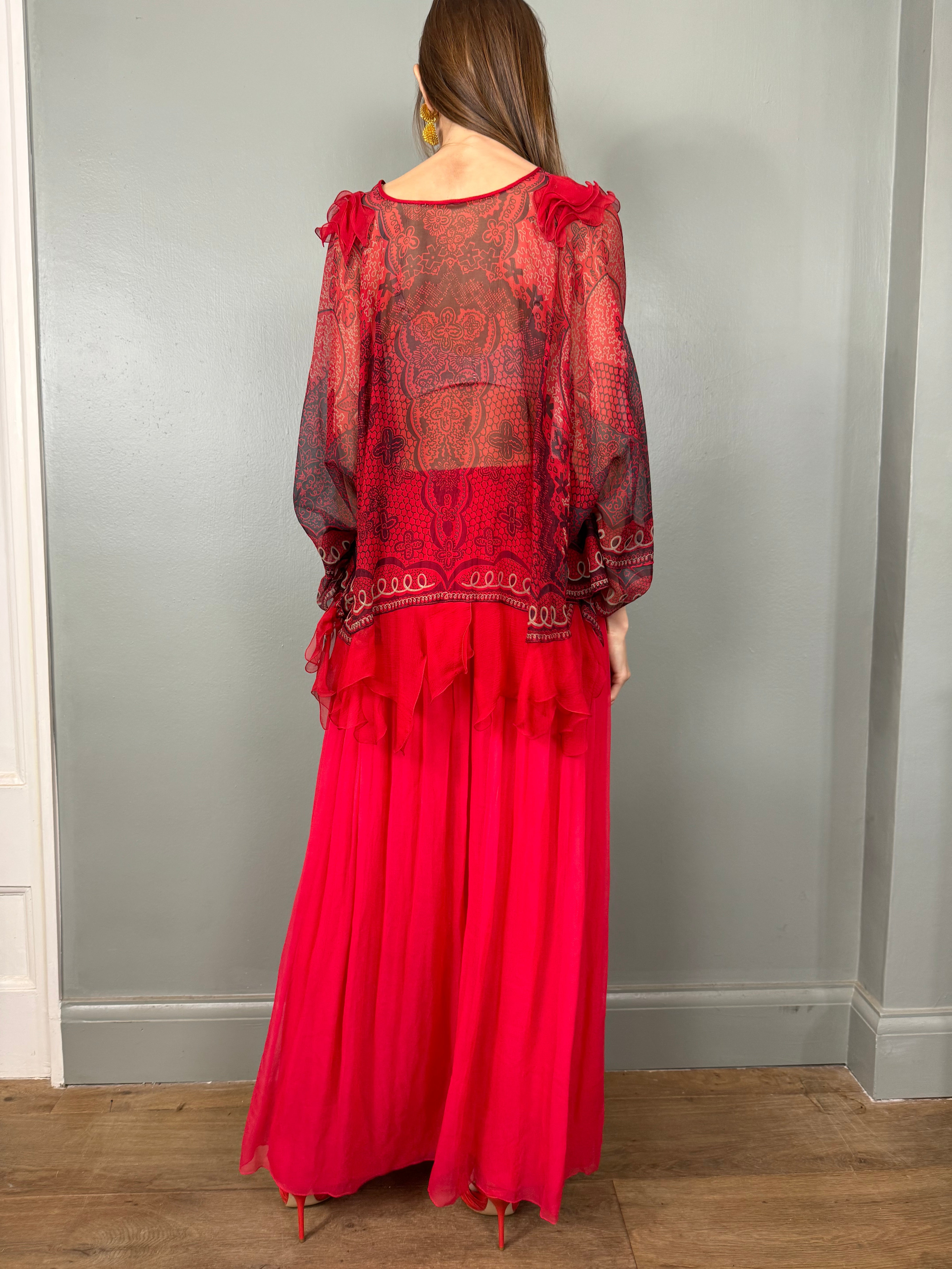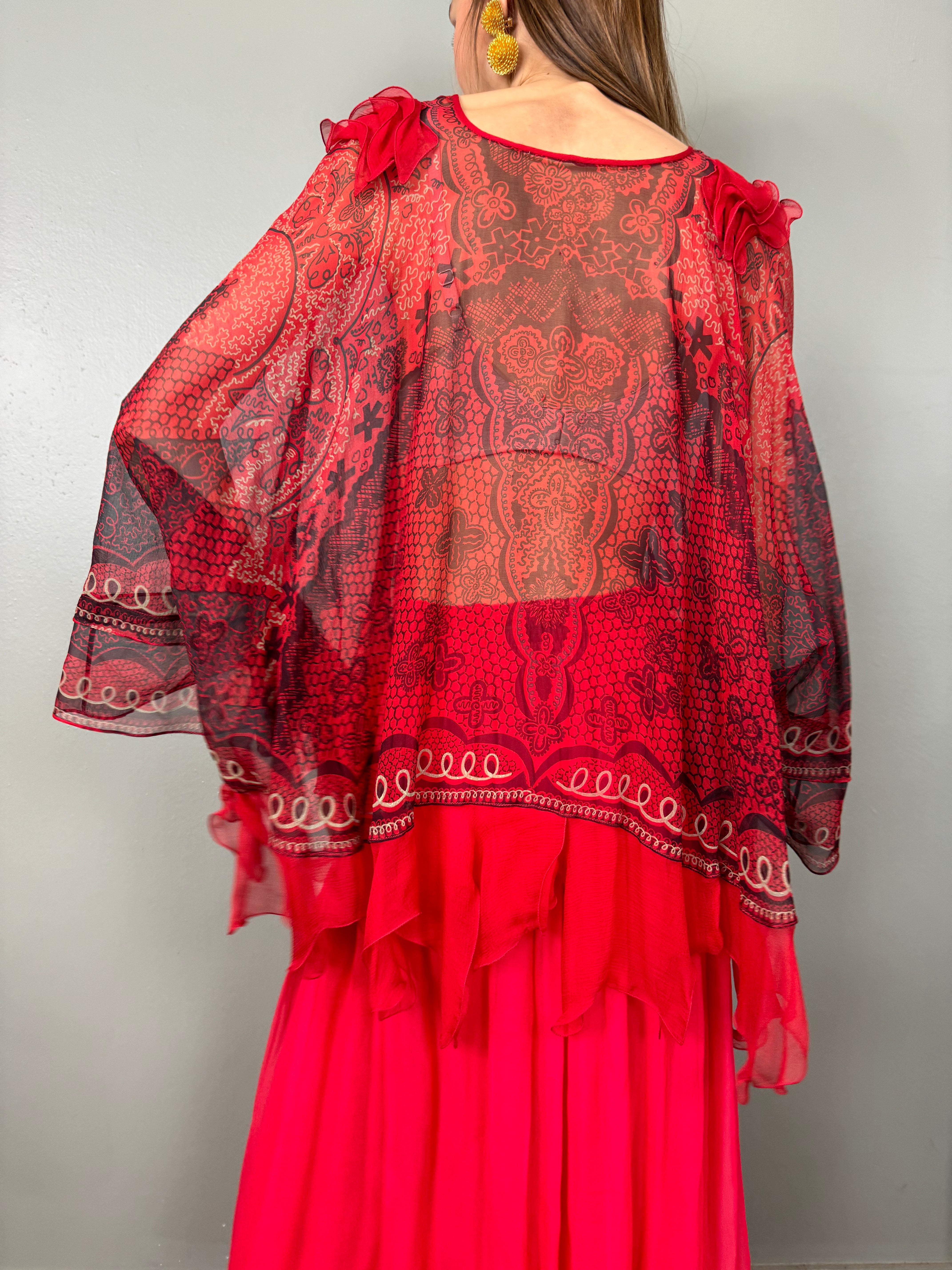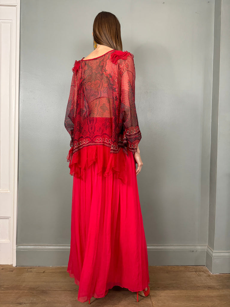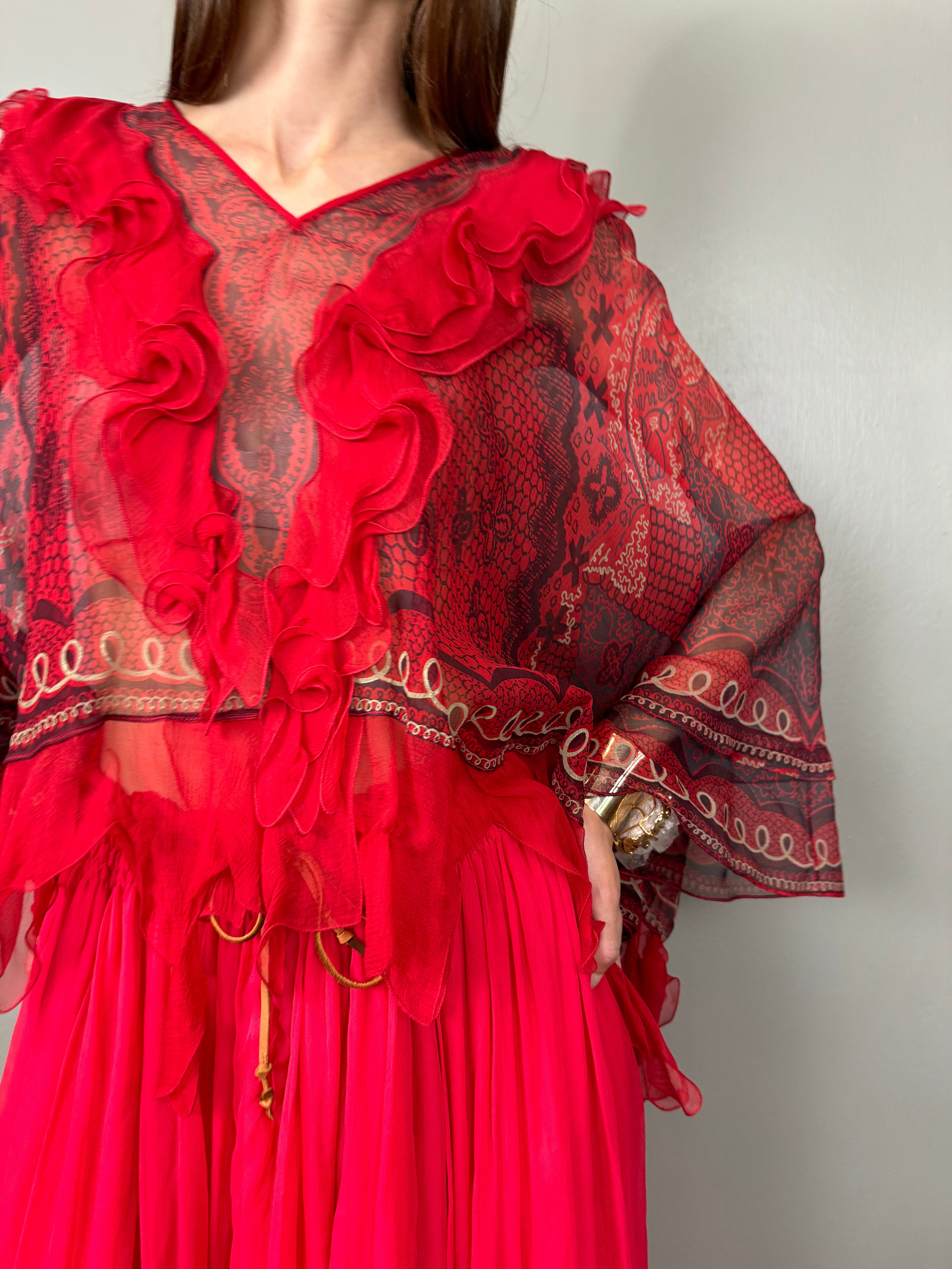 Experience timeless elegance with the Zandra Rhodes 70s chiffon print top. This iconic designer piece features a stunning red print, floaty long sleeves, and a unique V neckline with shoulder frill design. Elevate your style and make a statement with this one-of-a-kind top. Has a missing label but is identified by the iconic print.