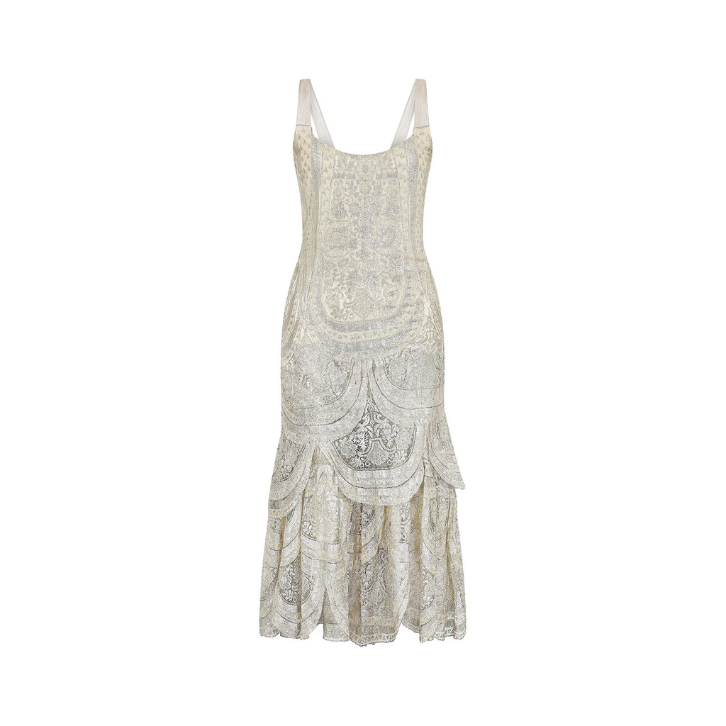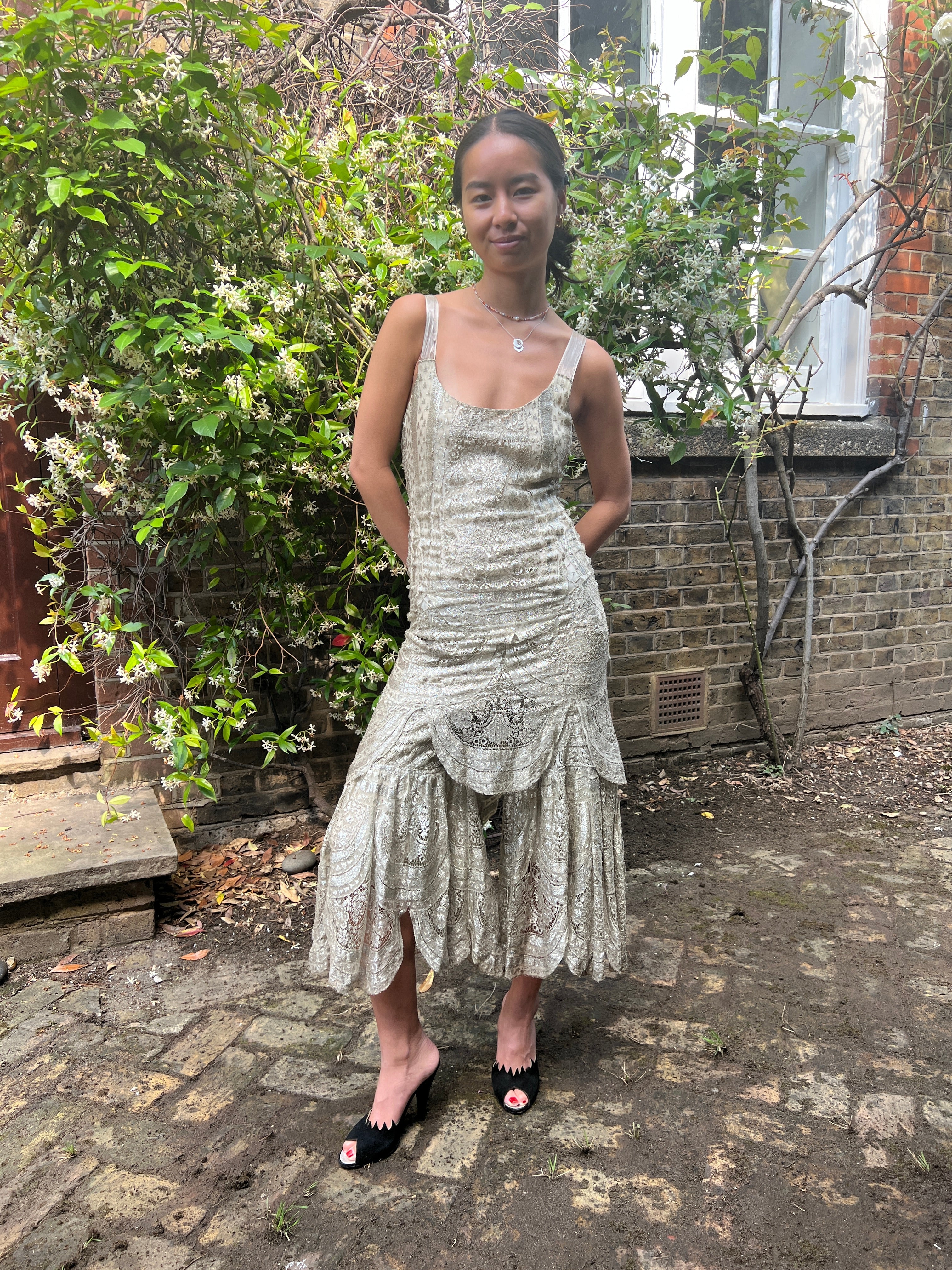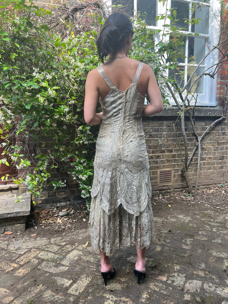 A century old, it is rare that a piece of this delicacy survives. No labels are left in the dress but she has been very well manufactured. Please note that we have expertly repaired some of the breaks in the dress torso since she was photographed so refer to the model shots as these better reflect the condition. Overall, the dress is very good for her age and she can be worn with care. The lining is original and in excellent condition with no stains or holes - quite remarkable. The straps are a well matched replacement and could be quite modern. The silver lame is good to very good overall and without tarnish; the colour has mellowed over the years and the silk mesh interwoven with the lame threads has darkened allover. There a number of areas where this element of the fabric is splitting but due to the extraordinary design of the lame this isn't noticed when worn - large areas of the lame are excellent. It's painstaking work but the mesh could be backed to strengthen through conservation or replaced. We're comfortable with the level of preservation and effort we have put in to get her wearable or for display purposes but anymore than this should be decided by her future owner. She can certainly be enjoyed just as she is.