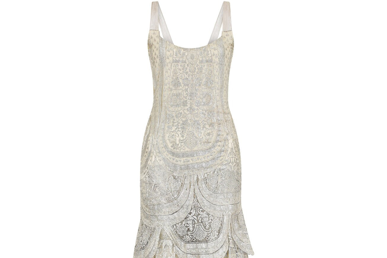 Tailored to a classic 1920s drop-waist silhouette, this is a rare surviving culottes dress from the earlier part of the flapper era and our oldest ever jumpsuit design! This antique piece features wide lame ribbon straps in shimmering silver. Intricate cobweb lame mimics the appearance of lace, with flowers, shell motifs and geometric shapes woven throughout. The top layer is sheer and the dress is lined with champagne silk with hook-and-eye closures at the rear. The bottom layer forms a pair of culottes. Very unusual for a piece of this time, these shorts are tailored and flared to a relaxed fit that means they could be mistaken for a midi-skirt. Falling delicately over the top of these, layers of petals form a skirt and create a scallop-like effect.
