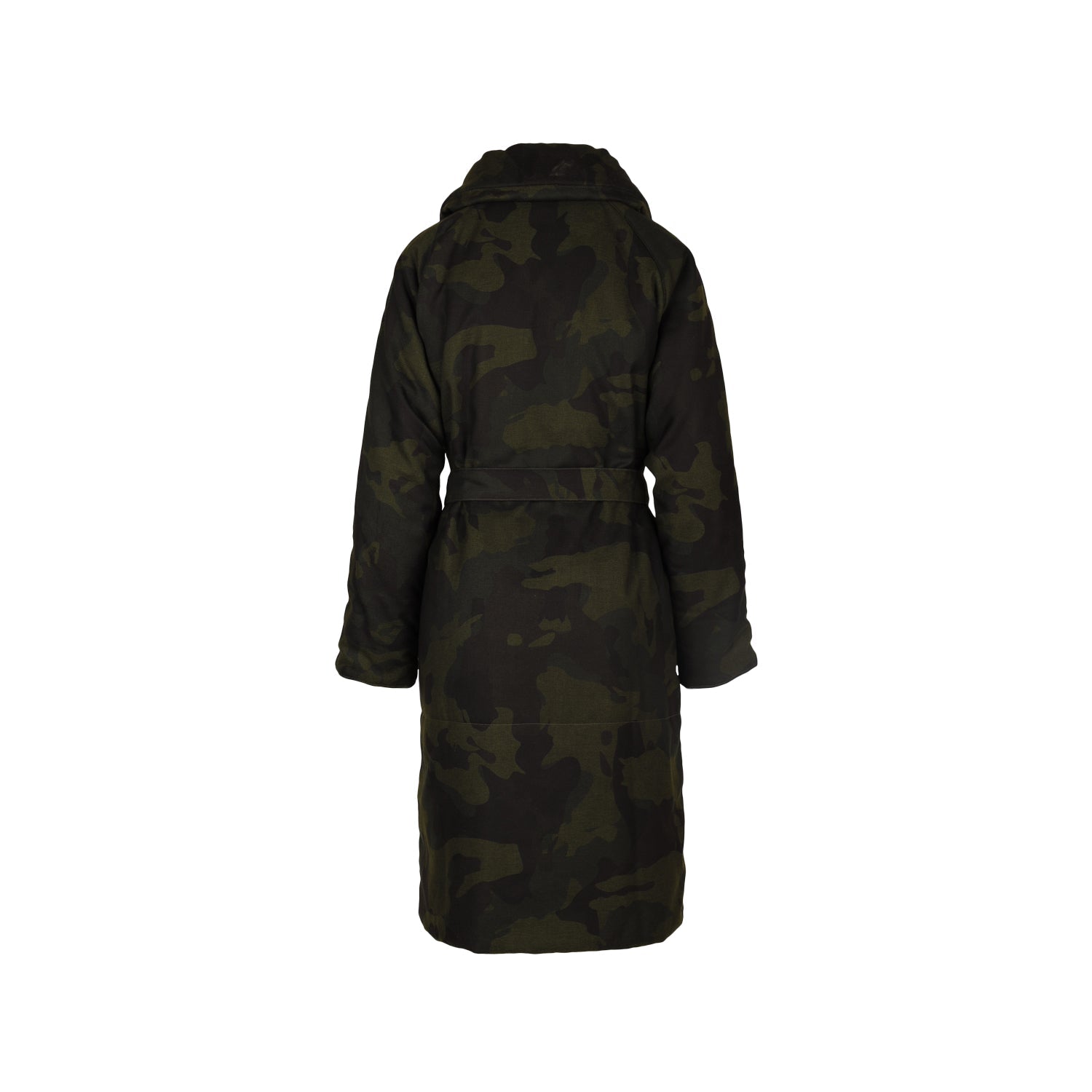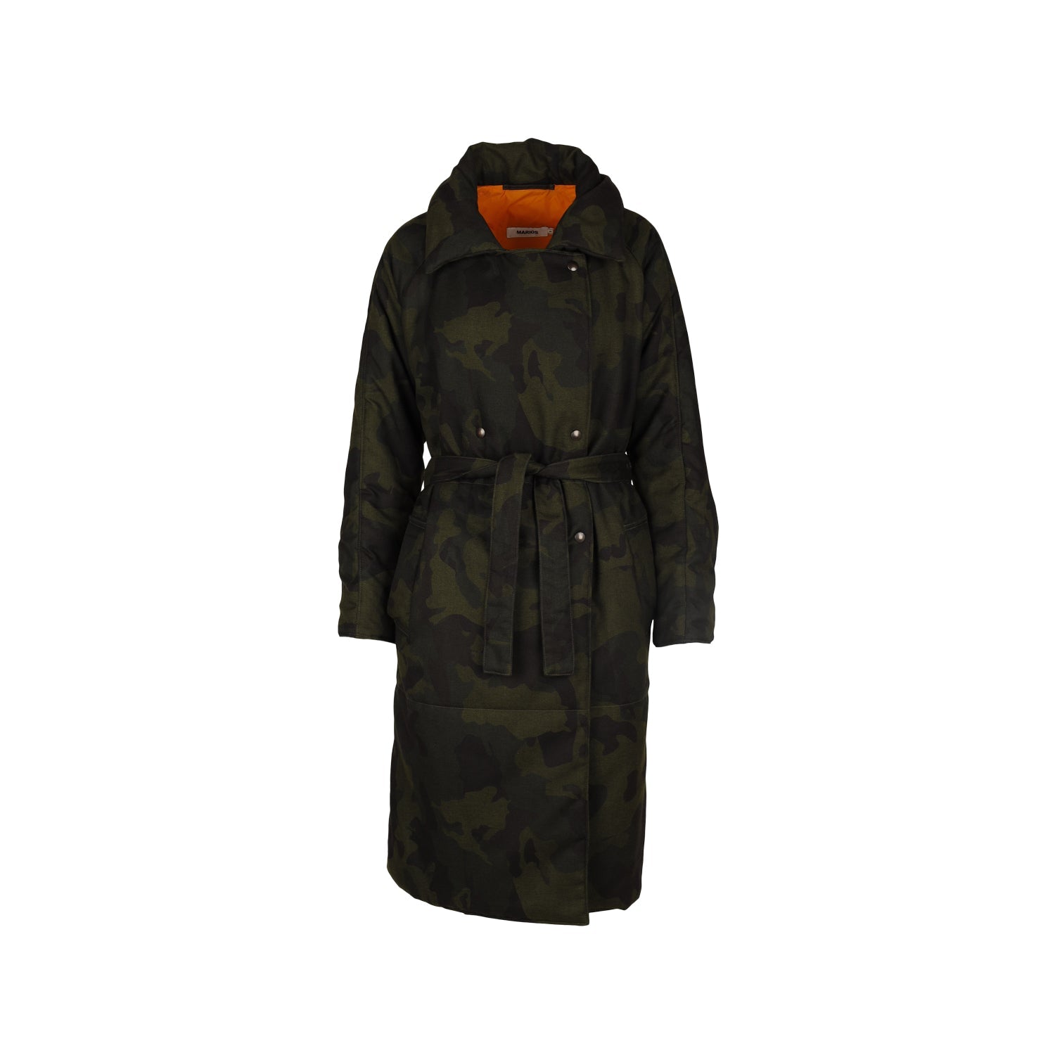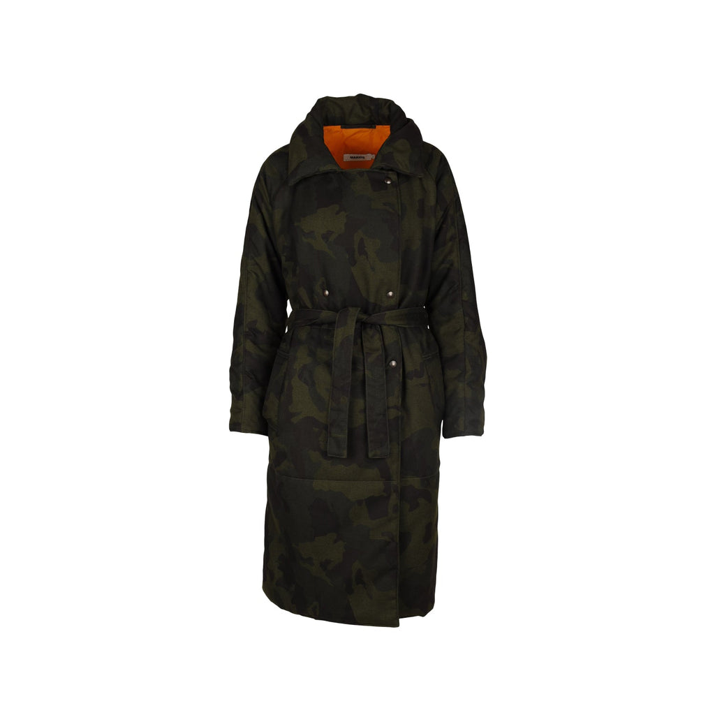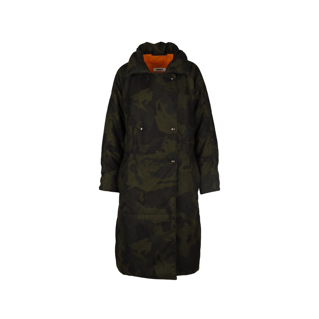 Marios military print long jacket with orange interior lining. Padded, large fit with two front pockets, long sleeves, button closure, and belt.