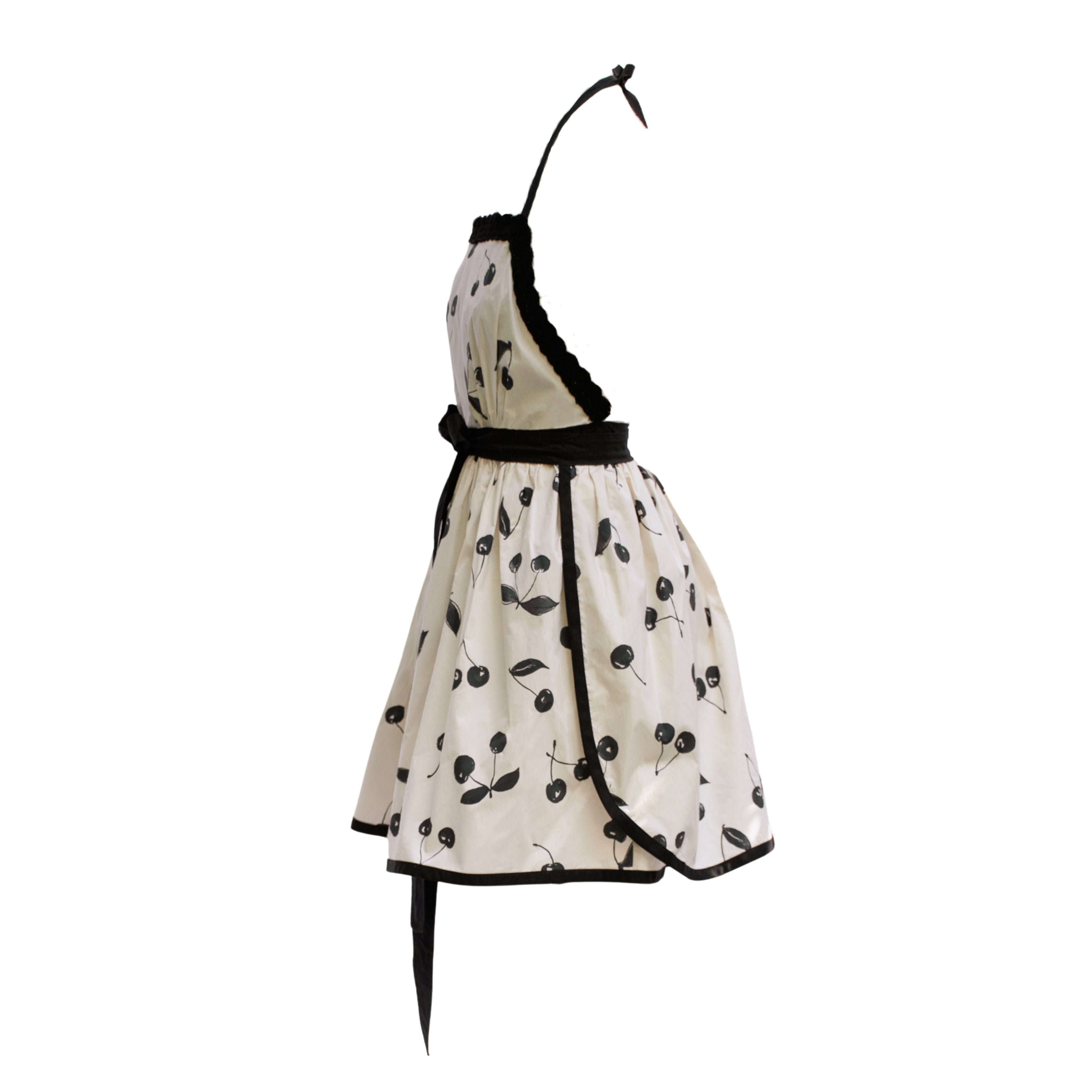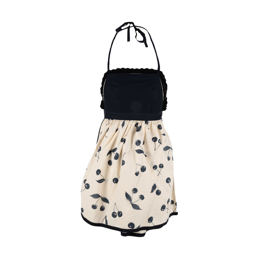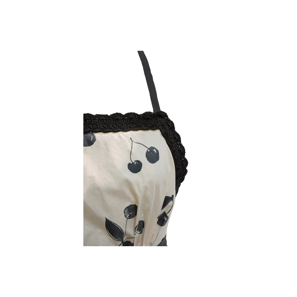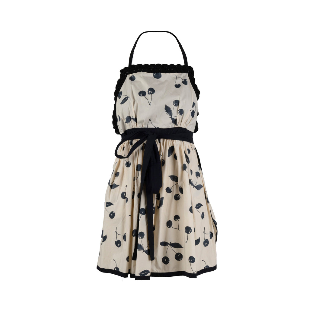 Short apron dress with straight neckline, in cotton poplin printed with all-over cherry motif. Crisscrossed at back and adjustable at waist with ribbon belt in black cotton poplin, straps closed at neck, pockets inserted at hips. Lined bodice in black cotton poplin with handmade crocheted neckline border in black cotton.