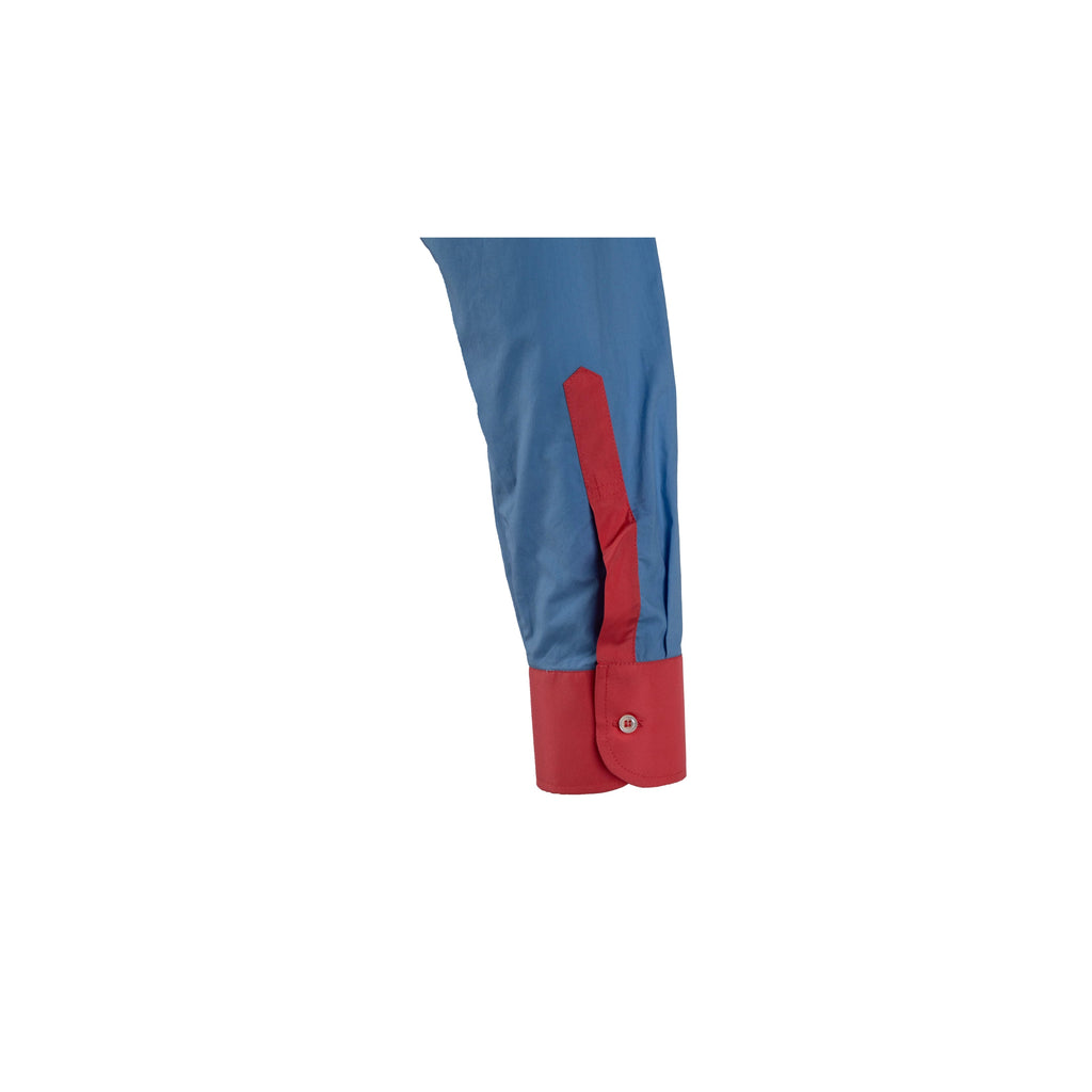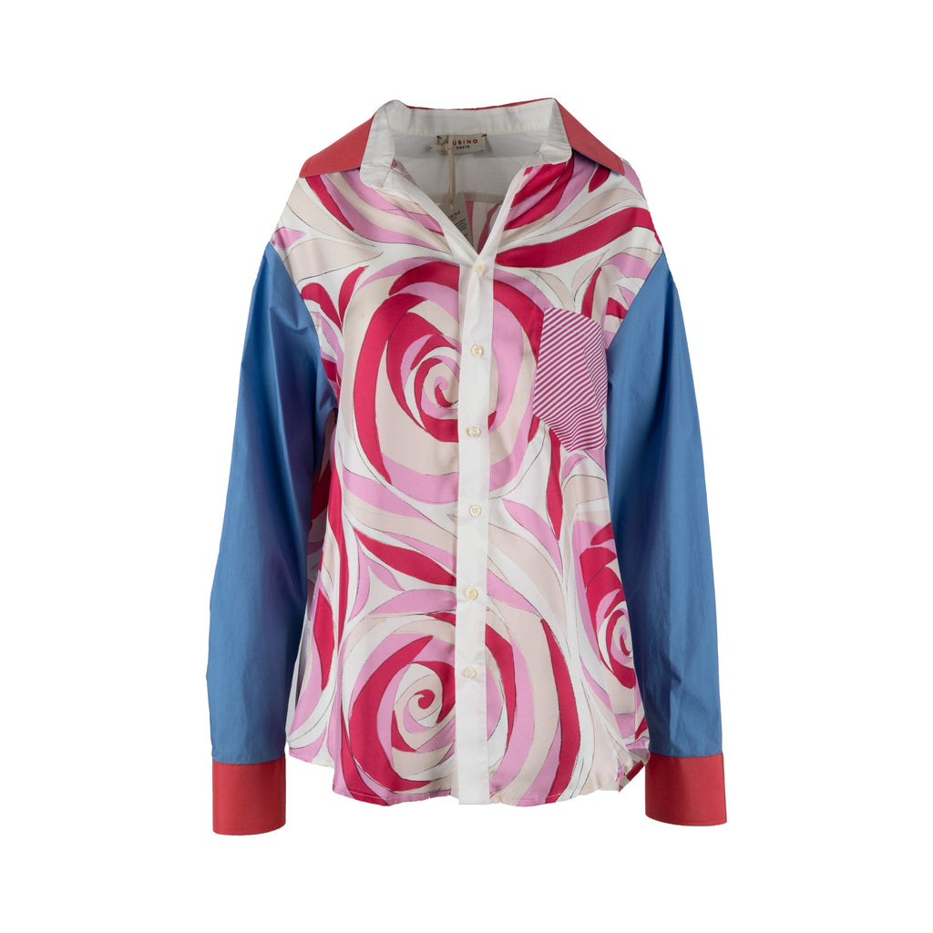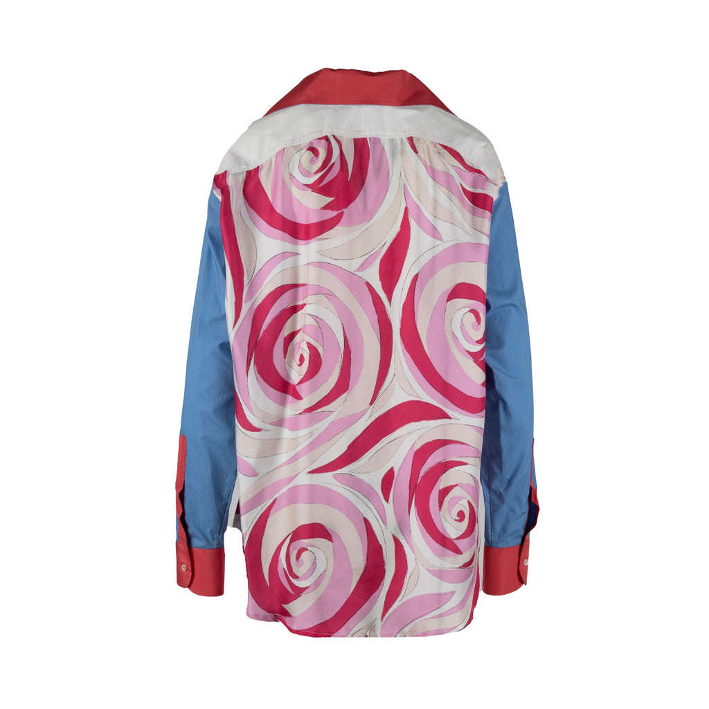 Double-buttoned shirt: classic or crossover adjustable waist with fabric strap. Made of washed and printed silk twill with all-over peony motif, sleeves in light blue cotton poplin, yoke and button stand in white cotton poplin, and patch pocket on front in striped cotton poplin. Collar, cuffs and strap in fuchsia polyester fabric. Natural mother-of-pearl buttons.