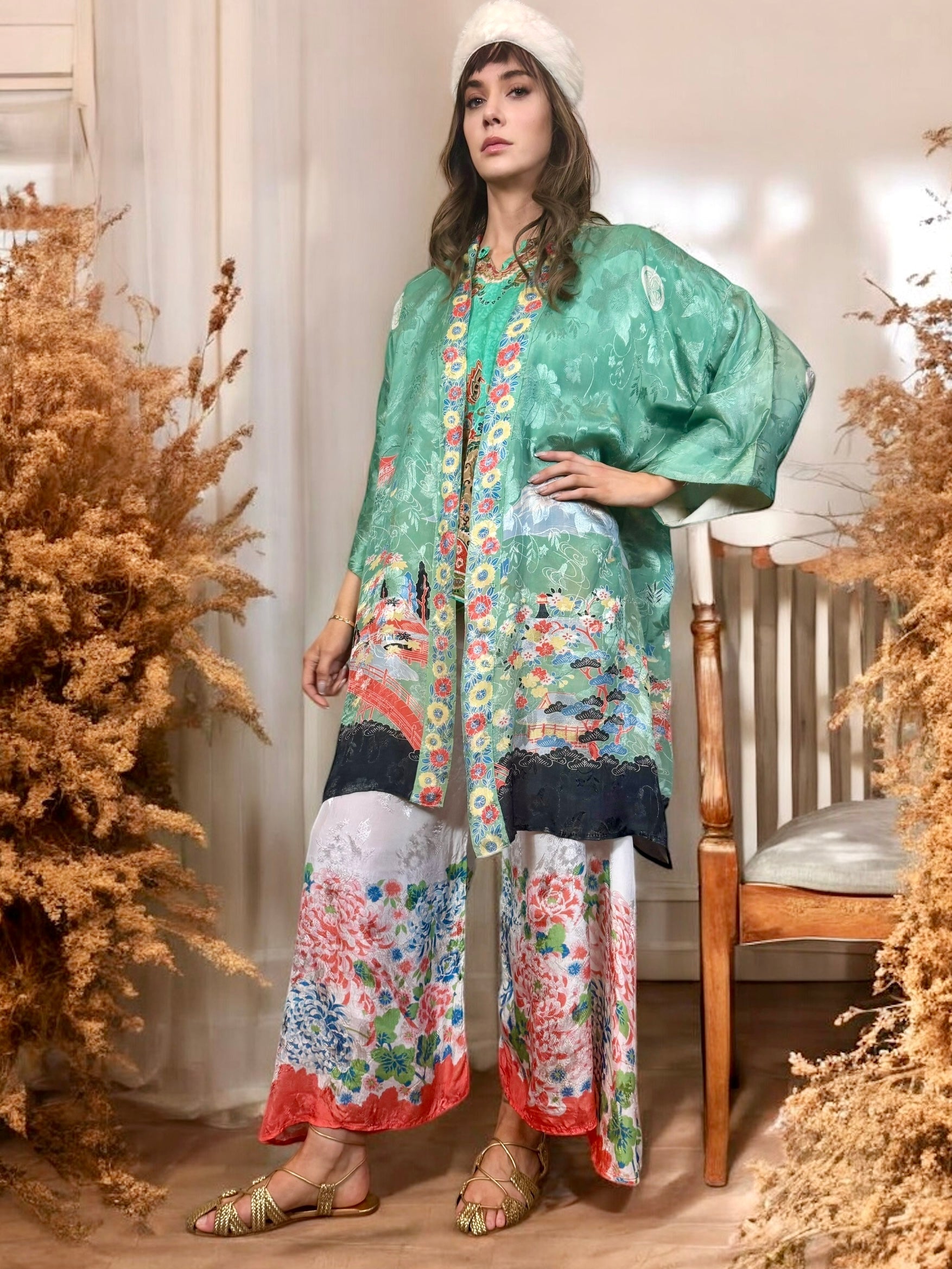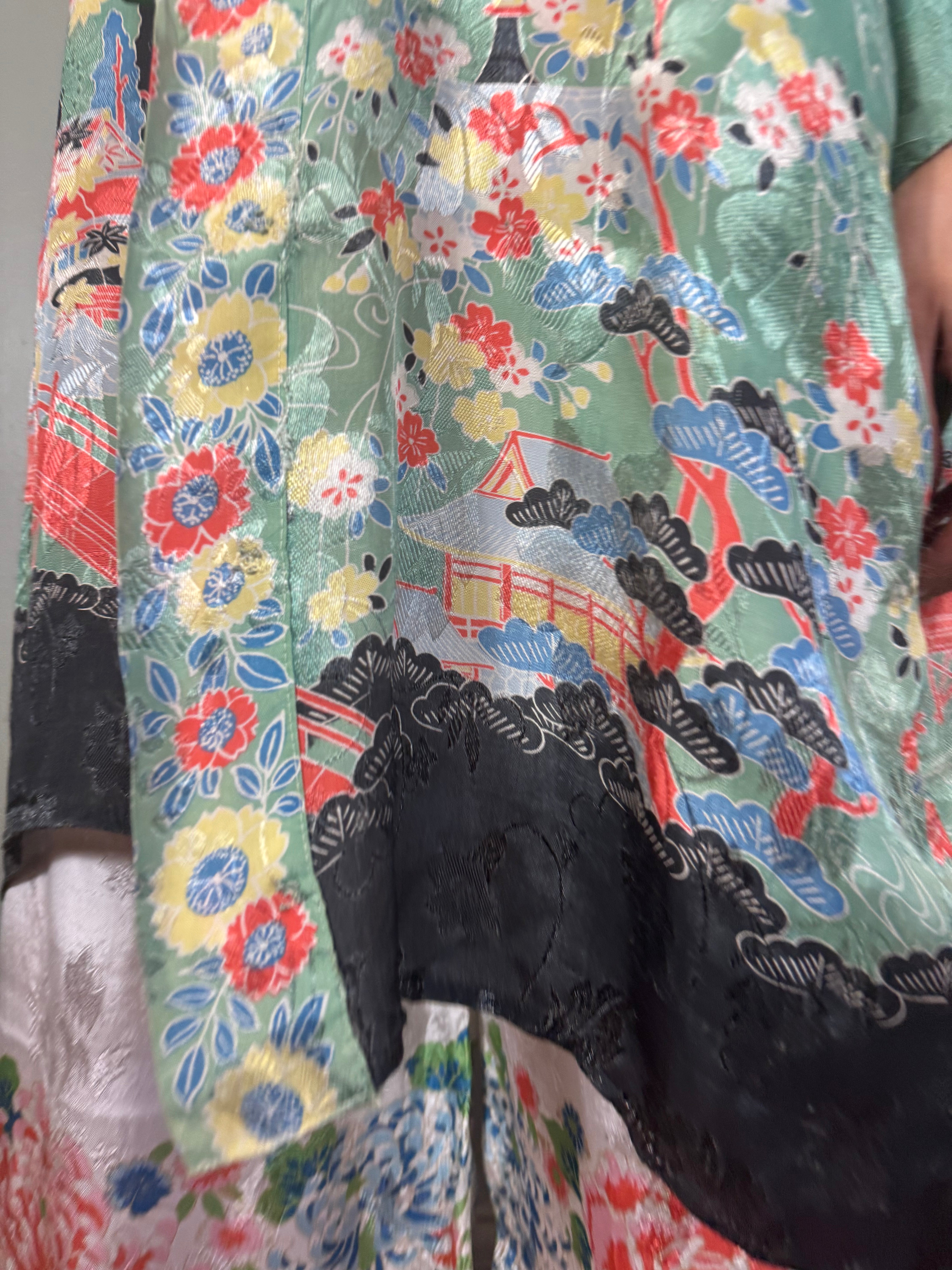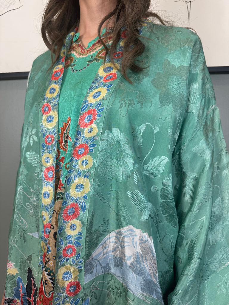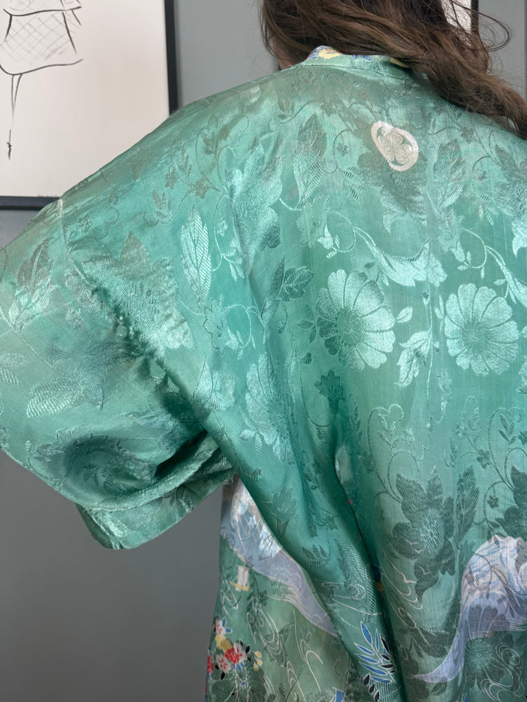 Introduce elegance and comfort to your wardrobe with this 30s pongee silk damask robe. The original floral design and pale green color provide timeless sophistication, while the long sleeves and loose fit offer ultimate comfort and effortless style.