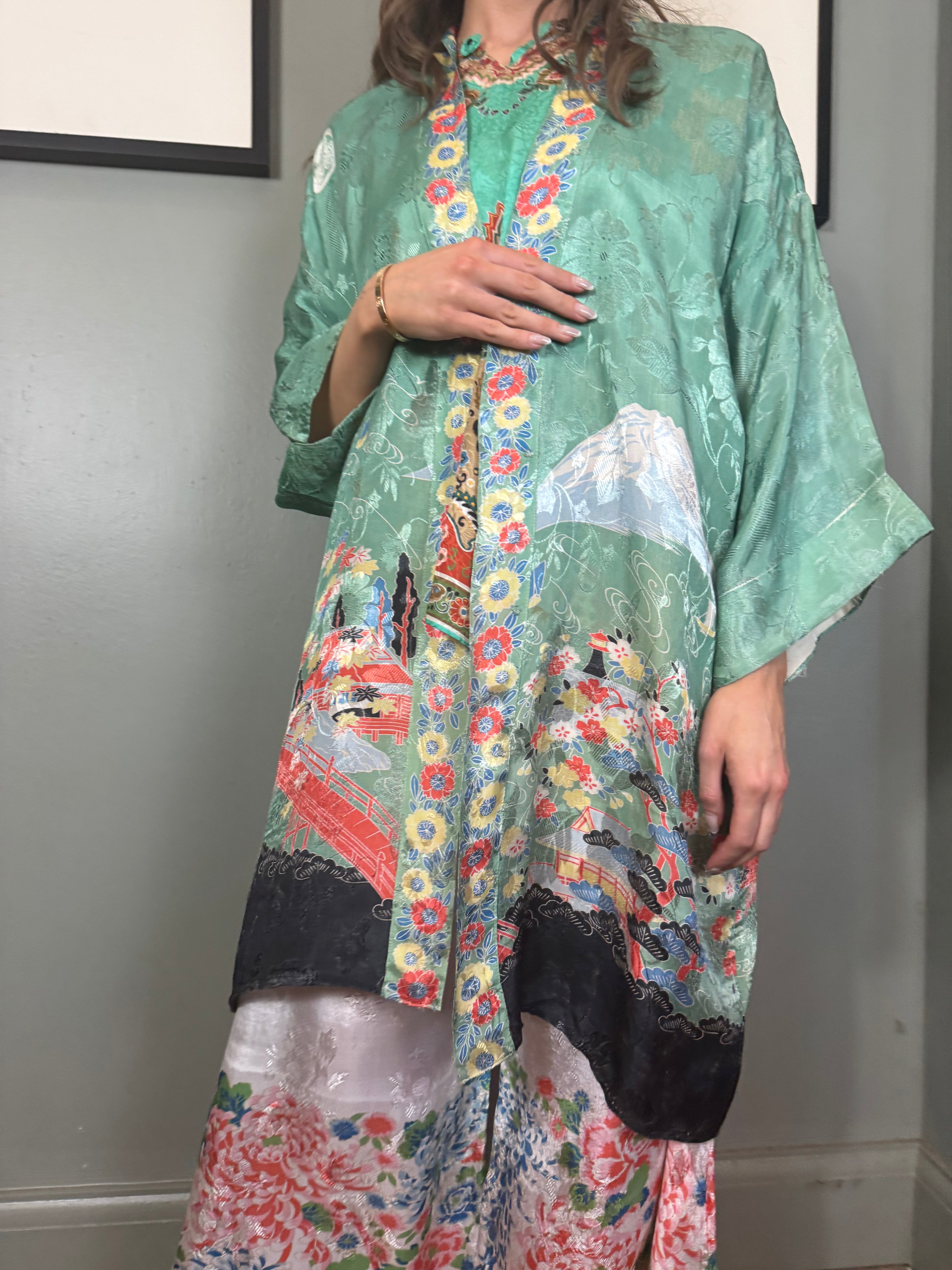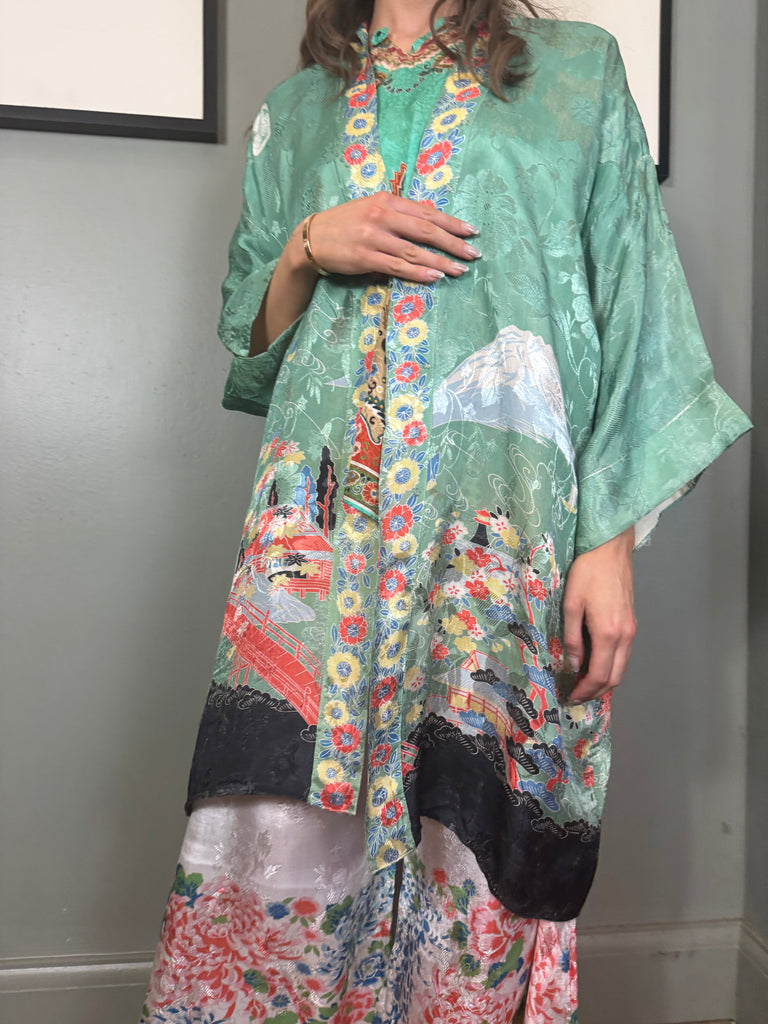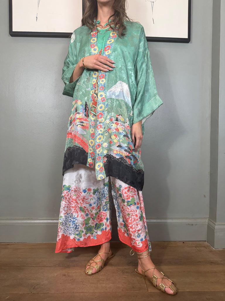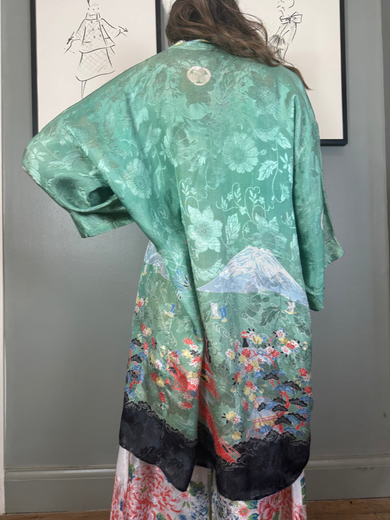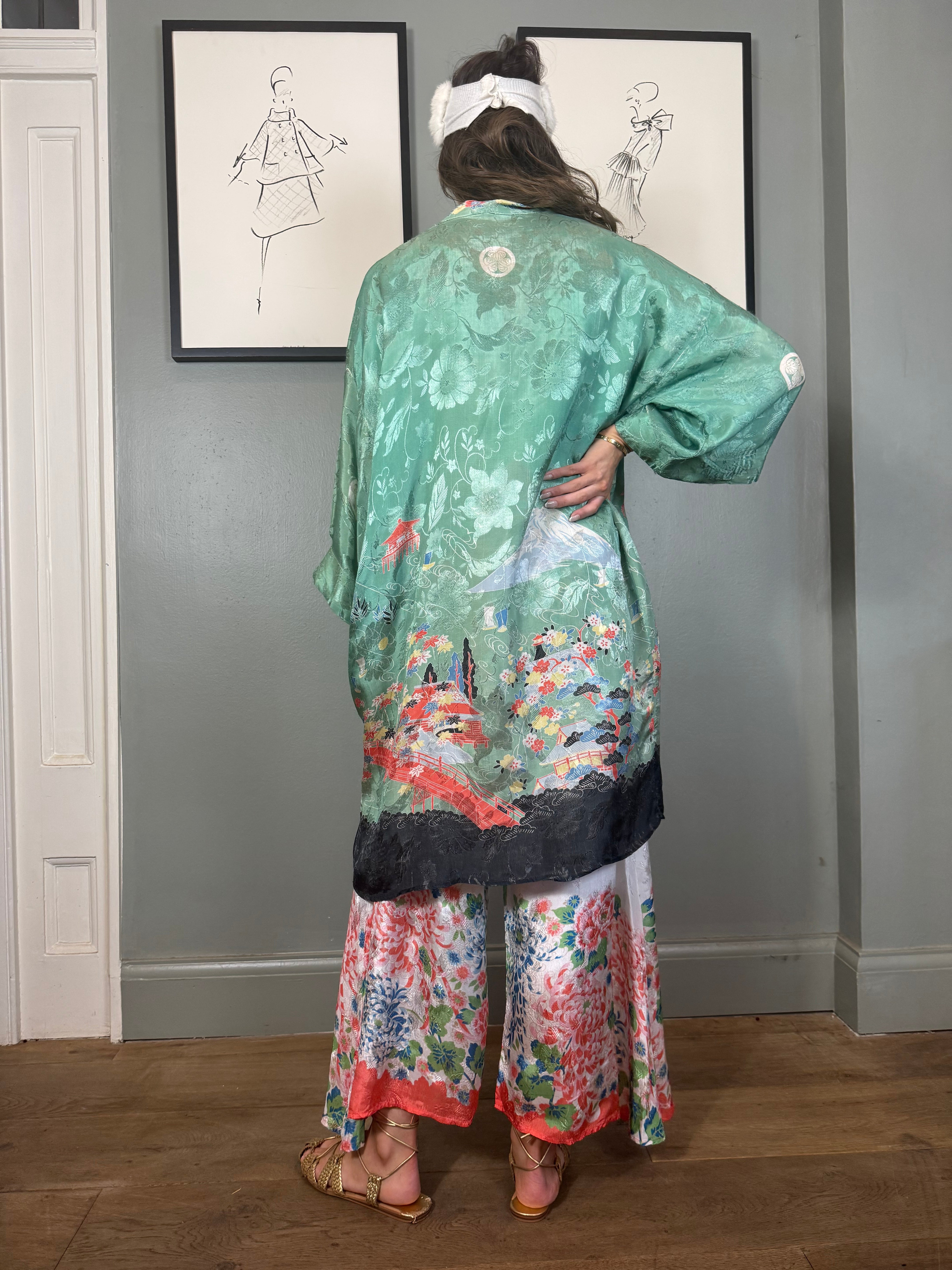 Introduce elegance and comfort to your wardrobe with this 30s pongee silk damask robe. The original floral design and pale green color provide timeless sophistication, while the long sleeves and loose fit offer ultimate comfort and effortless style.