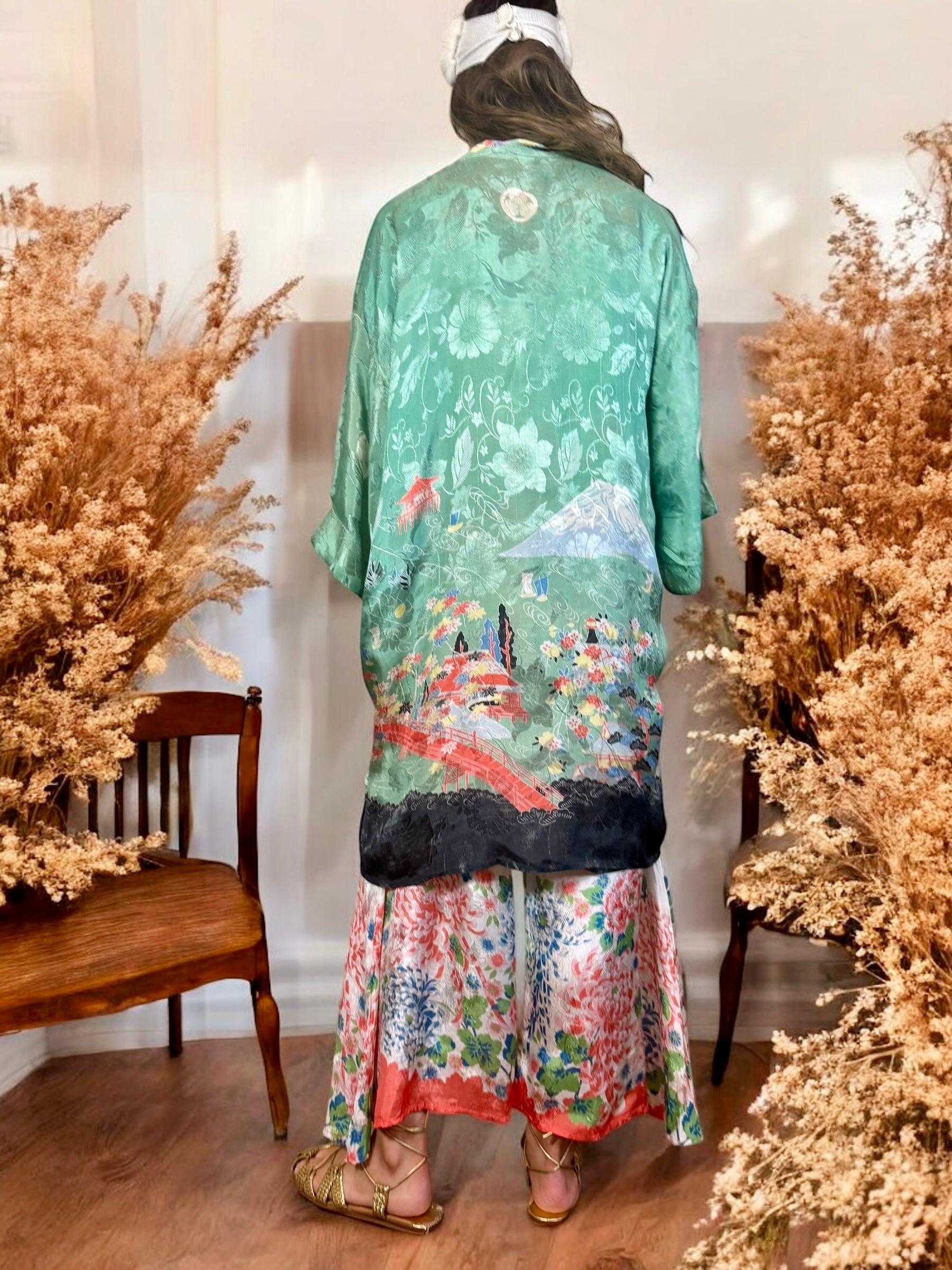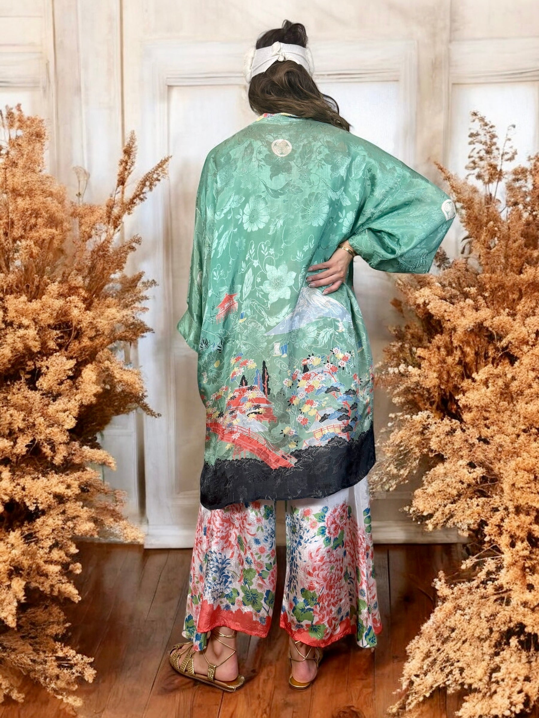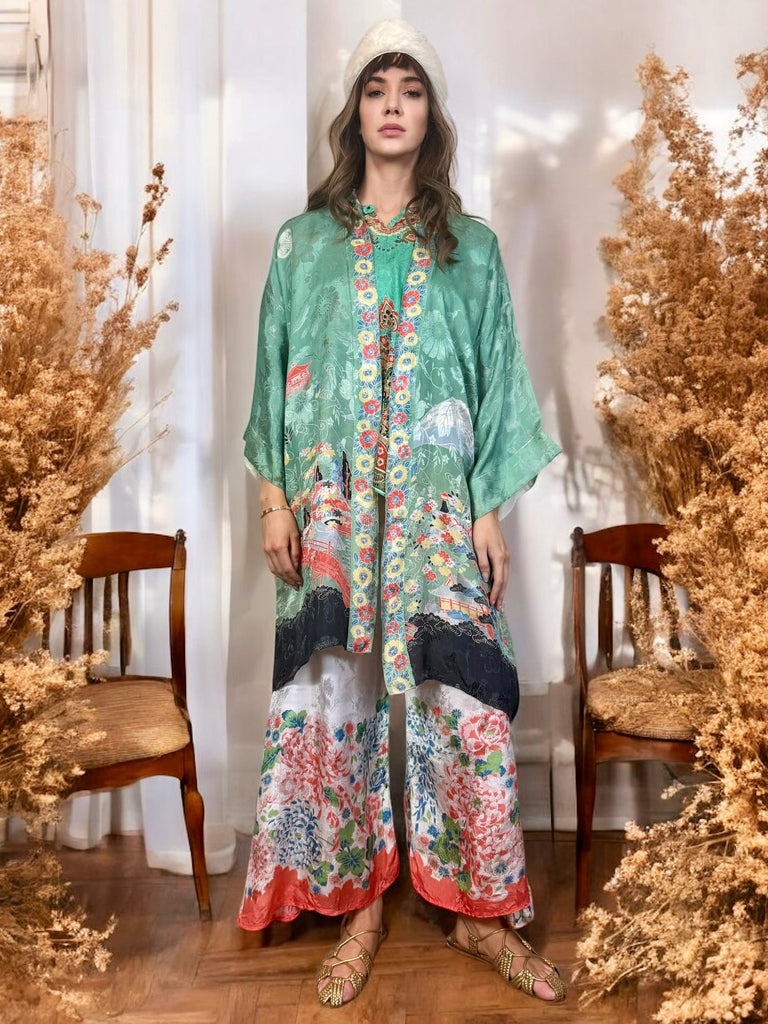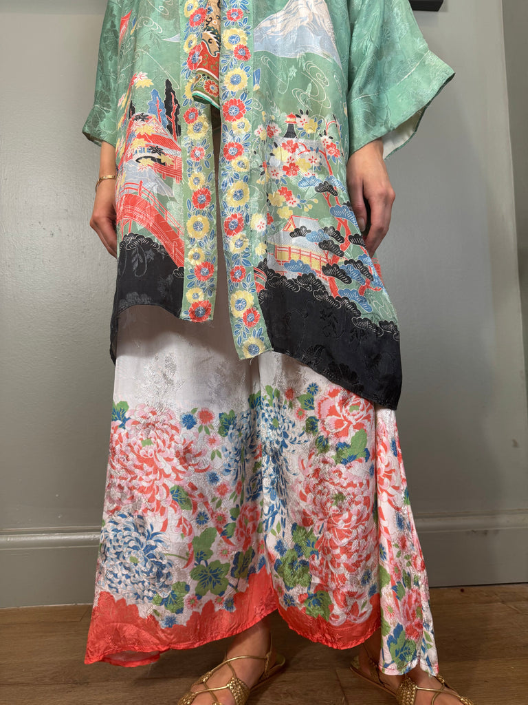 Introduce elegance and comfort to your wardrobe with this 30s pongee silk damask robe. The original floral design and pale green color provide timeless sophistication, while the long sleeves and loose fit offer ultimate comfort and effortless style.