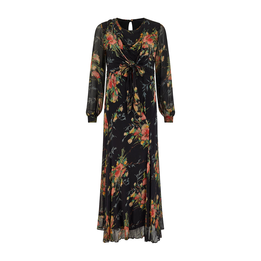 1930s Midnight Blue Long Sleeved Floral Georgette Maxi Dress