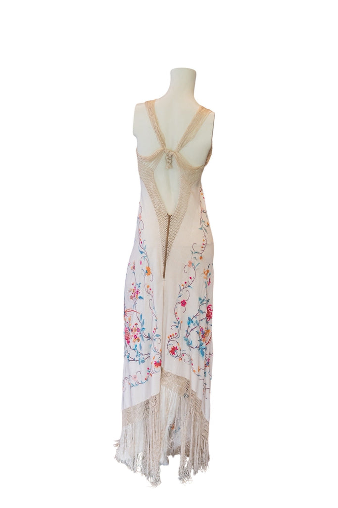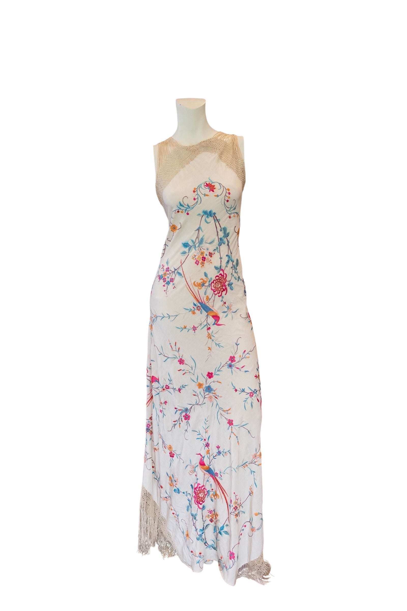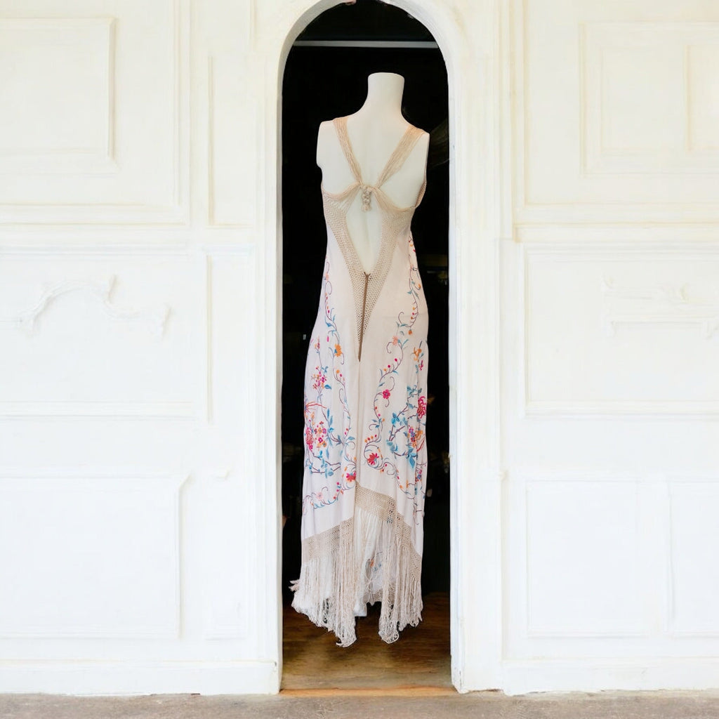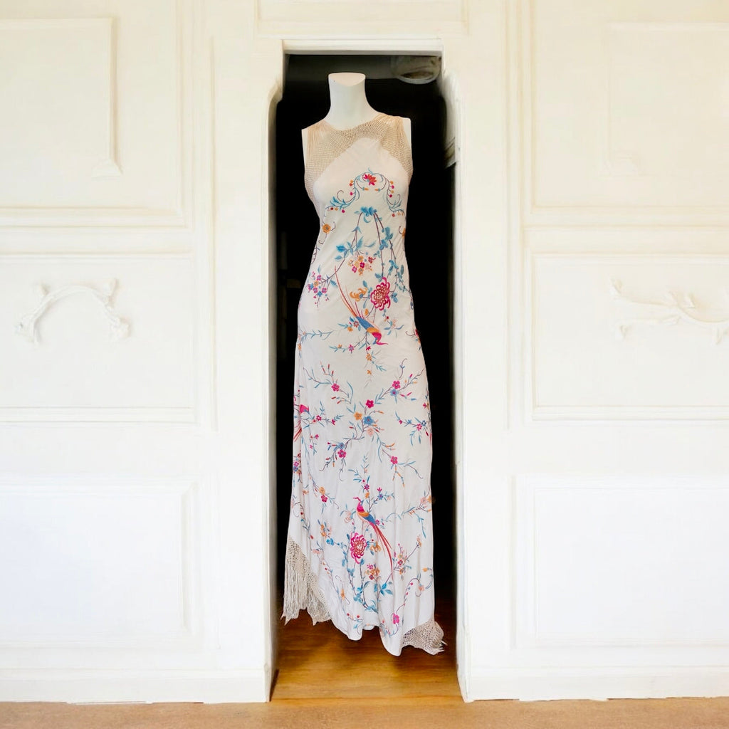 This unique 1940s silk dress showcases exquisite Oriental embroidery featuring birds and floral motifs on a cream silk background. Expertly reworked and cut on the bias, it offers a flattering silhouette enhanced by delicate macramé straps that knot at the back. A discreet zip ensures a perfect fit, while cascading fringes add elegant movement, making this piece a rare blend of vintage artistry and refined craftsmanship.