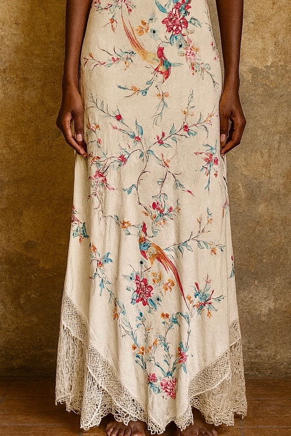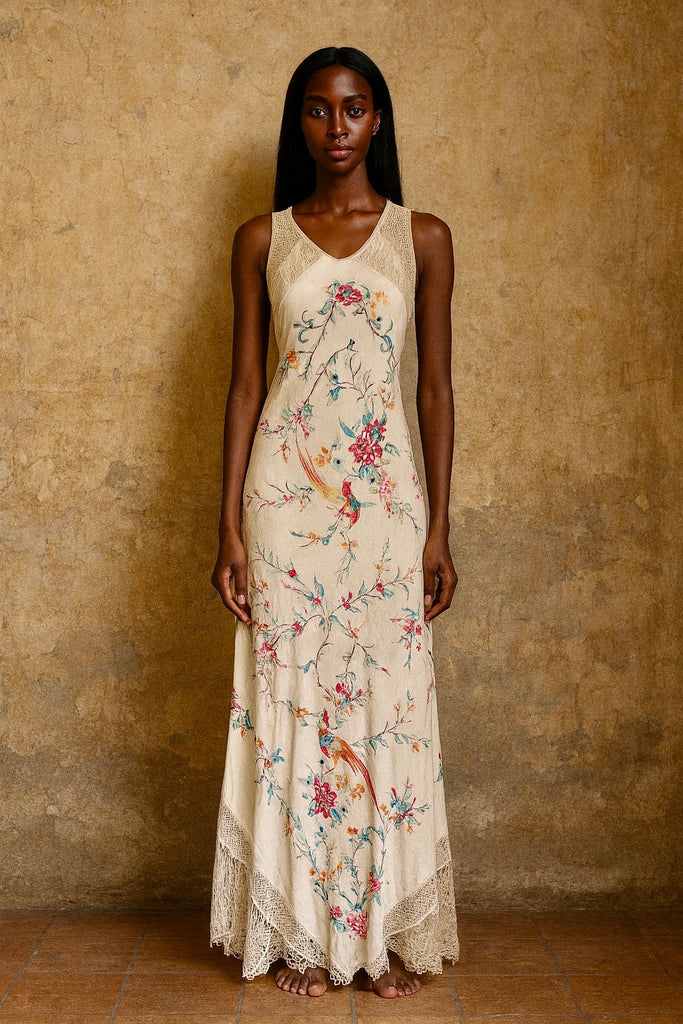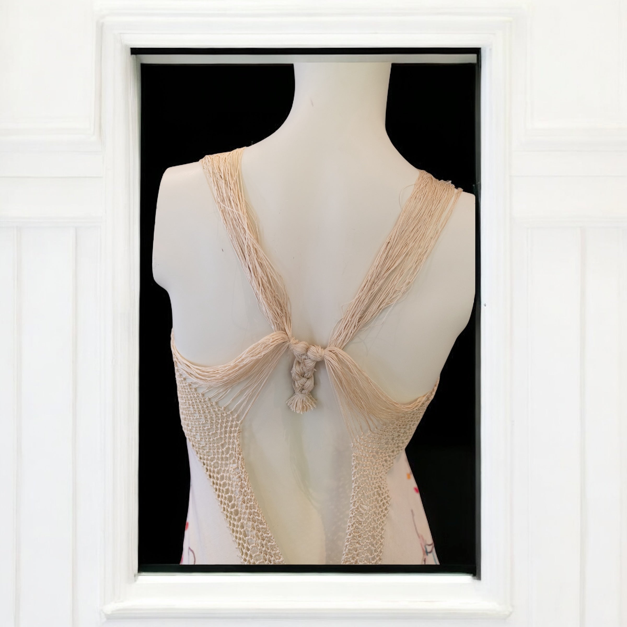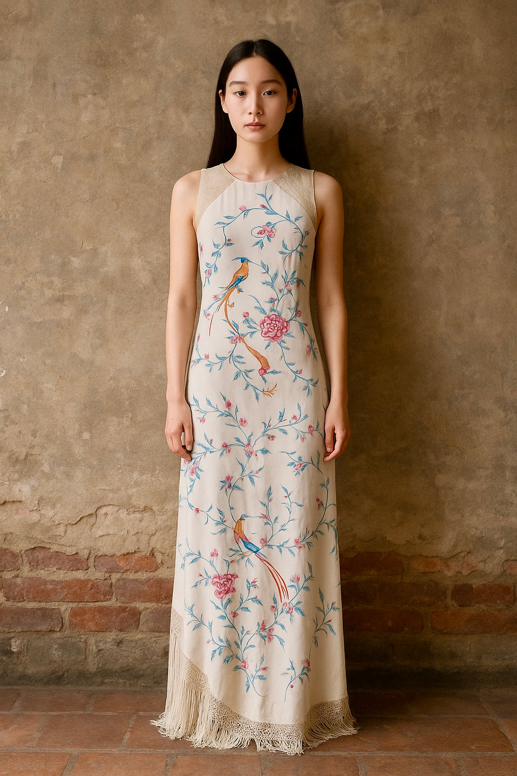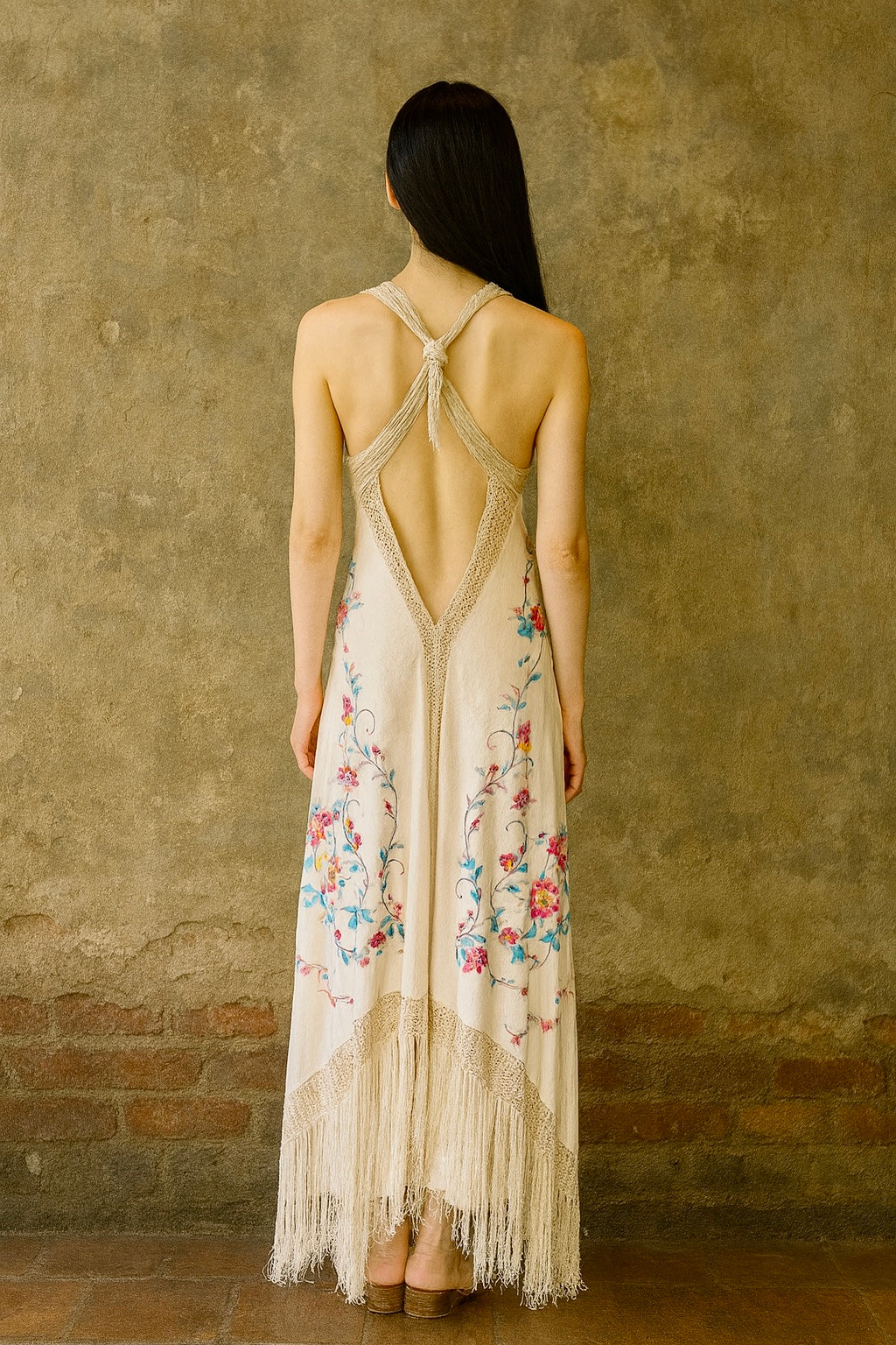 This unique 1940s silk dress showcases exquisite Oriental embroidery featuring birds and floral motifs on a cream silk background. Expertly reworked and cut on the bias, it offers a flattering silhouette enhanced by delicate macramé straps that knot at the back. A discreet zip ensures a perfect fit, while cascading fringes add elegant movement, making this piece a rare blend of vintage artistry and refined craftsmanship.