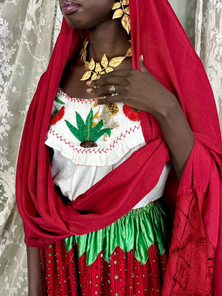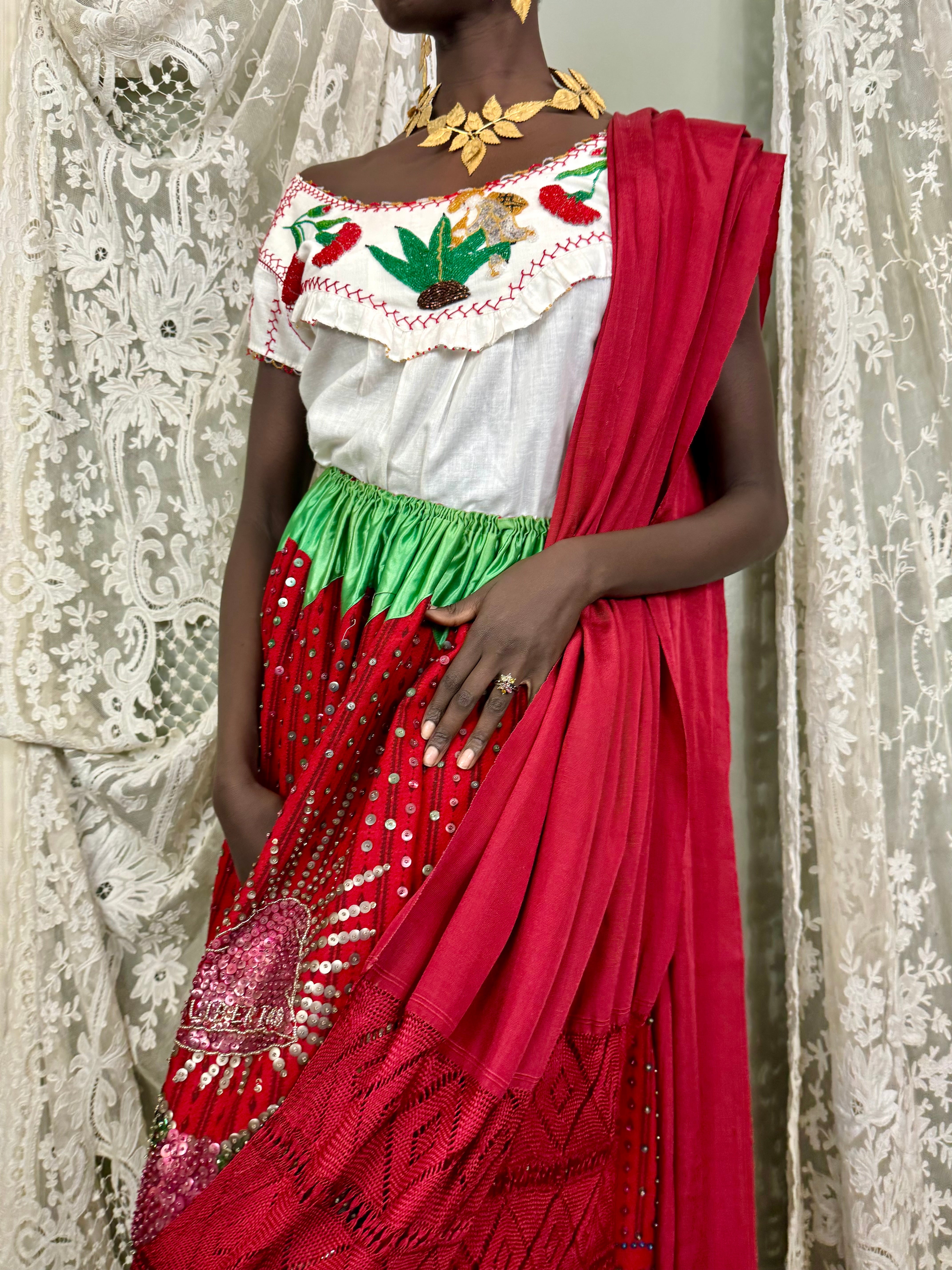 Be the life of the party in Felicity's 40s Mexican beaded top, skirt, and shawl. This original celebration set features a scoop neck top with a straight fit and a skirt adorned with large sequined peace symbols and a green silk scalloped design. The adjustable back tie gives the perfect fit while the long macramé shawl completes the look.