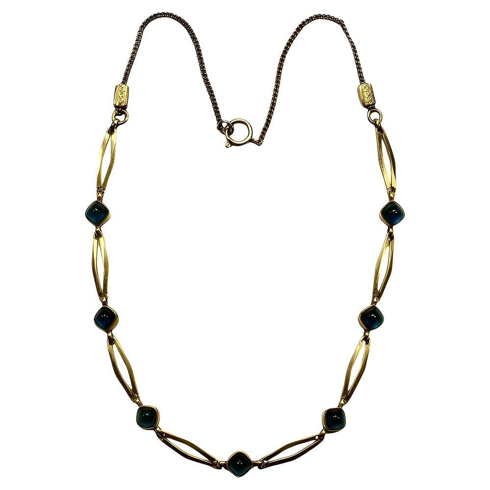 Beautiful gold filled link necklace featuring blue glass cabochon stones, and two ornate connectors. The necklace may be German.