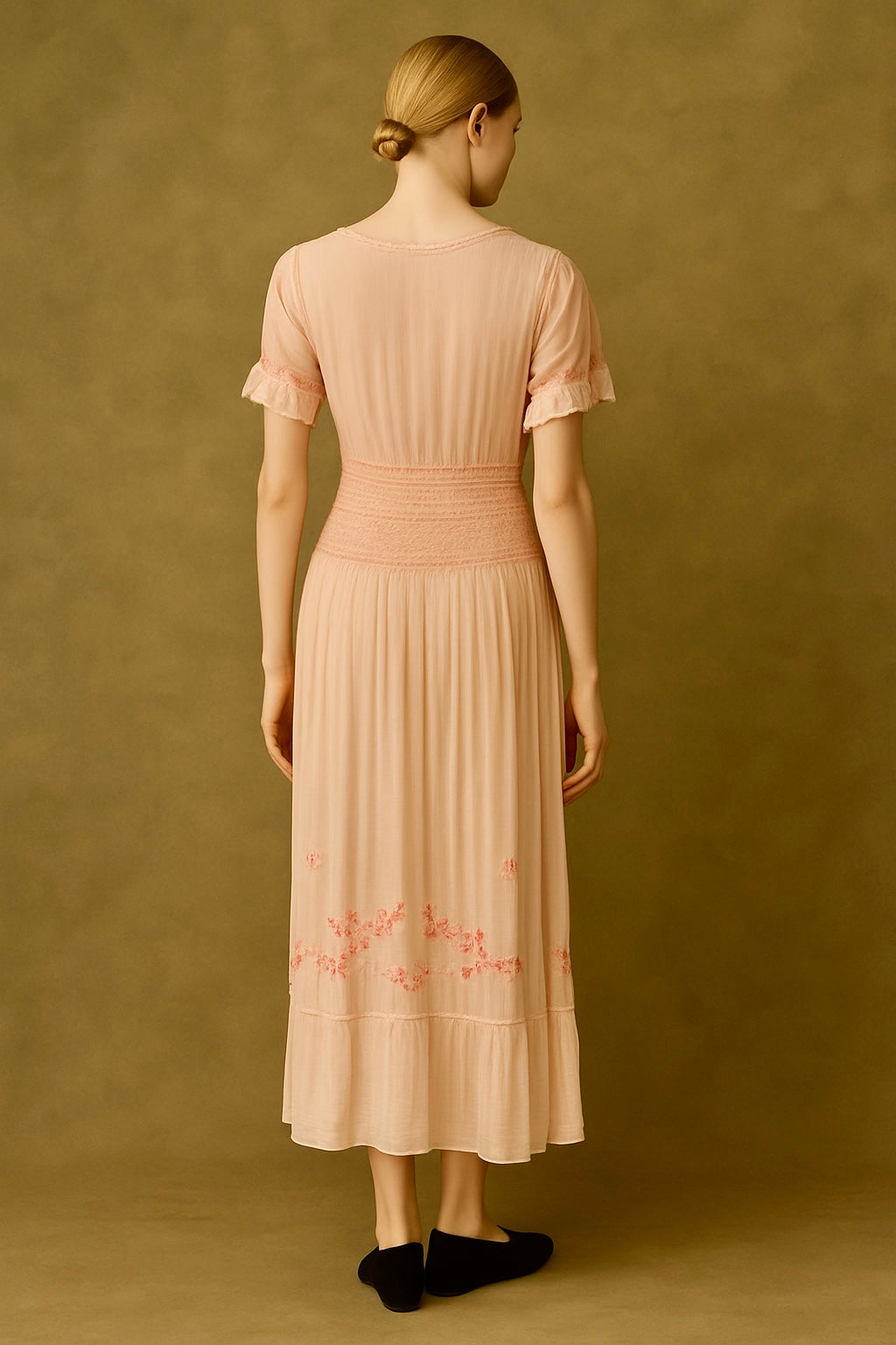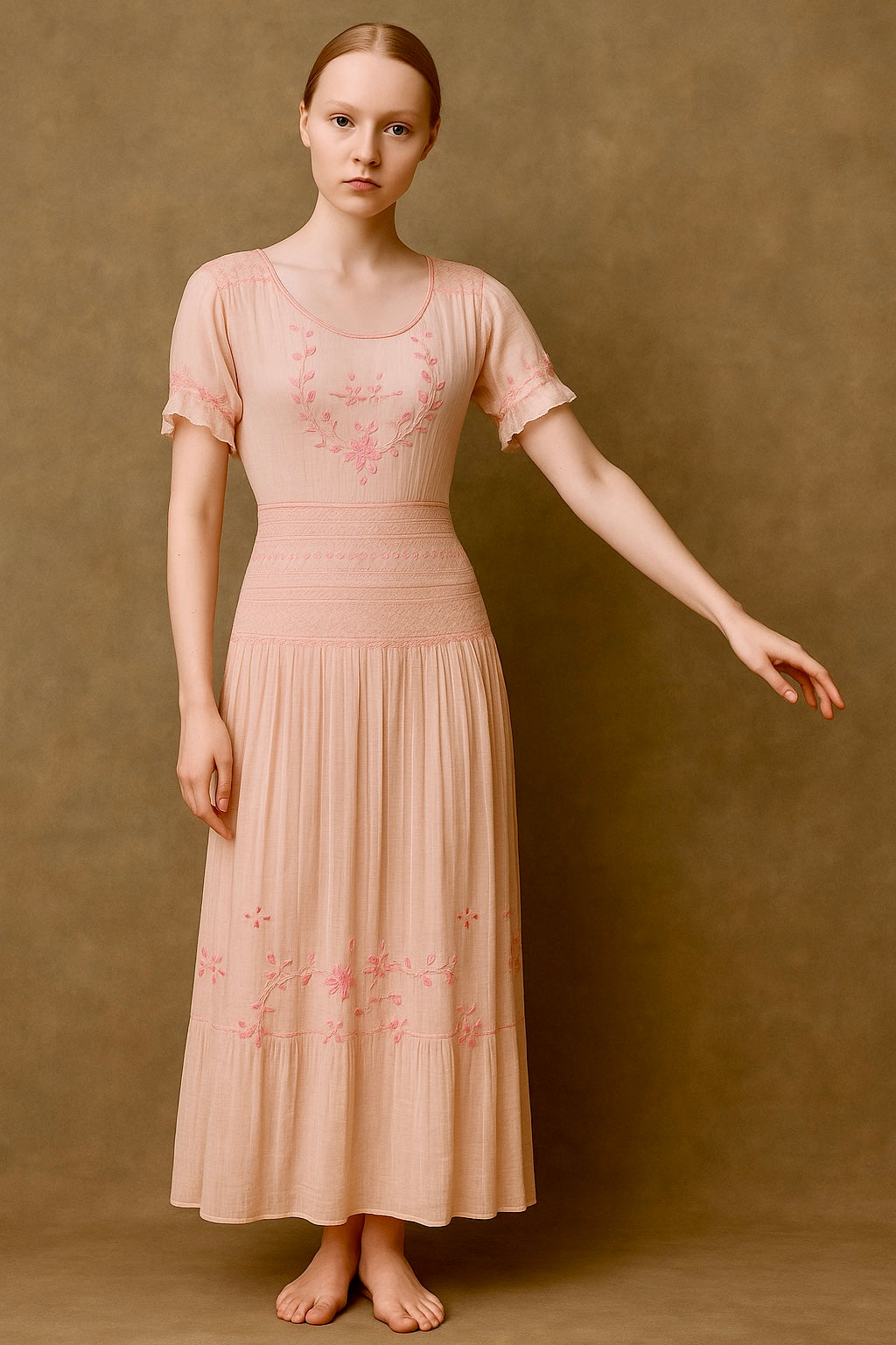 This authentic 1940s Hungarian dress in soft pink features a delicate embroidered cotton skirt and a distinctive smoked elasticated hip design. Its short sleeves and round neckline enhance the vintage silhouette, while the intricate floral stitching highlights the skill of traditional handmade craftsmanship. Perfect for collectors and lovers of period fashion seeking a genuine piece of history.