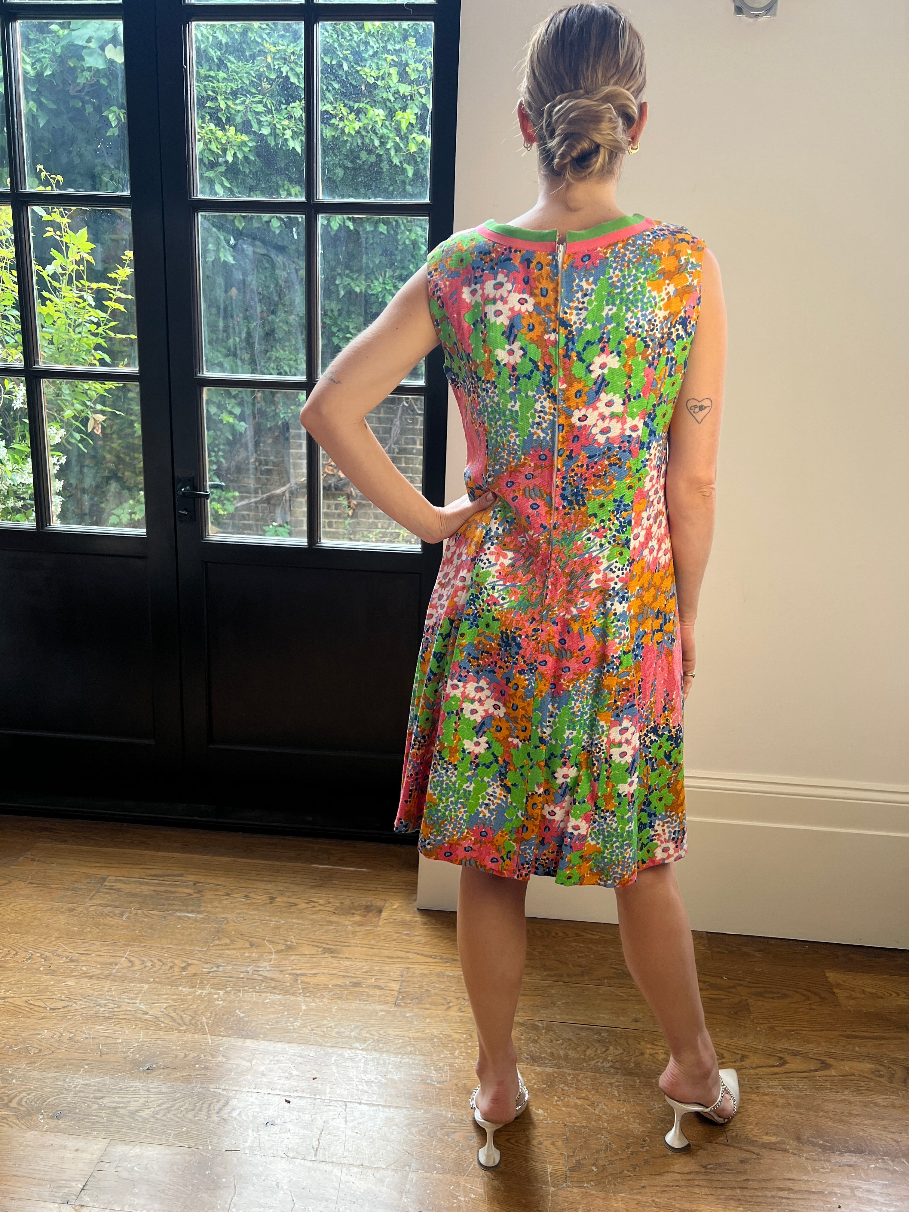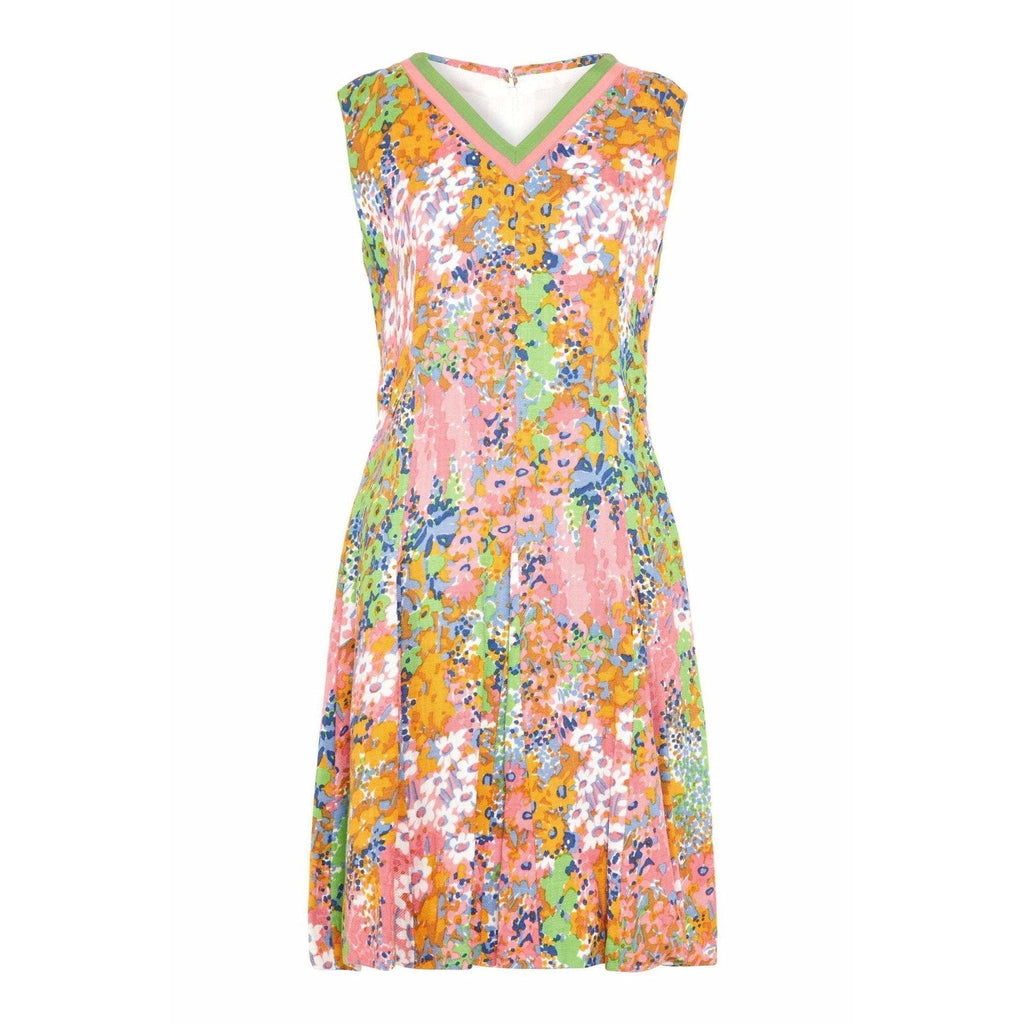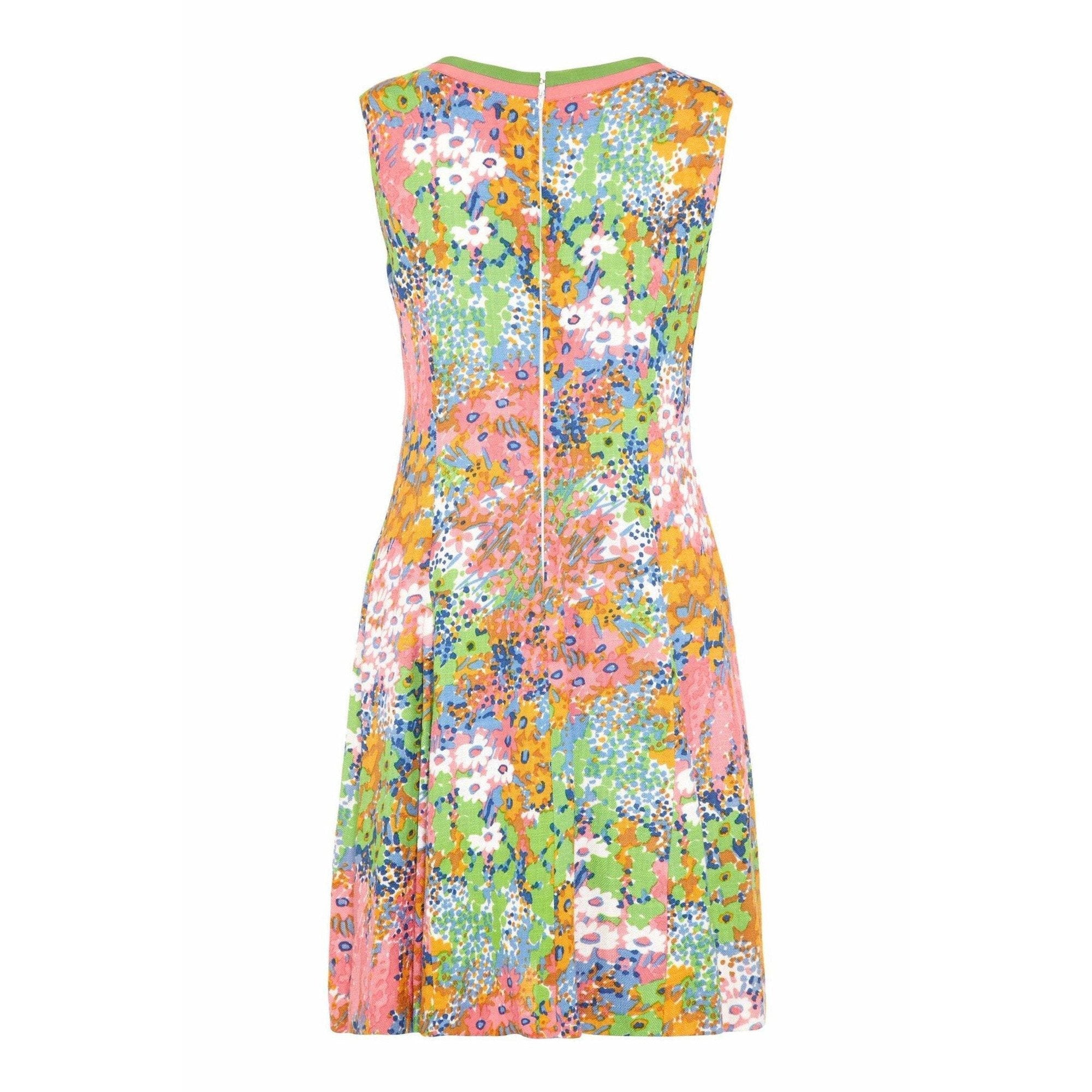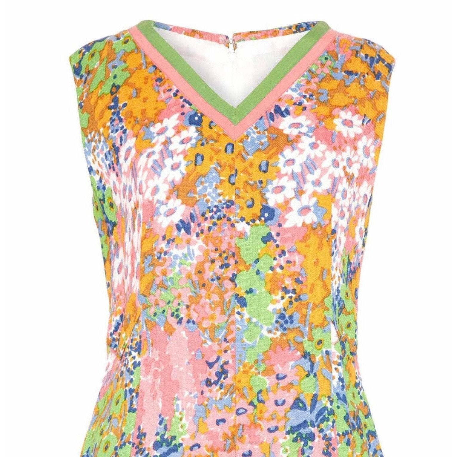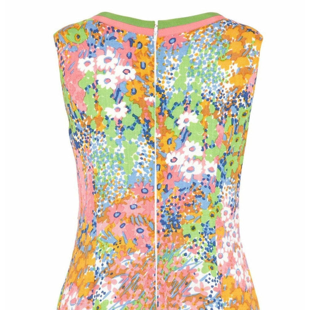 This pretty linen floral print shift dress was designed in the 1960s. Its fresh, buoyant print reveals painterly florals in vibrant pastel hues of pink, orange, blue and meadow green. Featuring a V-neckline trimmed in contrasting green and sugar pink grosgrain ribbon, the dress has a slight sporty feel. It is sleeveless with a central zip fastening at the reverse and is fully lined. The heavy duty linen fabric holds the silhouette beautifully and the softly abstracted floral print makes this piece a wonderful choice for summer.