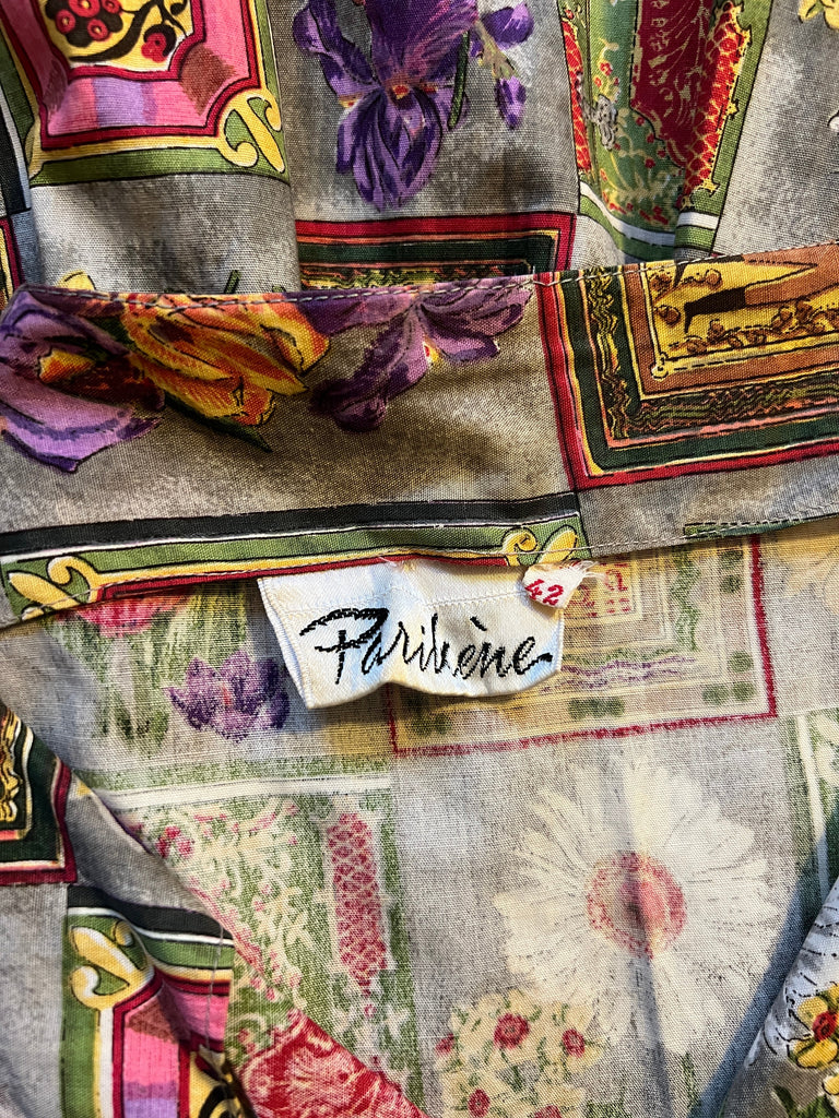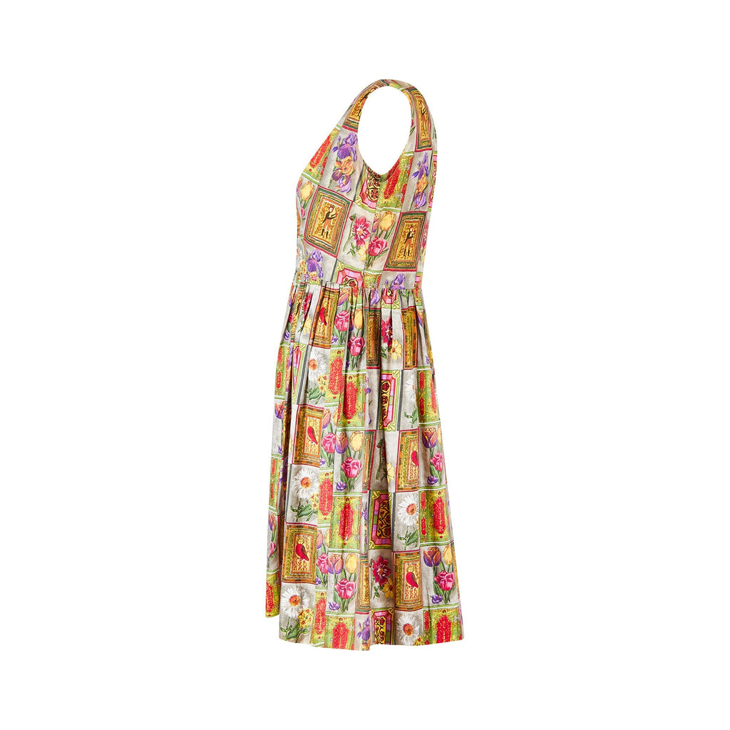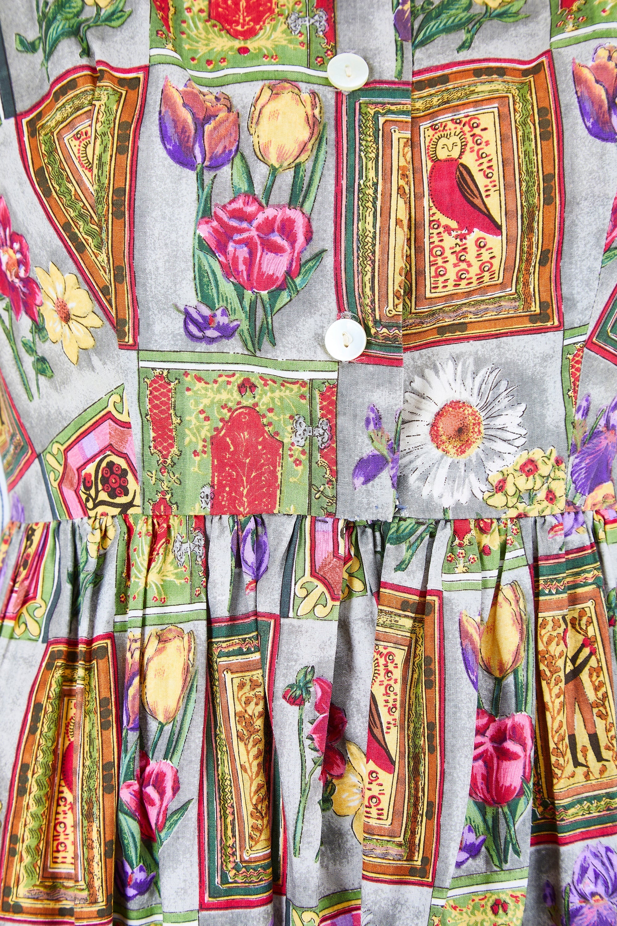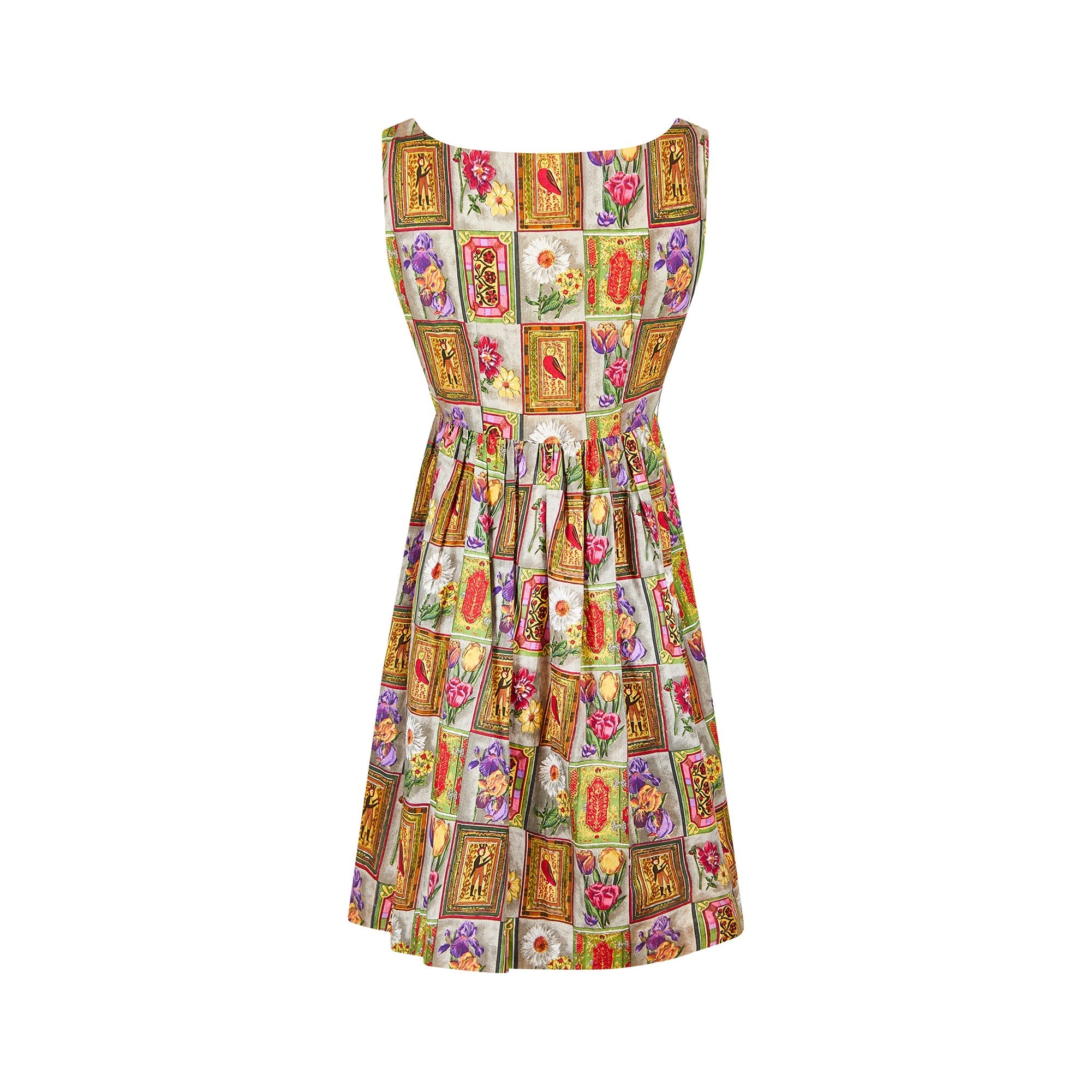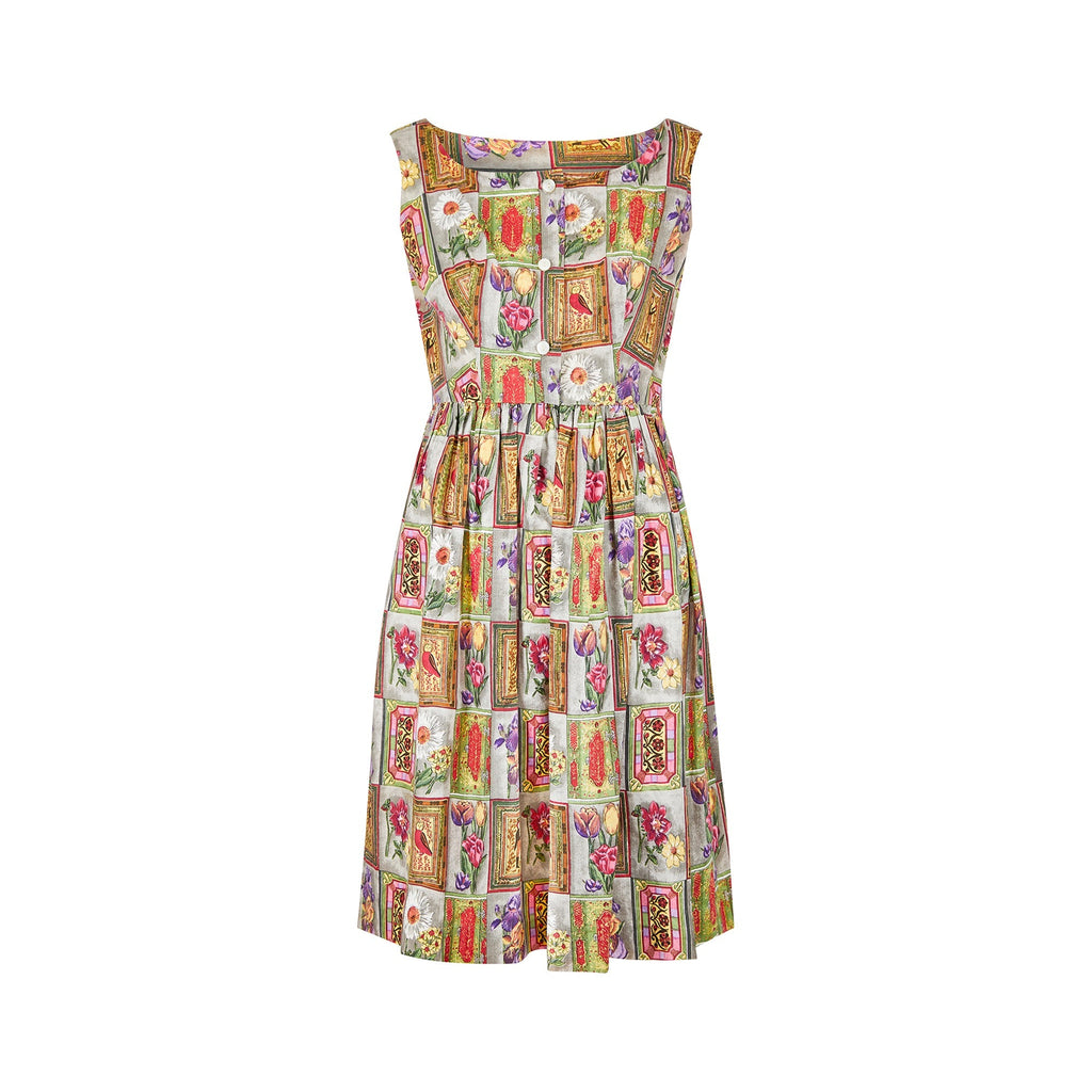 This lively cotton dress as designed in the 1960s by Parikene and probably made in France. It showcases a playful novelty print of folk art in elaborate frames and English country garden blooms. The colours are particularly vibrant for a piece of 60+ years of age, with the bright yellows, greens, purples and reds really standing out against the splashy grey background. The sleeveless cut, button down front and wide boat neckline add an easy elegance, whilst the full skirt plays to the breezy summer feel. It is in excellent vintage condition and a good fit for sizes up to UK 12 or US 8.