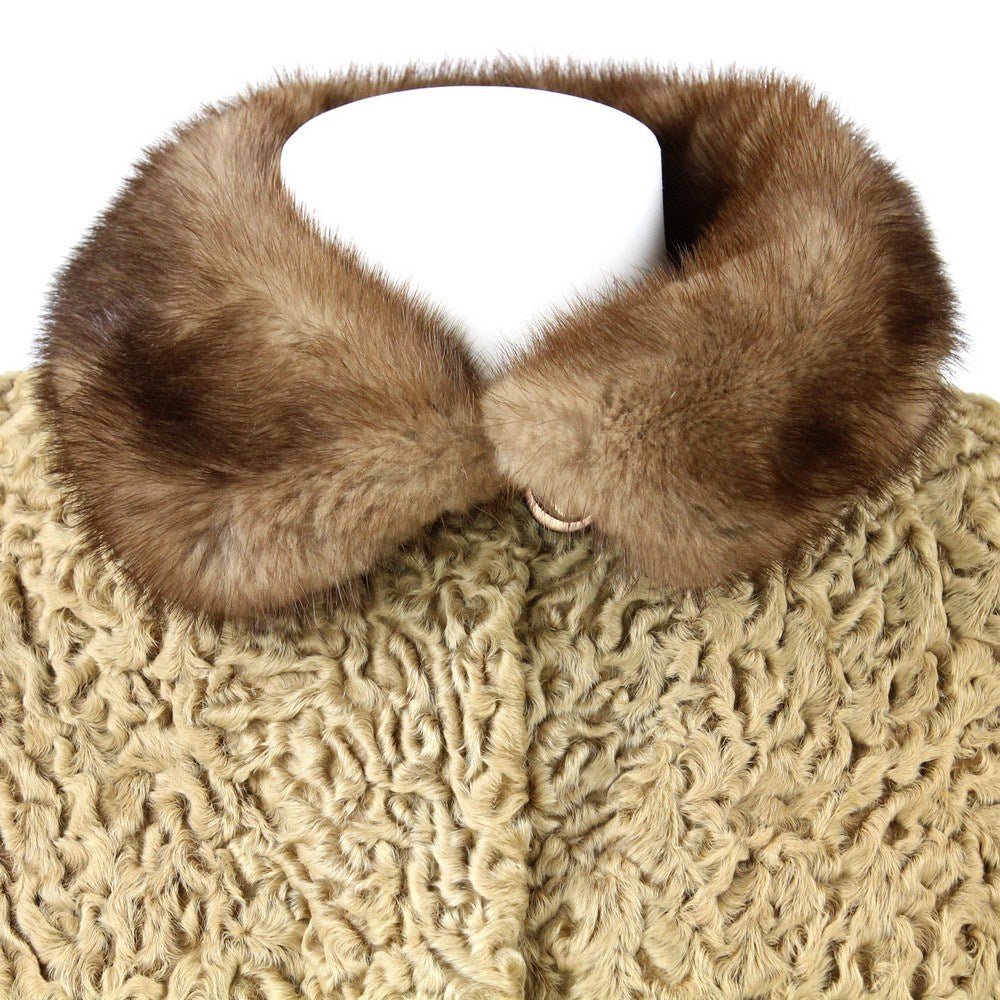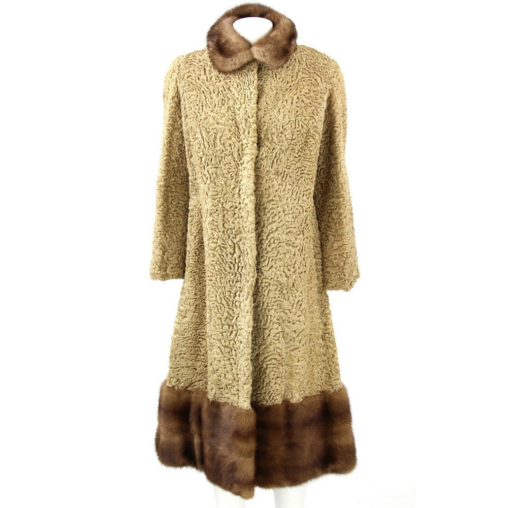 Beige Persian lamb fur flared tailored coat with brown mink fur collar and bottom. It features two front hooks closure, a button on the collar and side welt pockets. Fully lined.