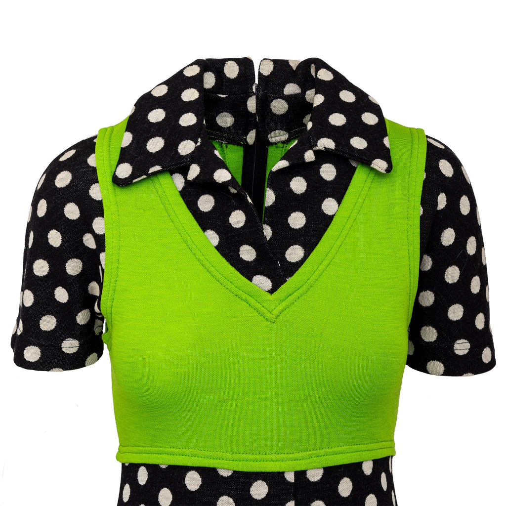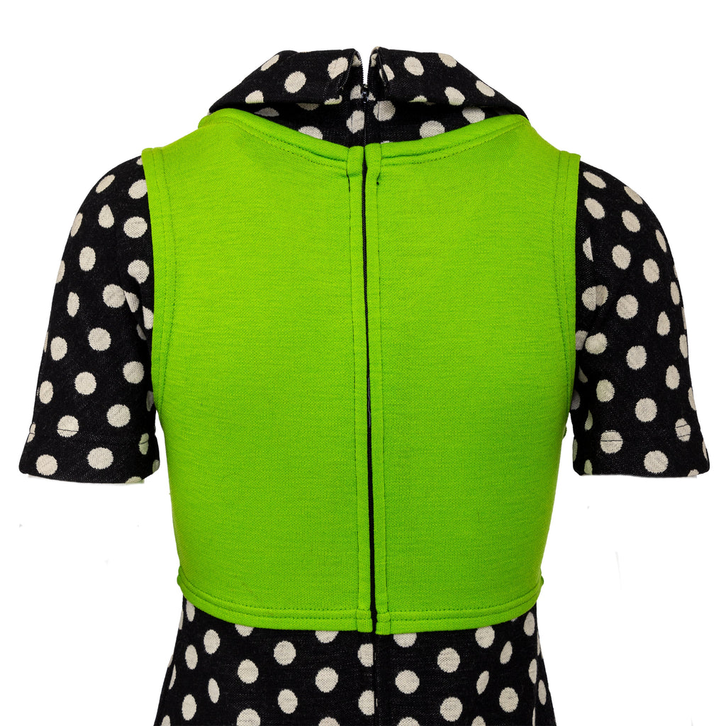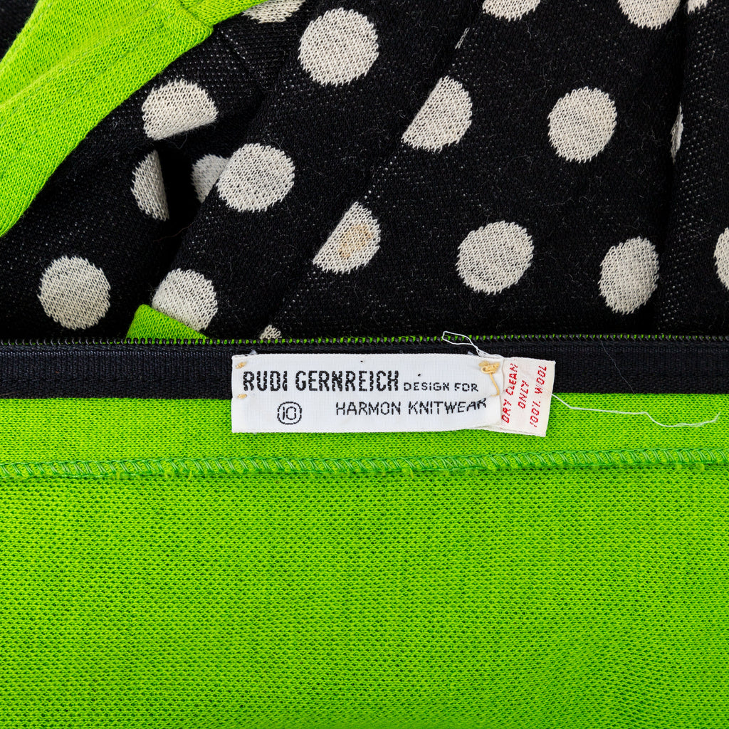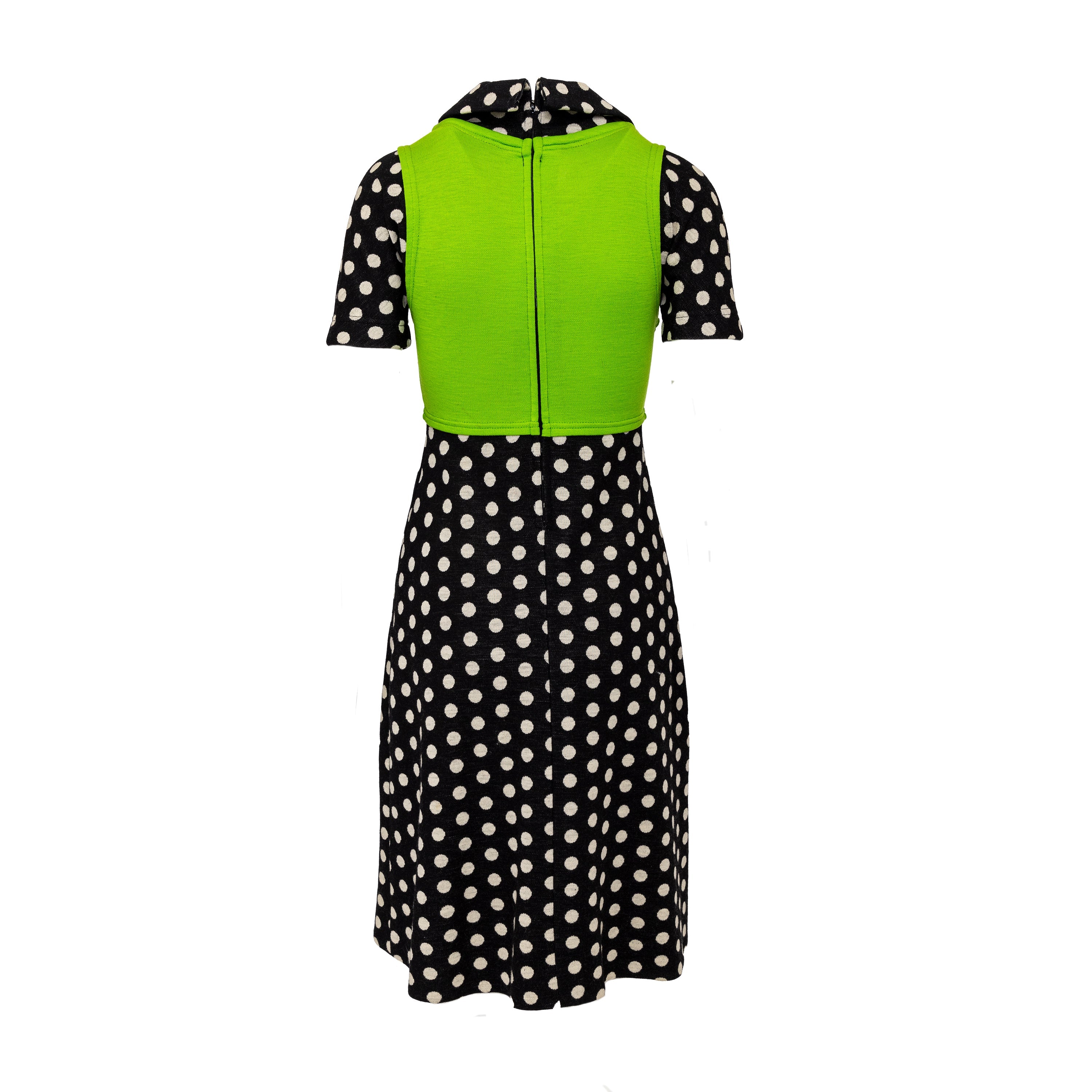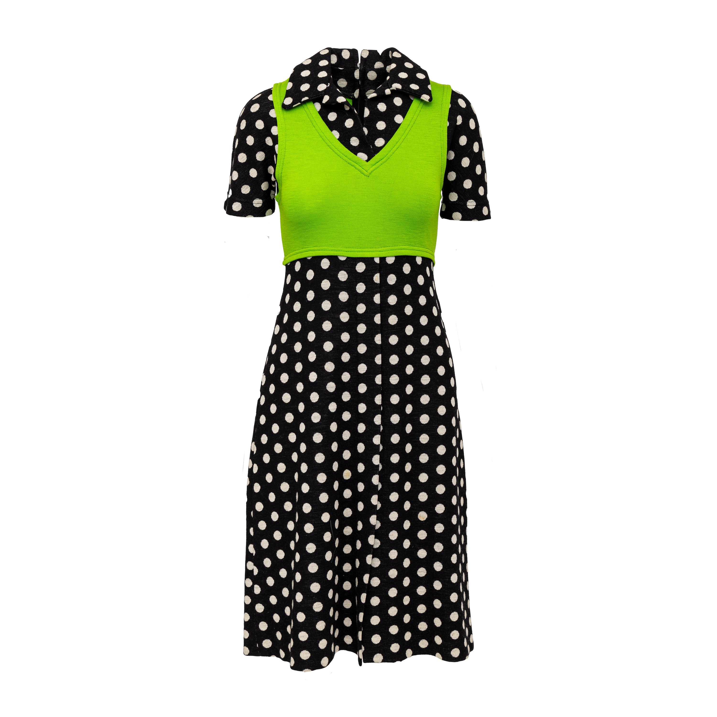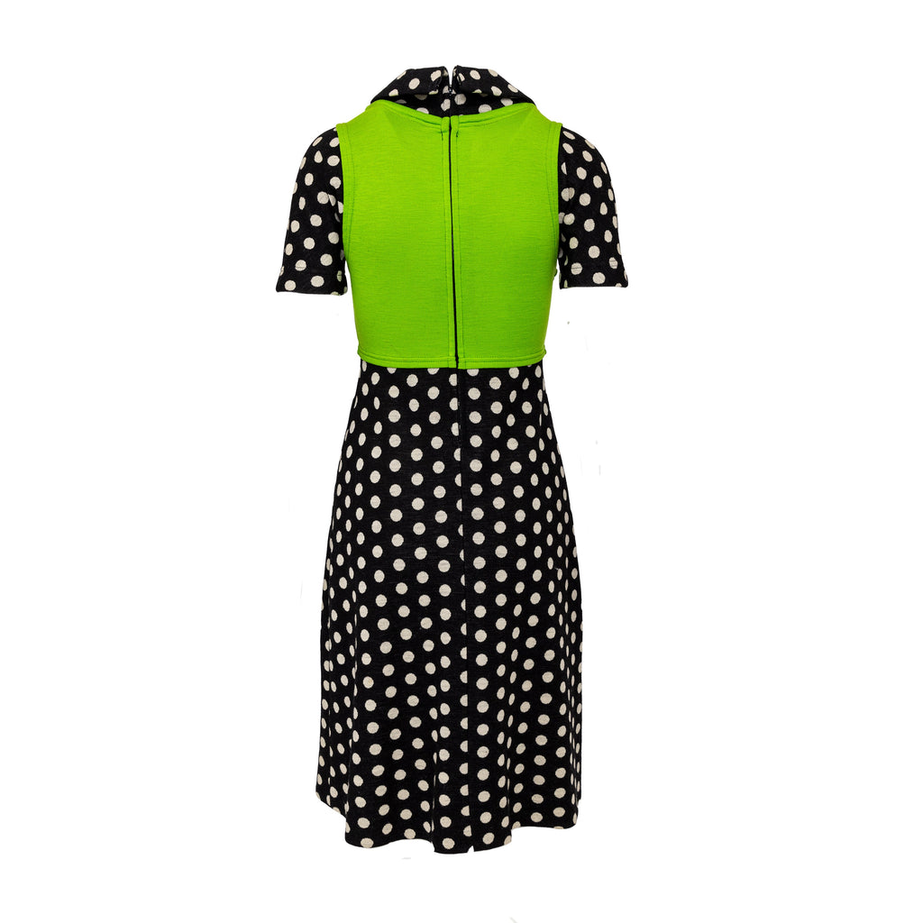 Embrace the bold and innovative style of the 60s with this midi wool dress. Designed by the avant-garde fashion designer Rudi Gernreich, this dress features a fitted bodice and contrasting vest style. The unique mix of polka dot patterns in the fabric adds a touch of vintage charm.