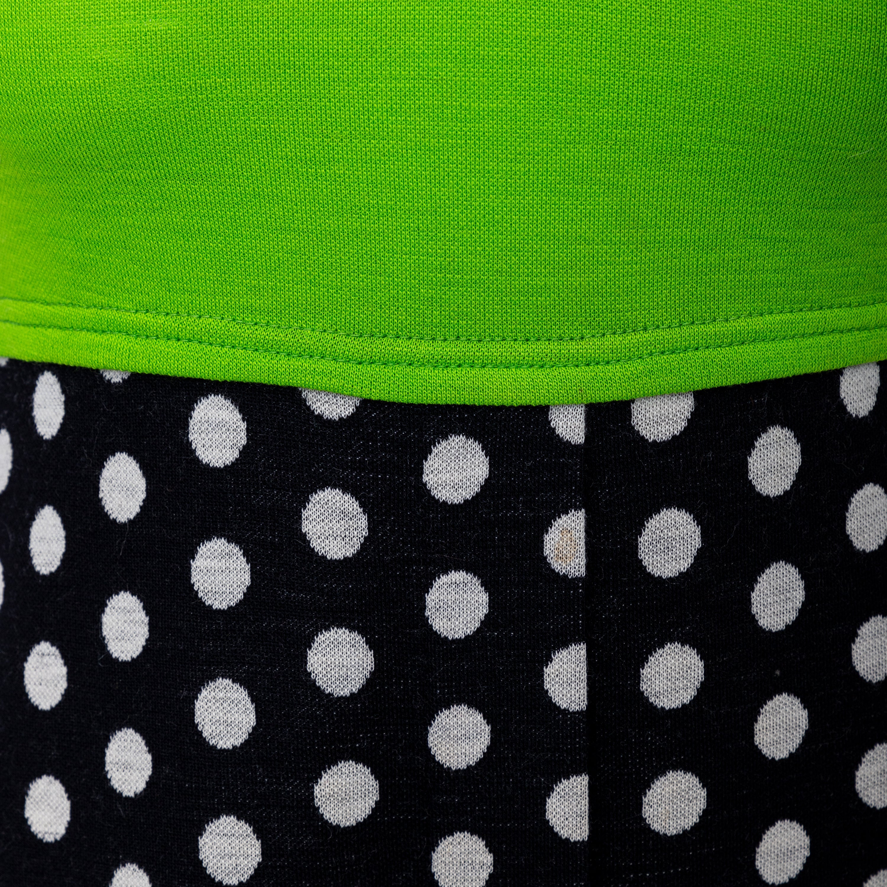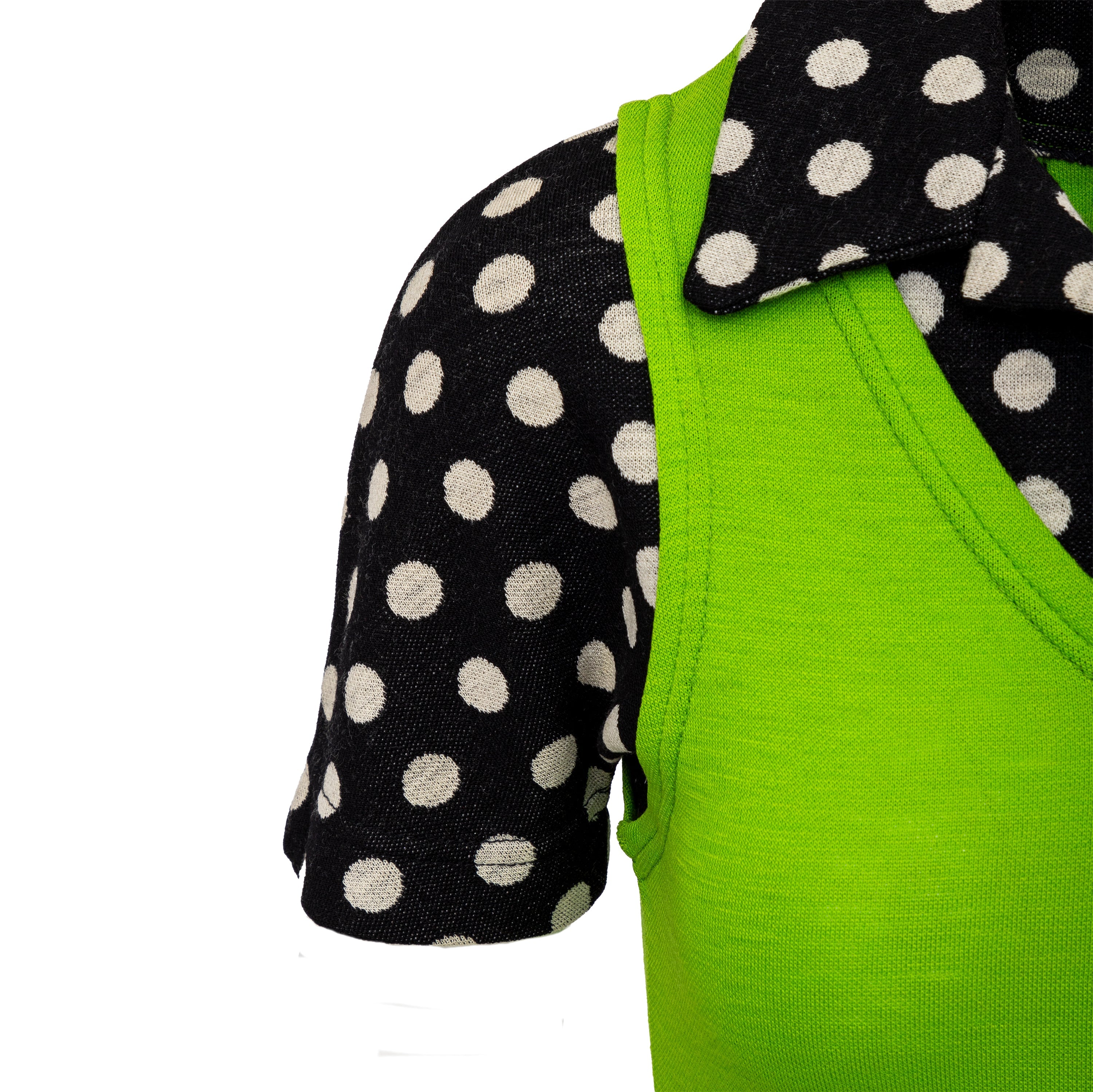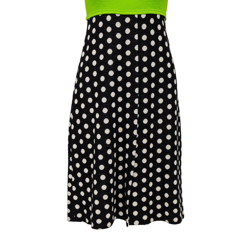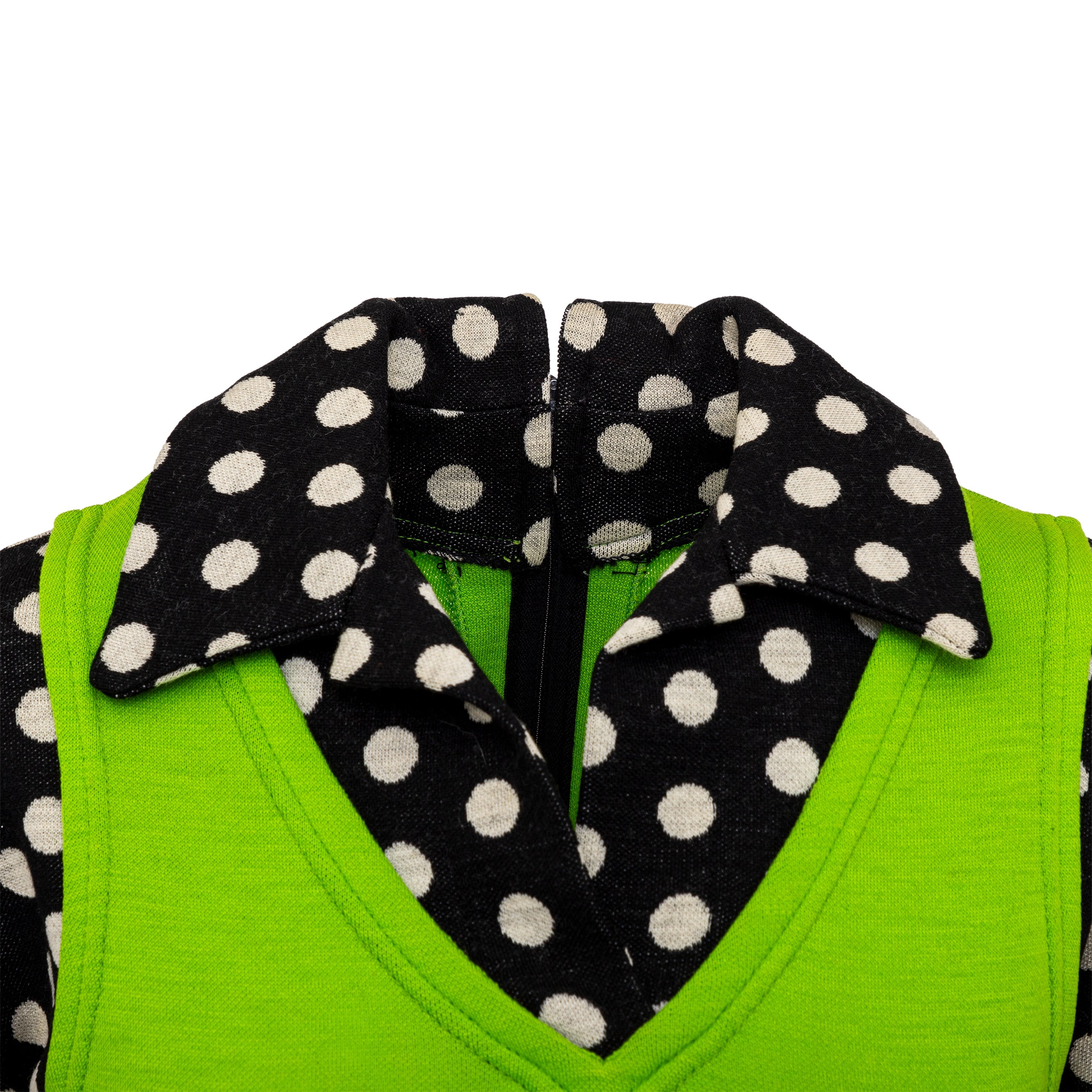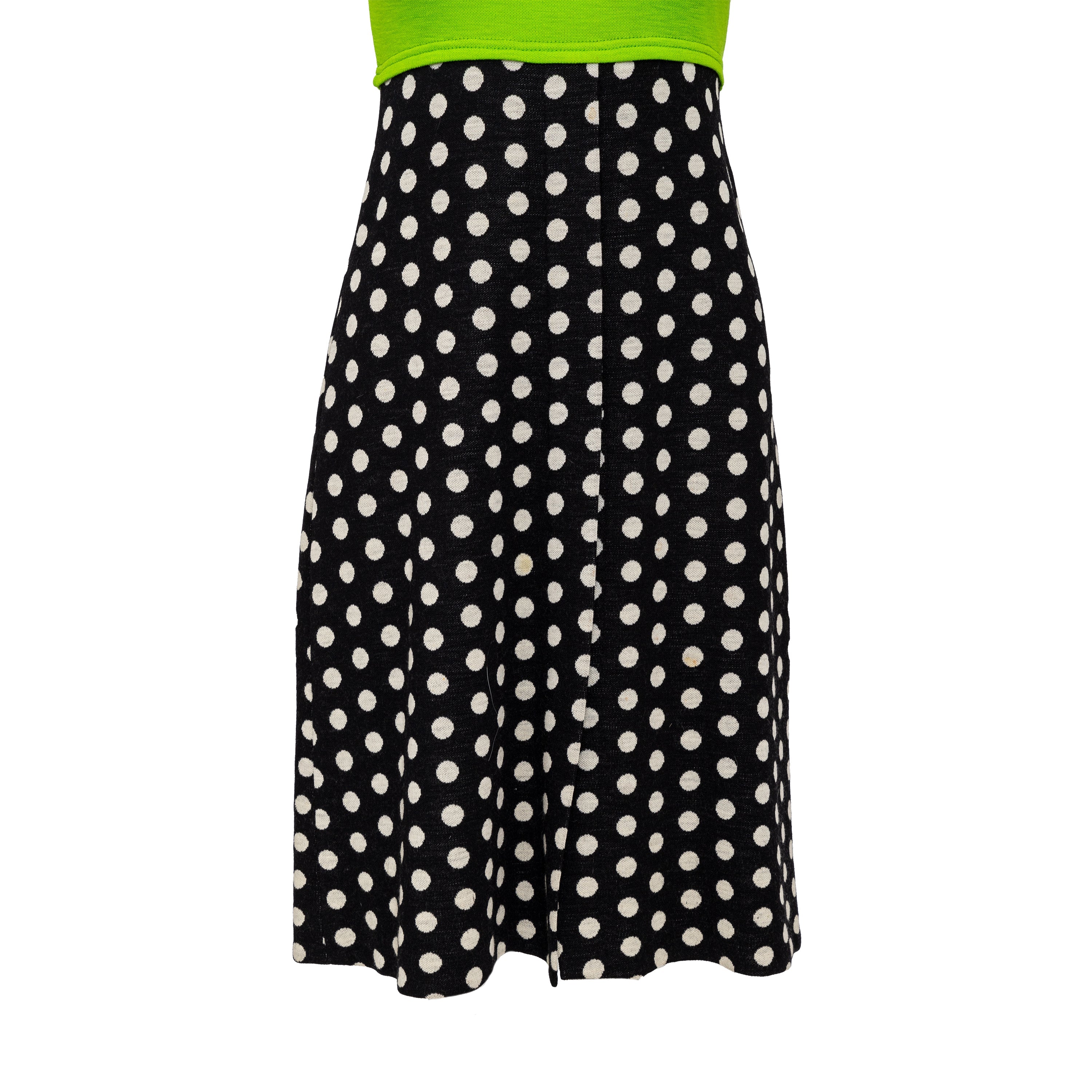 Embrace the bold and innovative style of the 60s with this midi wool dress. Designed by the avant-garde fashion designer Rudi Gernreich, this dress features a fitted bodice and contrasting vest style. The unique mix of polka dot patterns in the fabric adds a touch of vintage charm.