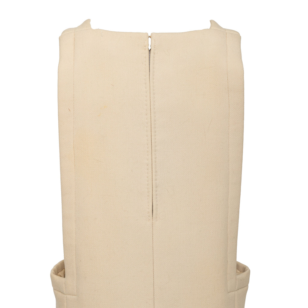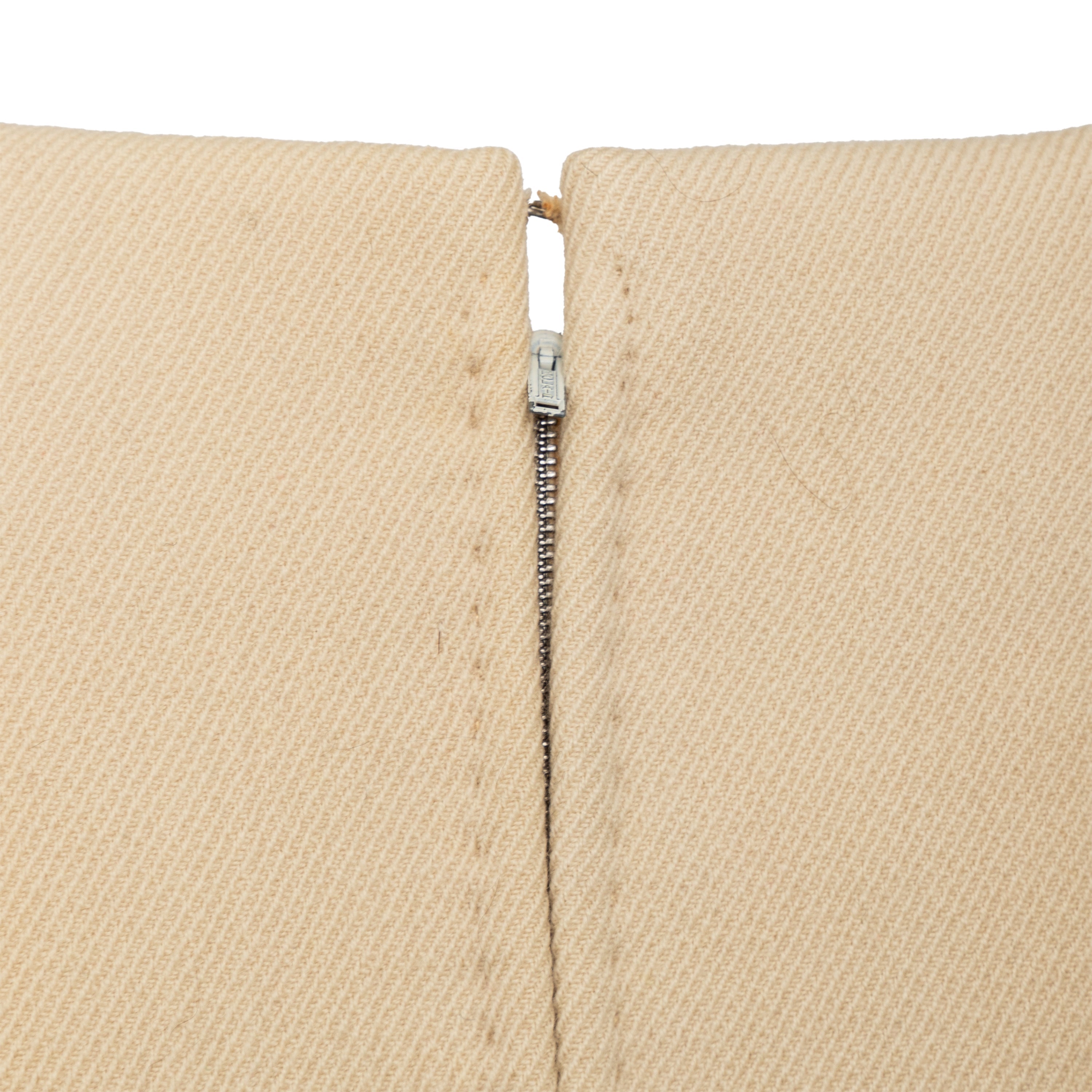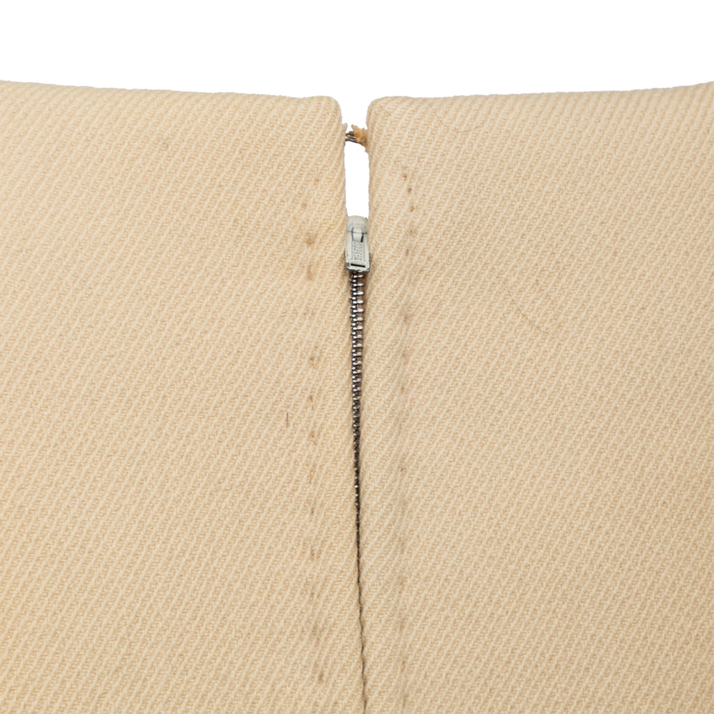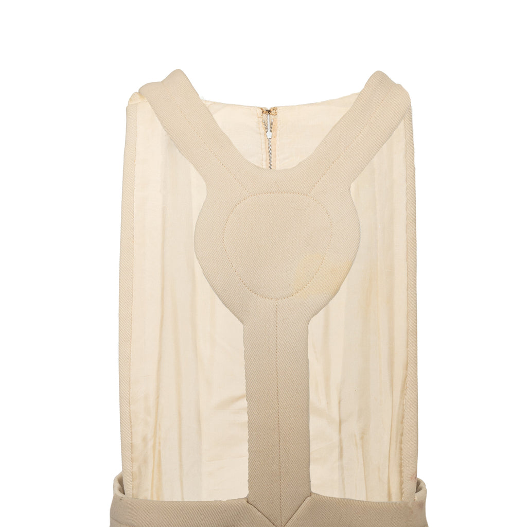 This 60s beige wool blend short overall from Stavropoulos features a back zipper and a chic round cut-out design, fully lined in acetate for a sleek, stylish fit.