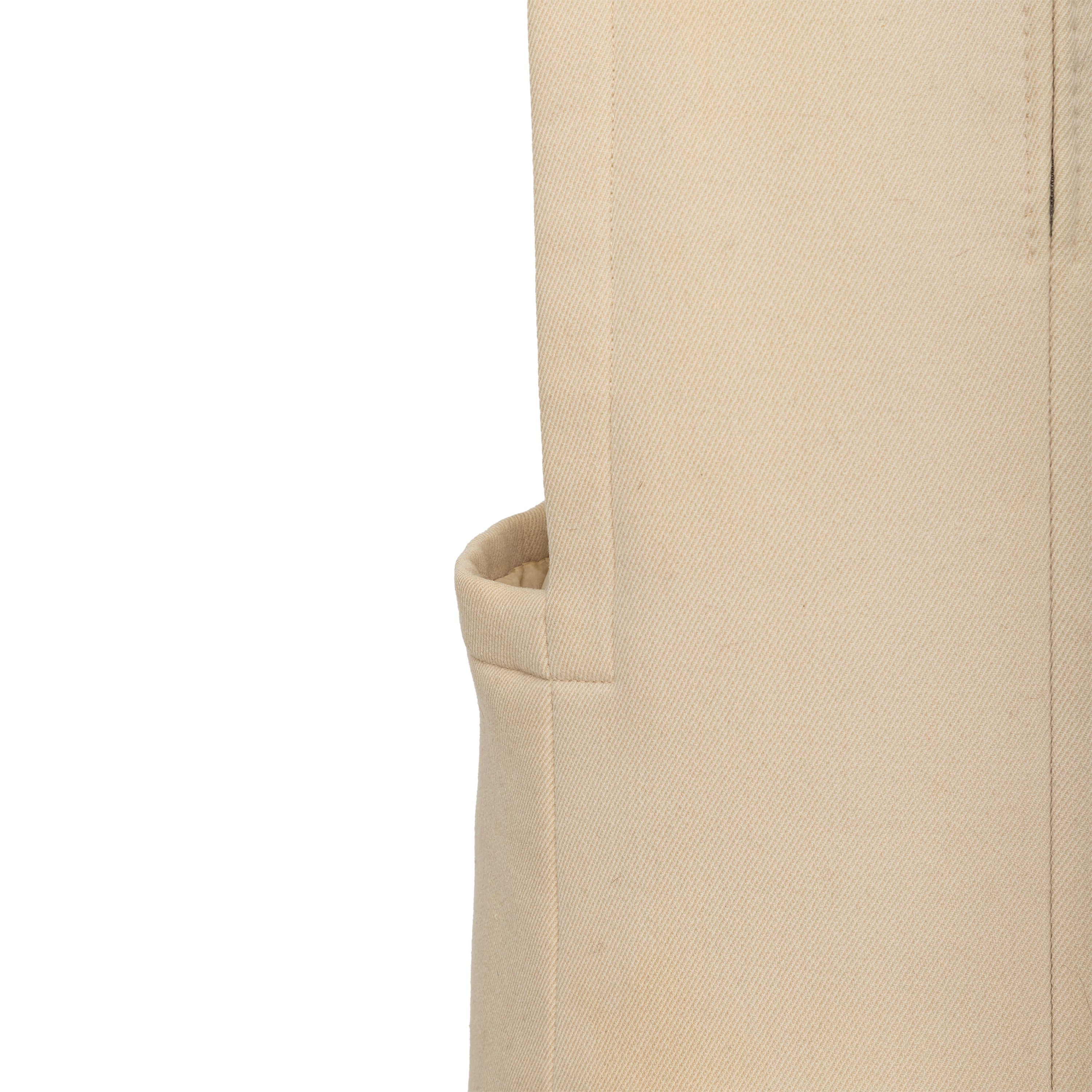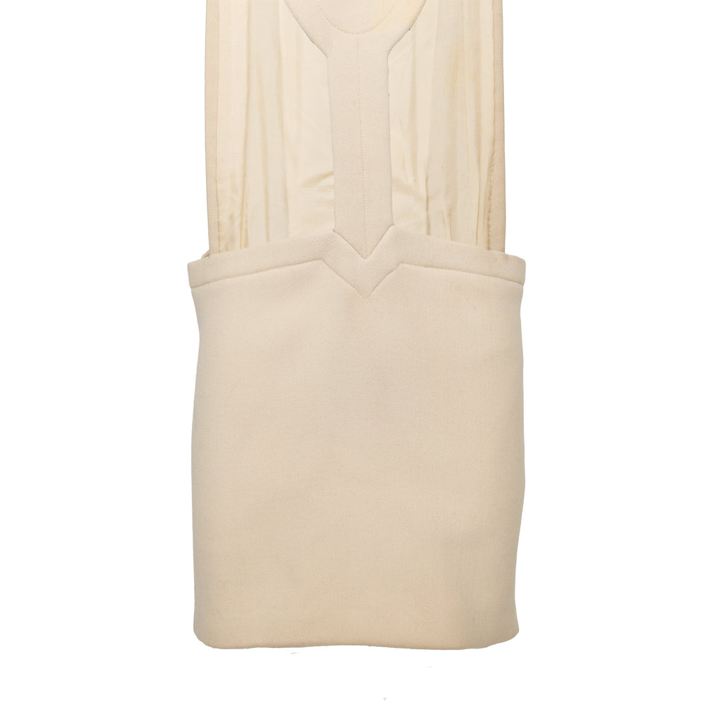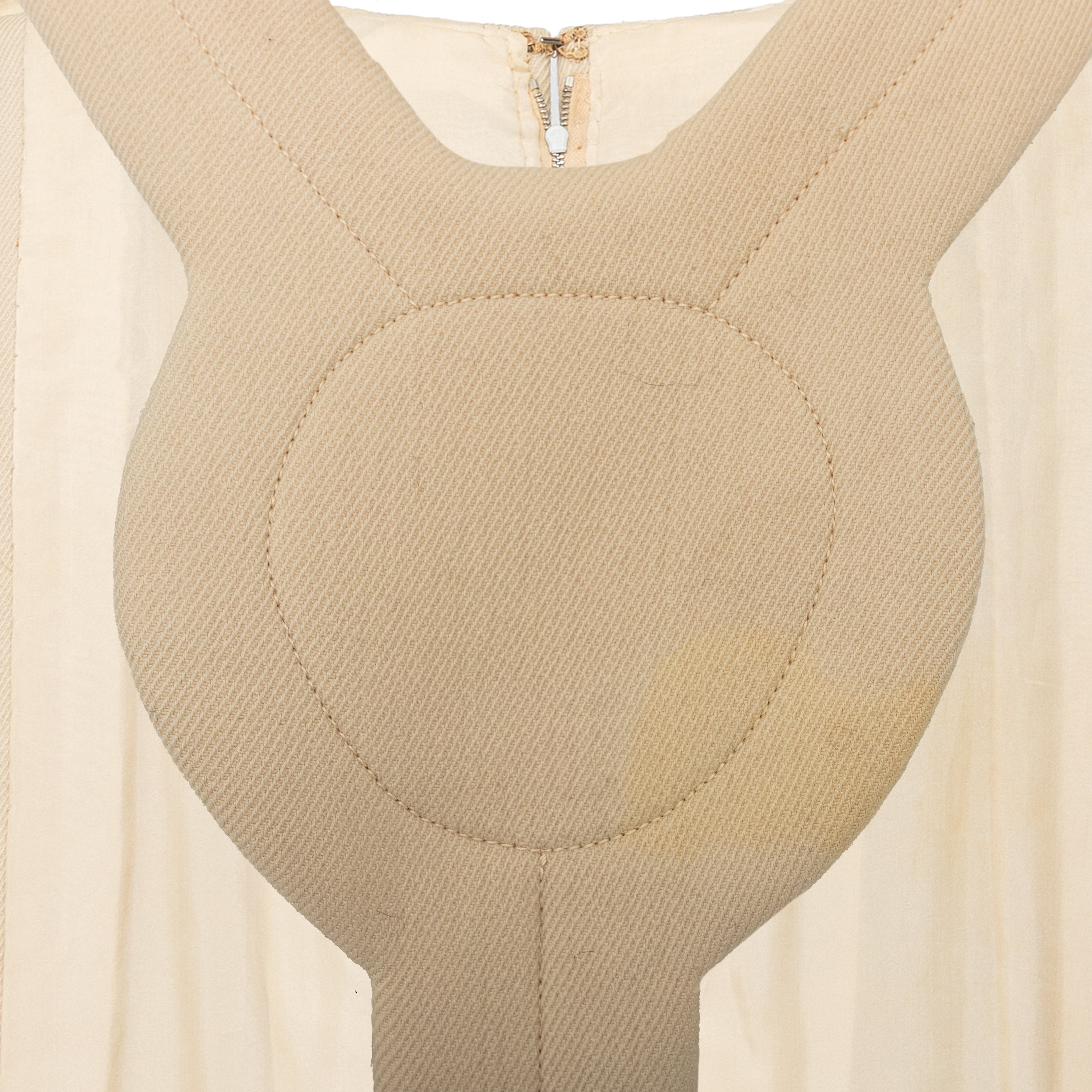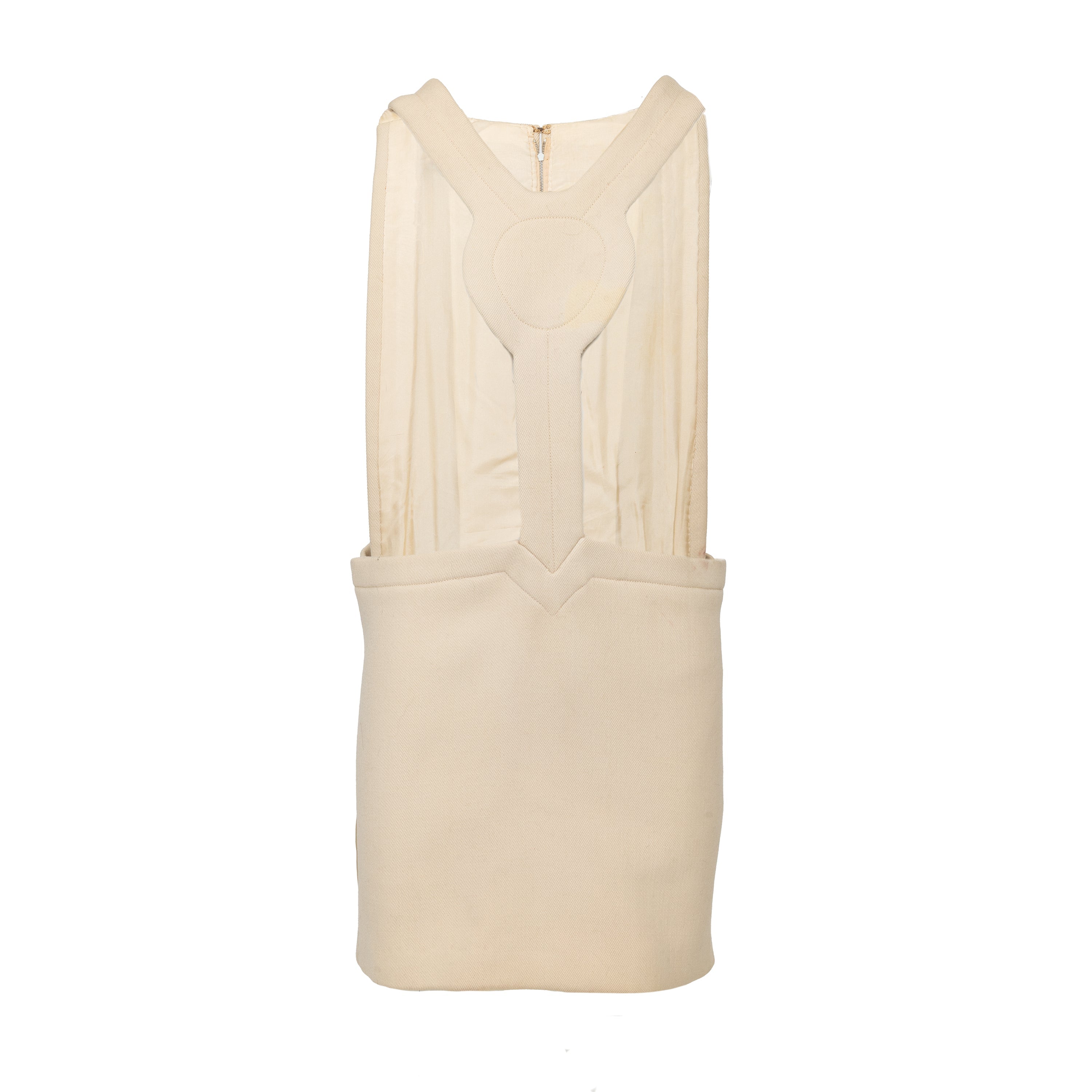 This 60s beige wool blend short overall from Stavropoulos features a back zipper and a chic round cut-out design, fully lined in acetate for a sleek, stylish fit.