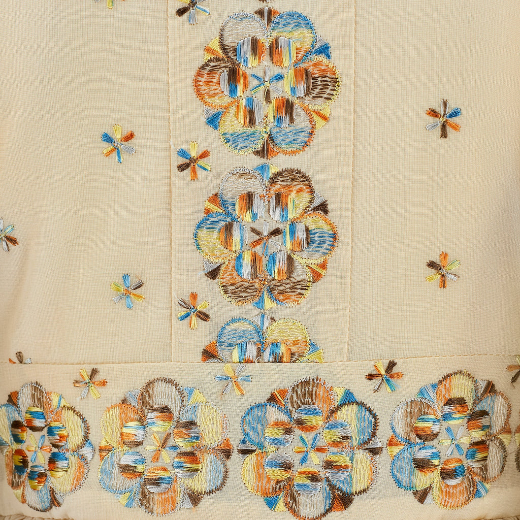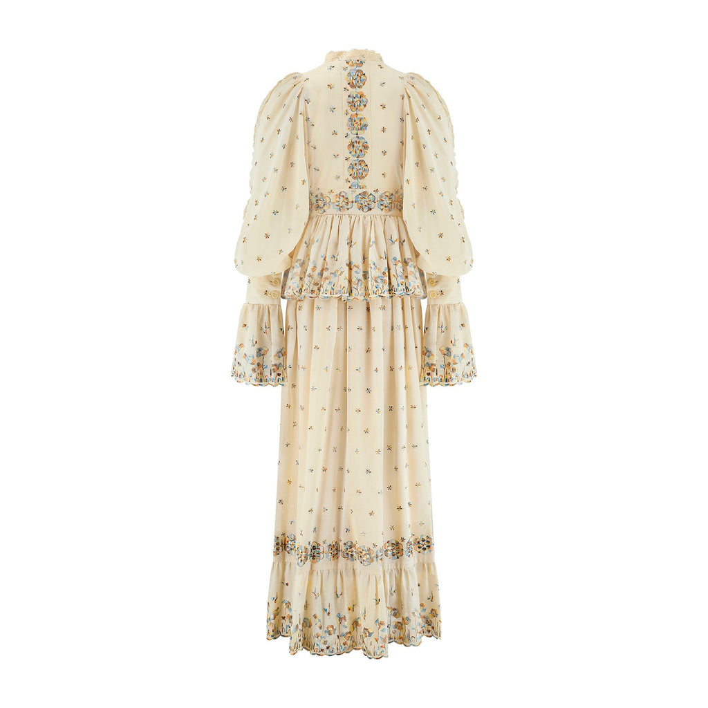 This is an elaborate 1970s gown by revered British fashion designer Bill Gibb. Crafted from soft cream-yellow cotton, it has a dramatic blouson silhouette and was a bespoke wedding dress made for our client in 1973. The fabric is stunning, it is embroidered all-over with floral shapes intricately woven from orange, brown, cobalt blue and yellow thread. The sleeves are tailored to an extreme elongated length with wide button cuffs finished with ruffled hems. This length results in a theatrical bell-sleeved silhouette when the cuffs sit against the wrists. The neckline is high and trimmed with pale yellow lace, lace which also runs the length of the sleeves. The skirt is dramatic; falling from under the ruffled peplum waist, it is embroidered all-over with tiny flowers in multi-hued thread. The bottom hem is layered and pleated and adorned with heavier embroidery, which echoes the scallop shape of the hem. The dress fastens down the front with large yellow plastic buttons which match those at the cuffs. The dress is lined in cream satin.