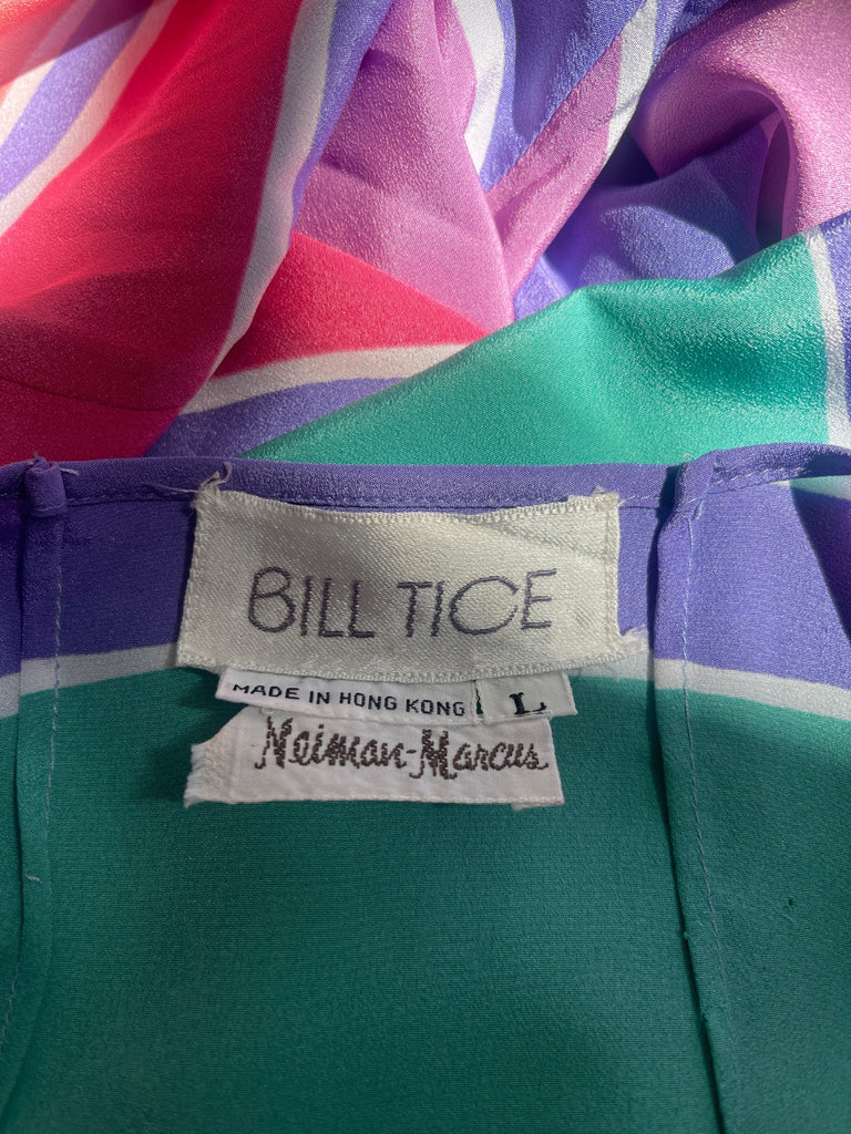 This vibrant late 1970s to early 1980s kaftan dress was designed by Bill Tice and retailed in Neiman Marcus. The designer was known for his glamorous, loungewear which had the look of evening wear. Made in Hong Kong, an area known for its exceptional garment making, it is tailored from a fluid, silk feel and look cloth printed with a striking abstract pastel print. We love the clashing tones of baby blue, lilac, coral, mint green, mauve and fuchsia, broken up with borders of white which make the colours really pop. The floor length dress has a soft V-neckline and huge batwing sleeves which are cropped. It encircles the body and has a slit in the left side of the skirt for ease of movement. The neckline is trimmed in lilac. The kaftan is unlined and pulls-on over the head.