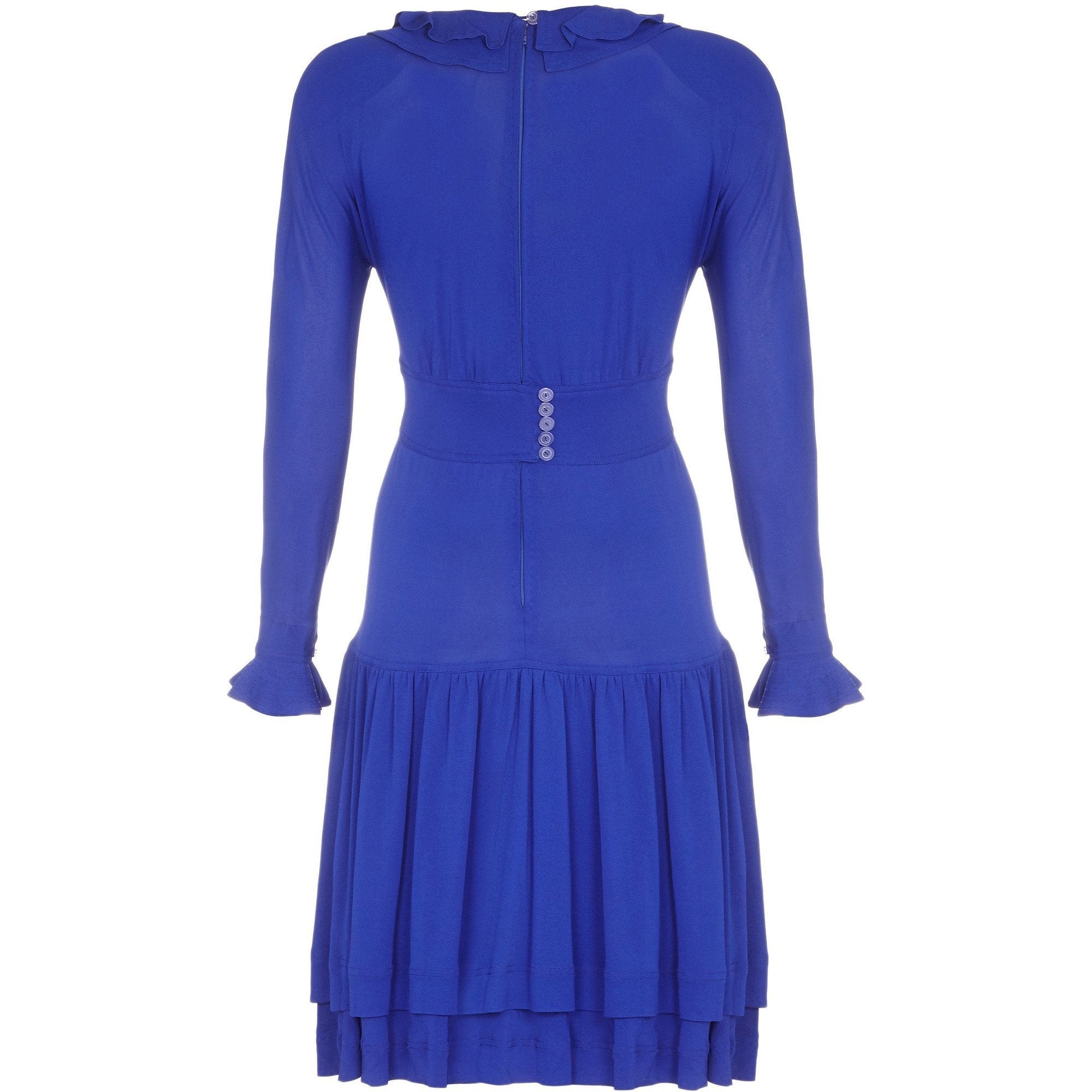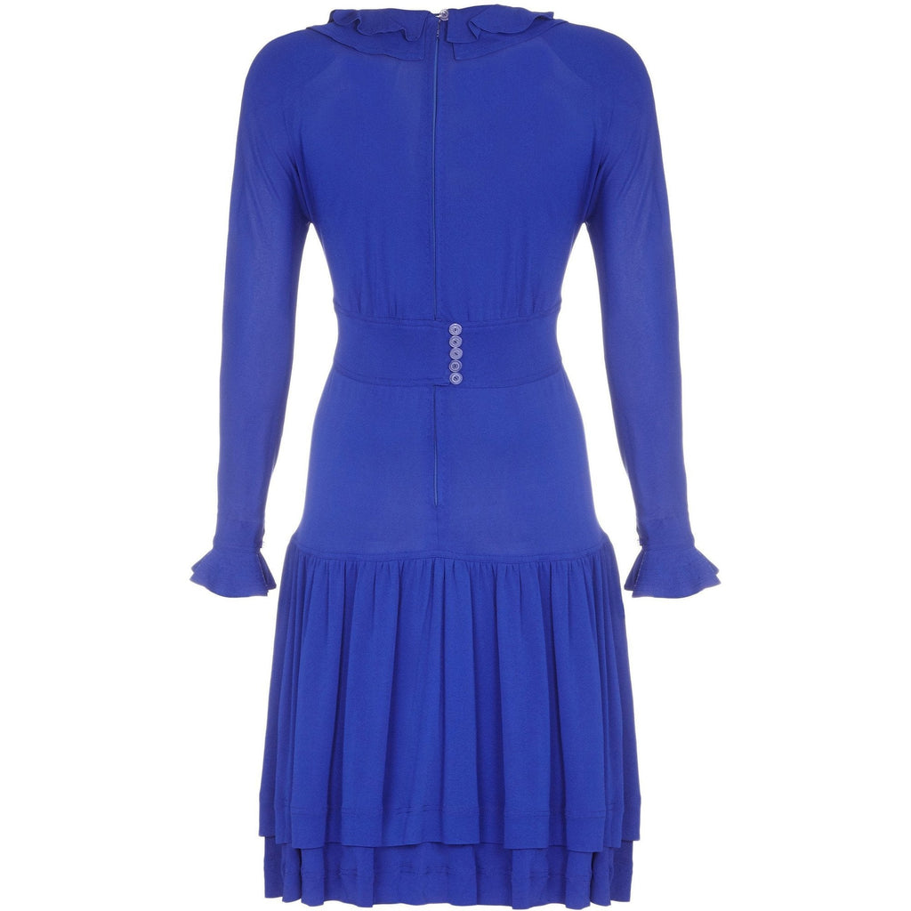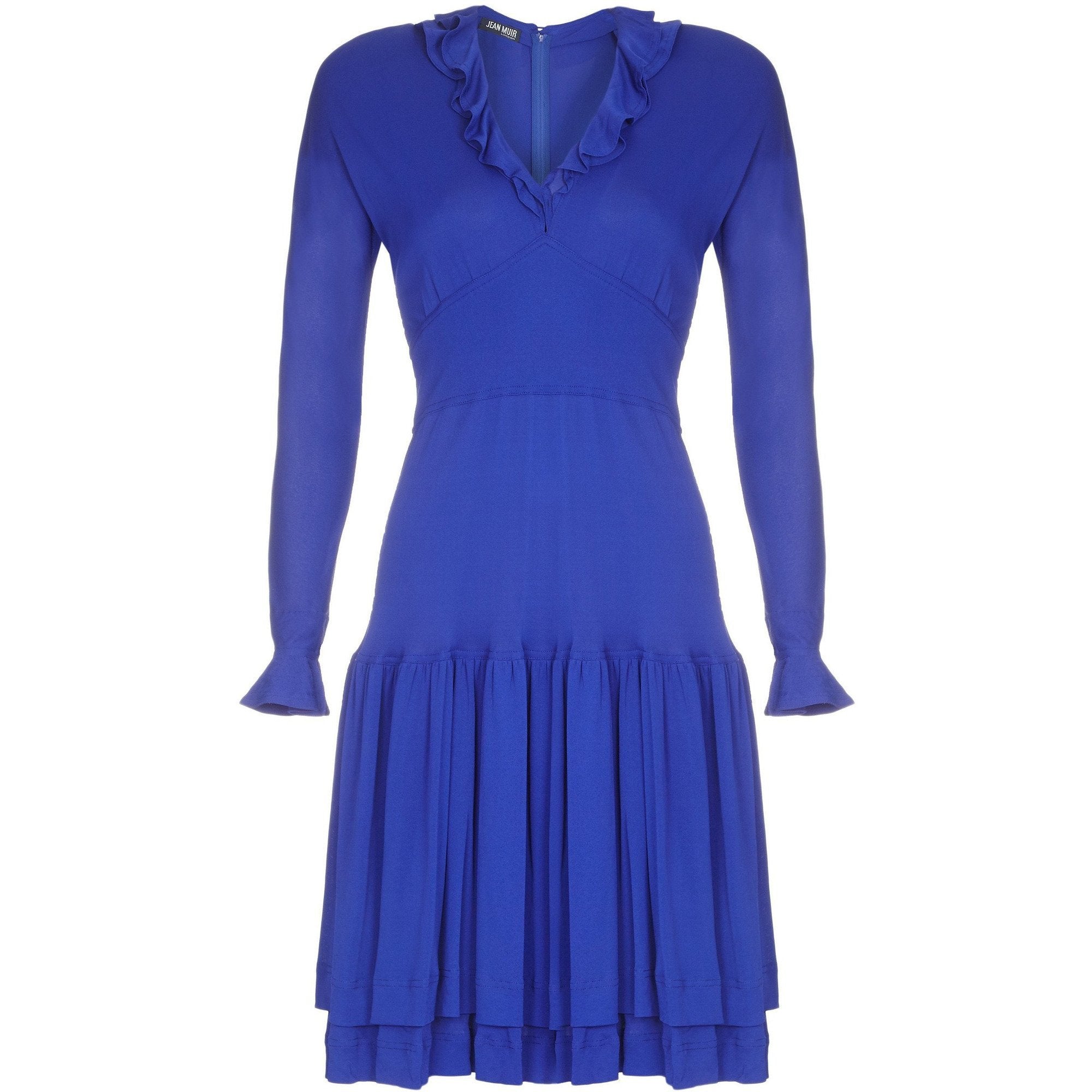 Fantastic vintage 70s viscose jersey dress from iconic British designer Jean Muir. This piece features a V neckline with ruffle, tiered skirt and long sleeves with flared cuff. In a deep royal blue with a hint of purple there is a pretty button and loop detail at the back of the waistband and padded shoulders to give some structure. It fastens at the back with a zip and is in excellent condition with no flaws to mention.
