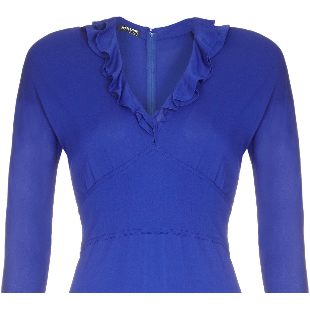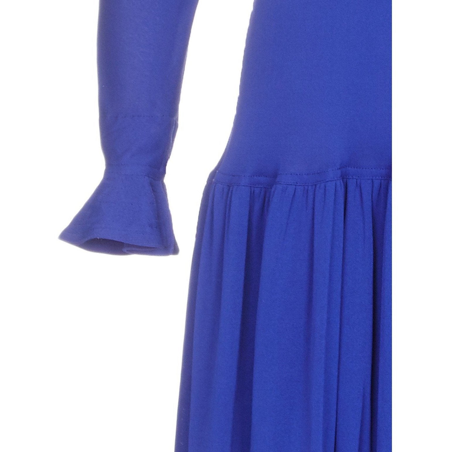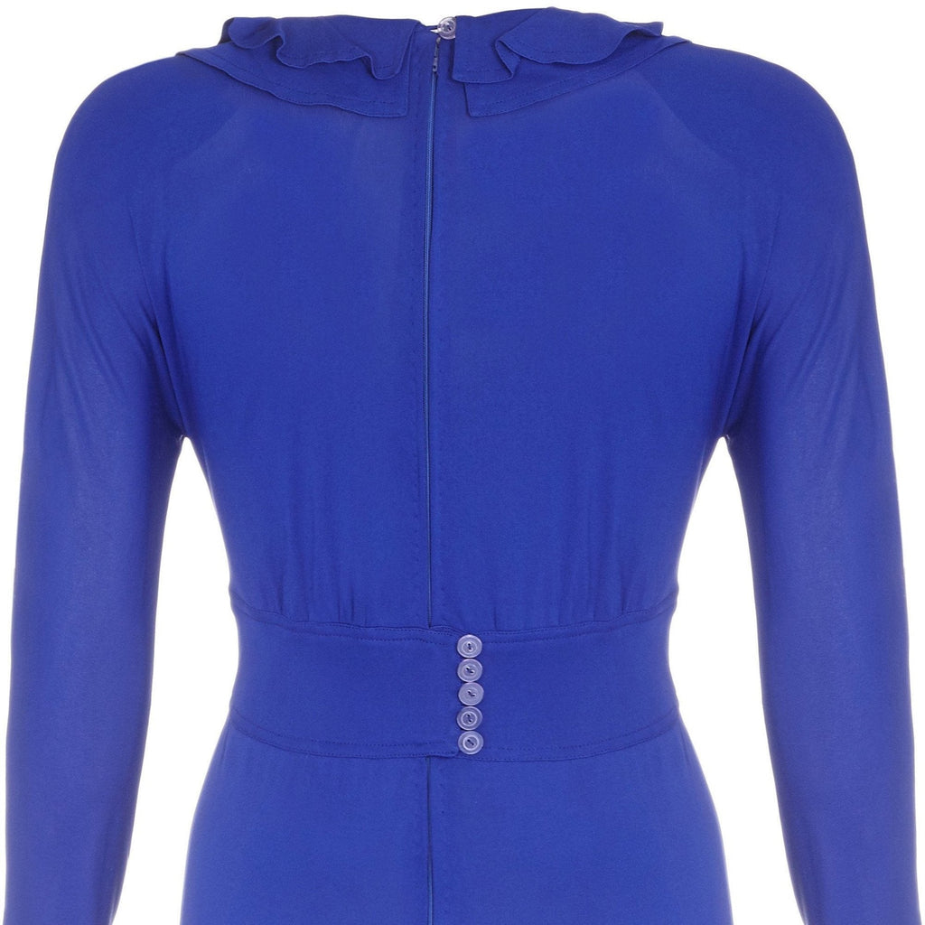 Fantastic vintage 70s viscose jersey dress from iconic British designer Jean Muir. This piece features a V neckline with ruffle, tiered skirt and long sleeves with flared cuff. In a deep royal blue with a hint of purple there is a pretty button and loop detail at the back of the waistband and padded shoulders to give some structure. It fastens at the back with a zip and is in excellent condition with no flaws to mention.
