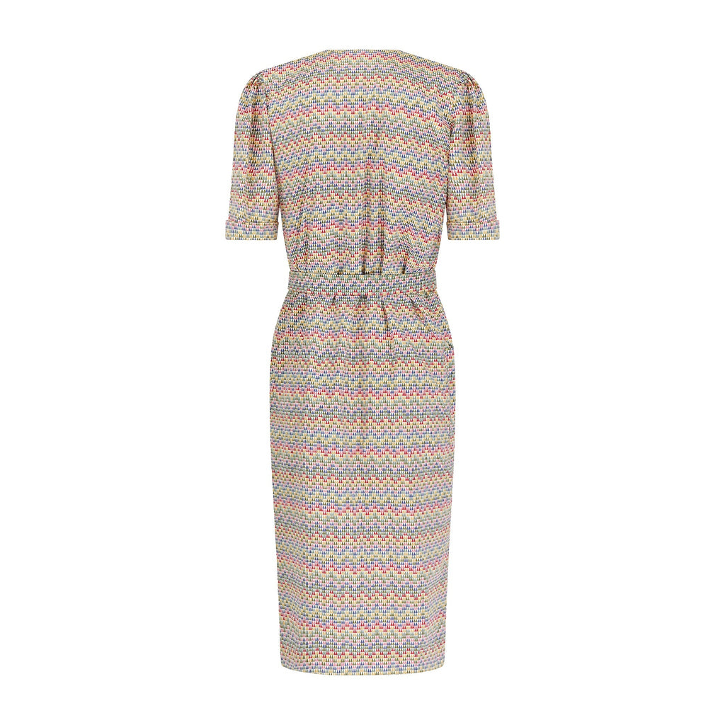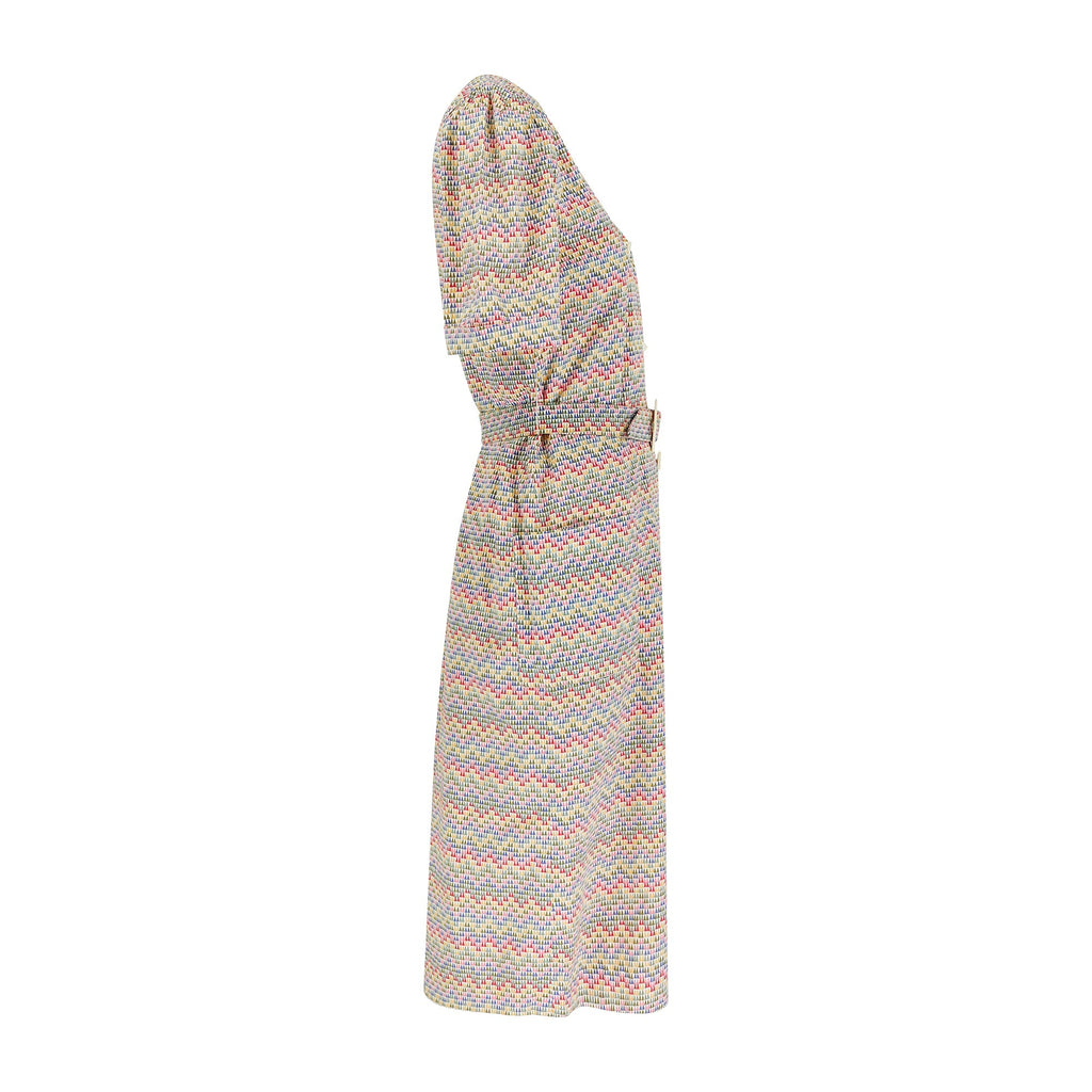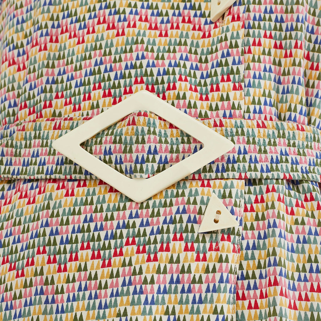 This unusual dress was designed by iconic London department store Liberty during the early 1970s. Tailored from the brand’s signature Tana Lawn soft cotton, it is printed with a repetitive print of tiny Isosceles triangles in rainbow hues. It has an asymmetric neckline and fastens down the front with five playful triangular buttons made from cream plastic. The waist belt is made from coordinating fabric and is finished with a diamond-shaped cream plastic buckle. The whole style of the dress borrows from the late art deco aesthetic which was very in vogue at the time. The sleeves are short and have turned-up cuffs. There are two patch pockets on the front of the skirt and the skirt has a slight slit at the front. The body of the dress is lined in a blush pink satin. In excellent condition with no flaws of any note. There is no size label so please check our measurements below as the cloth has no stretch. We estimate a good fit for sizes UK 10-12 or US 6.
