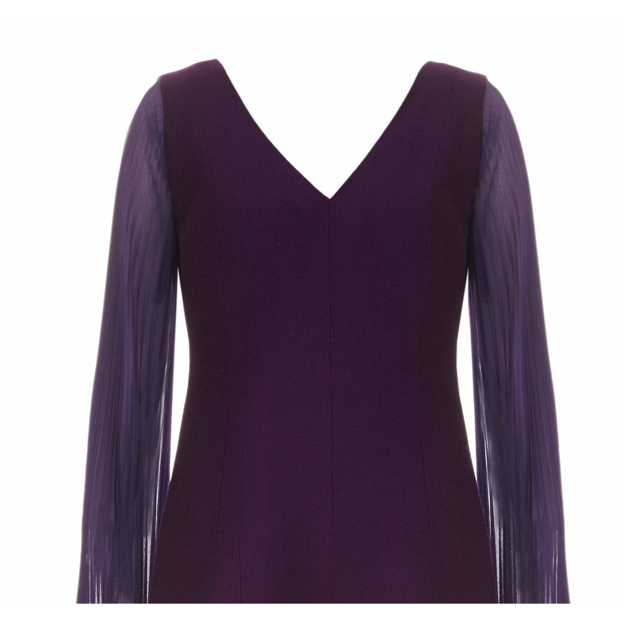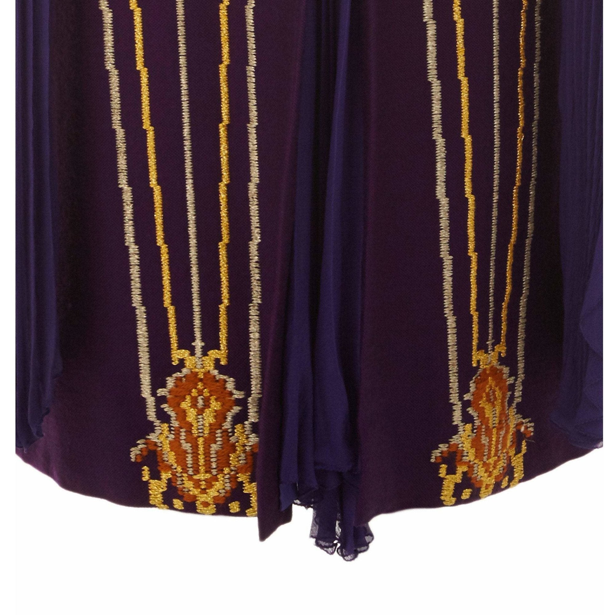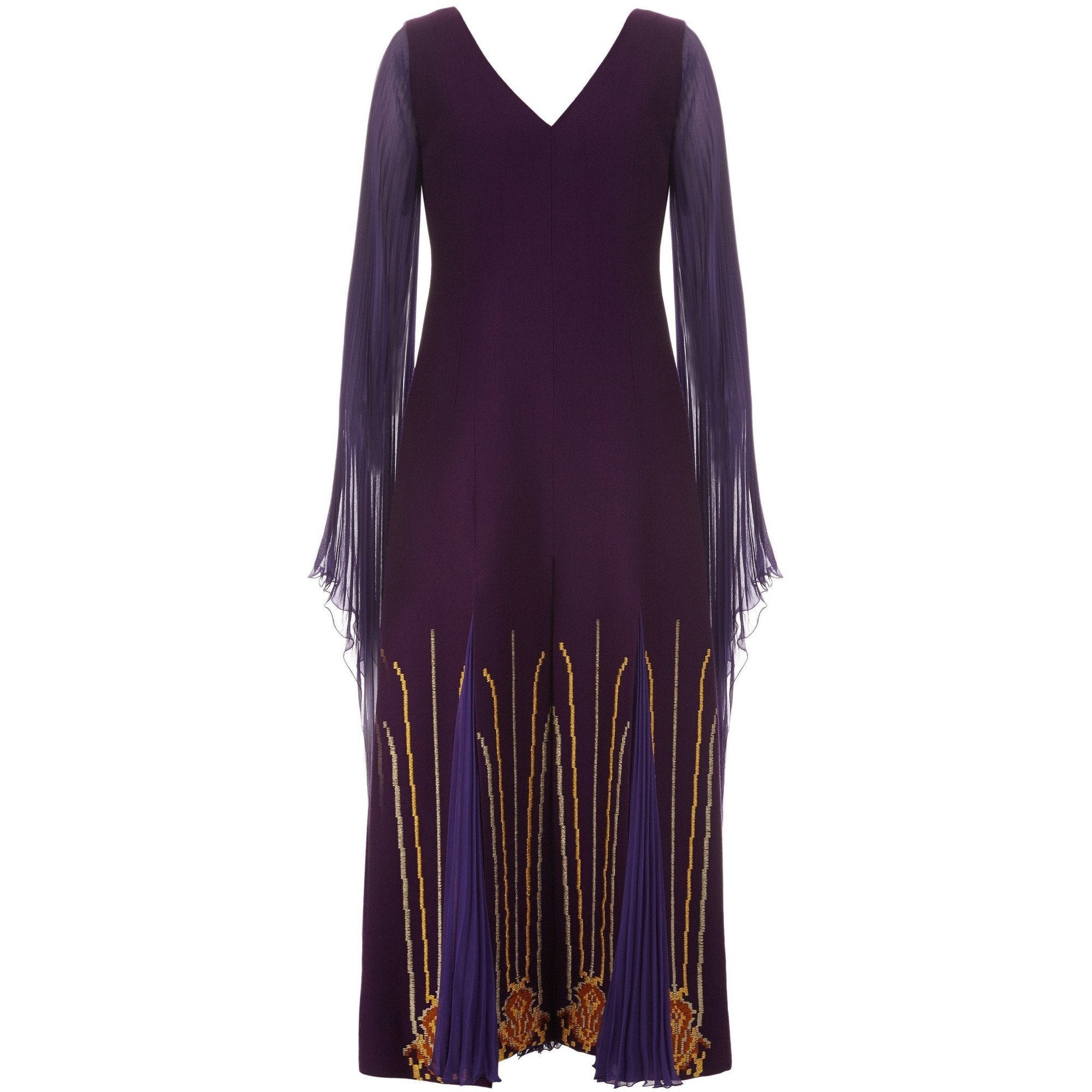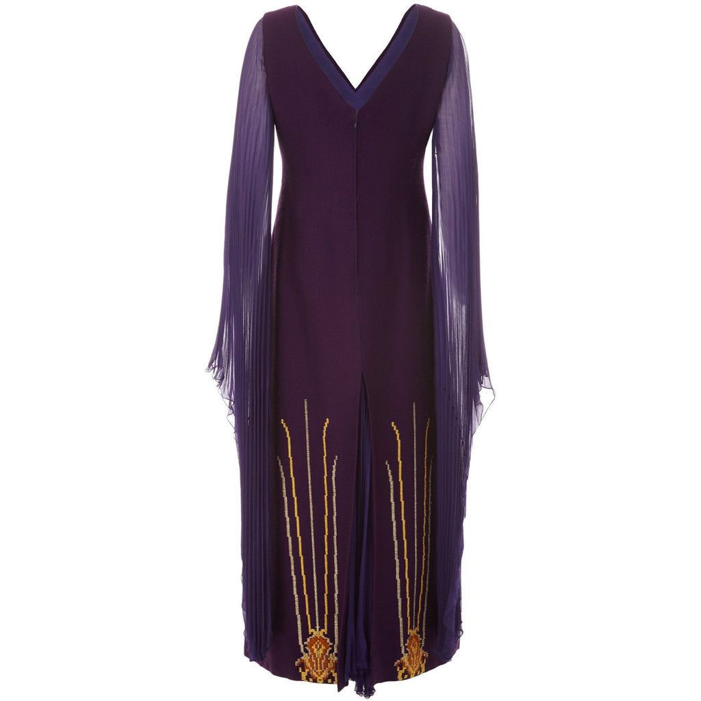 This extraordinary 1970s full length purple wool couture dress is by Greek couture dress is by celebrated Greek designer Nikos-Takis and is of excellent quality. This unusual piece features stylised gold embroidery on the hem and sensational sheer pleated chiffon fluted sleeves which extend to the length of the dress. There are also pleated chiffon inserts in the skirt, 2 at the front and one at the back. There is a V neckline with princess seams on the bodice and 2 x large box pleats at the front of the skirt which descend from just below the hip. The dress is lined in a coordinating purple with a central zip to fasten at the reverse. A magical dress in excellent condition with no noticeable flaws, would best suit a US size 8-10, UK size 12-14