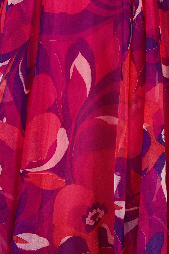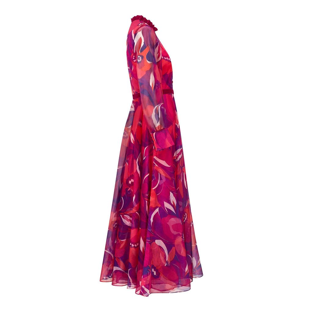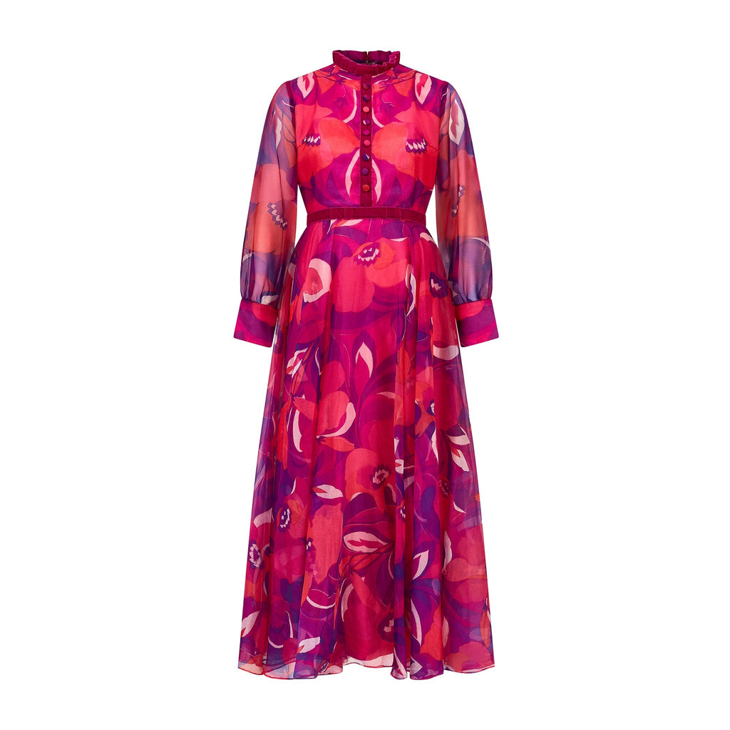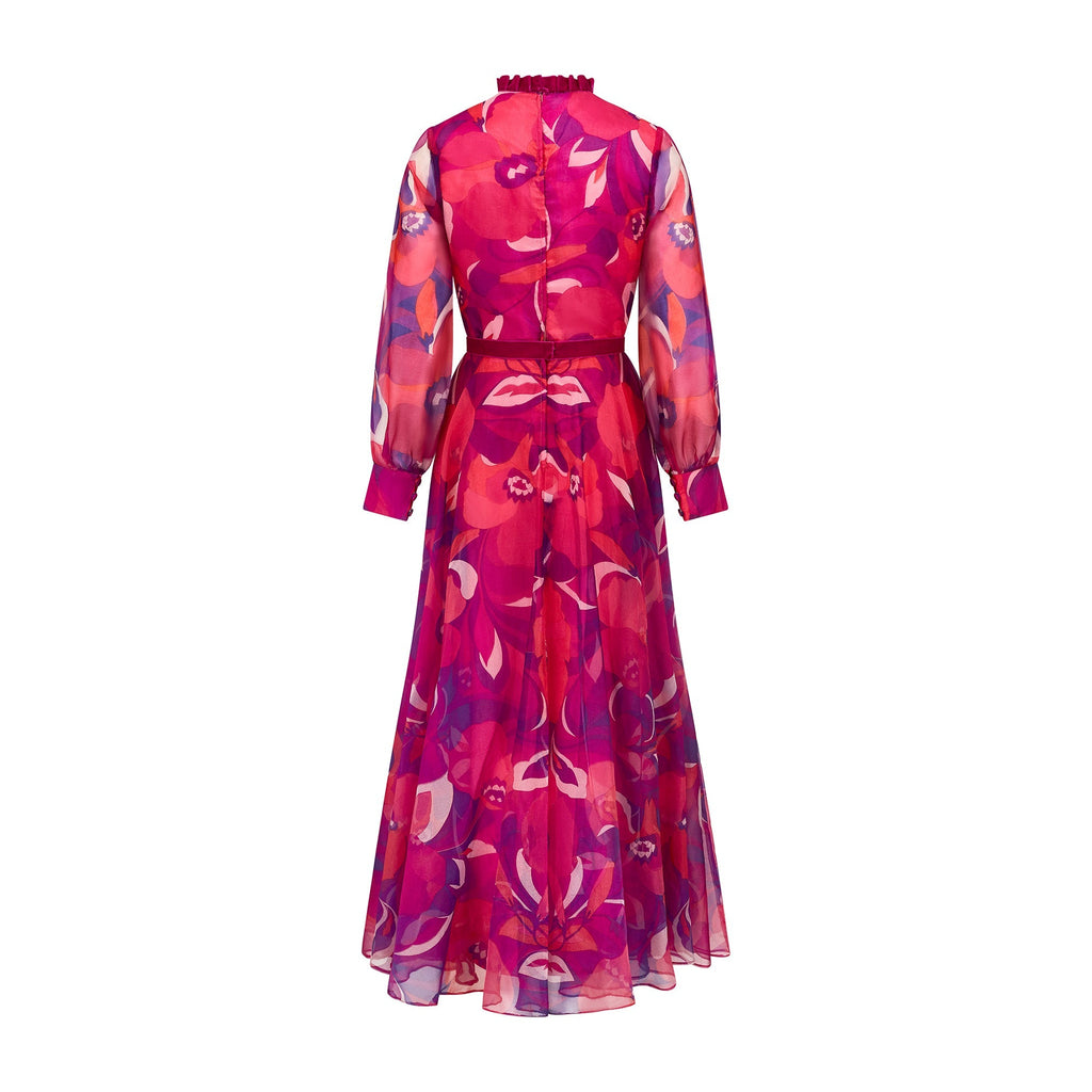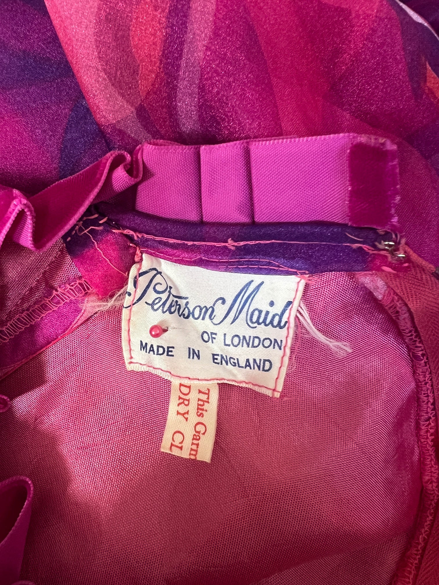 This vivacious, colourful dress was made in the 1970s by Peterson Maid. A floor-length piece, it is tailored to a classic 1970s silhouette with its flattering nipped-in waist and high-neckline. The eye-catching sheer crepe cloth is printed with bright pink and purple abstract florals. The sleeves are unlined and therefore sheer. They are cut in a bell-sleeve silhouette with wide cuffs that fasten with three fabric-covered buttons and fabric loops. The body and skirt are lined with candy pink satin. Typical of these 1970s Peterson Maid dresses, pretty detail is added in the form of magenta velvet ribbon that encircles the waist and adds a flamboyant ruffle at the neck. A strip of this ribbon also falls from the neck to the waist, topped by fabric-covered buttons, which gives the illusion of a button-up shirt front. This dress fastens at the back with a hidden zip and hook-and-eye clasp. The original label reads “Peterson Maid of London” and “Made in England” in navy font on white.
